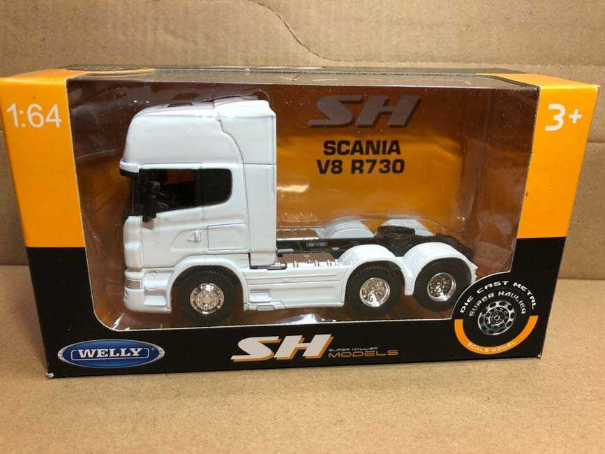 Cap tractor Scania V8 r730 6×4 alb Welly scara 1/64