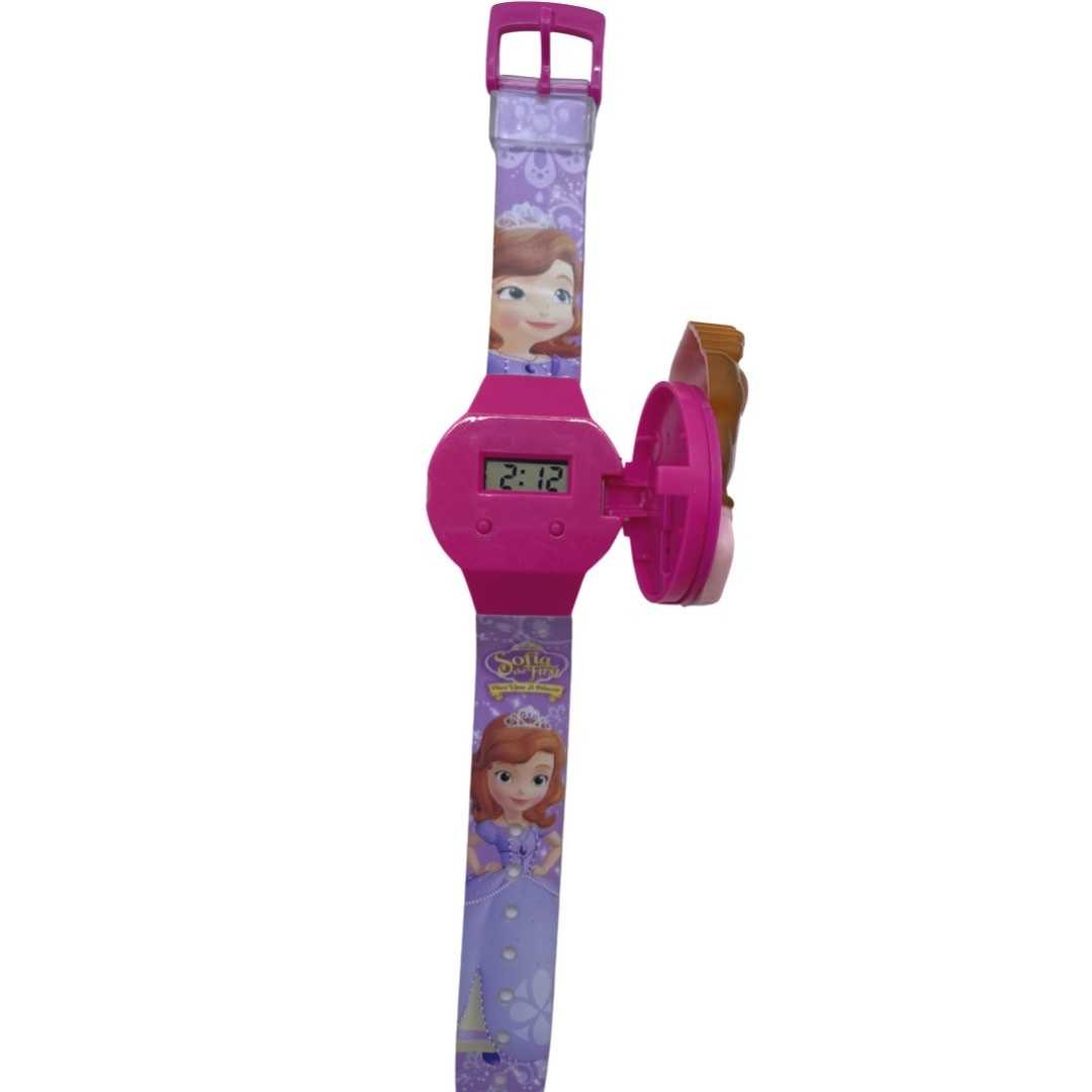 Ceas electronic printesa Sofia Pentru copii. Ceasul este electronic functioneaza cu baterie care este inclusa in el. In set se gasesc si doua capace de schimb si un accesoriu. Recomandat copiilor peste 3 ani.