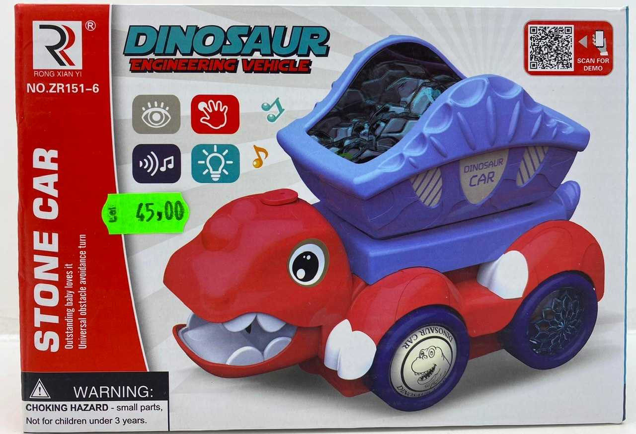 Masinuta electrica sub forma de dinozaur care transporta o incarcatura deasupra. Masinuta functioneaza cu 3 baterii AA care nu sunt incluse in set. Cand este pornita, canta melodii, se aprind luminite cu led si incarcatura de deasupra de misca. Este realizata din materiale plastice rezistente la impact.
