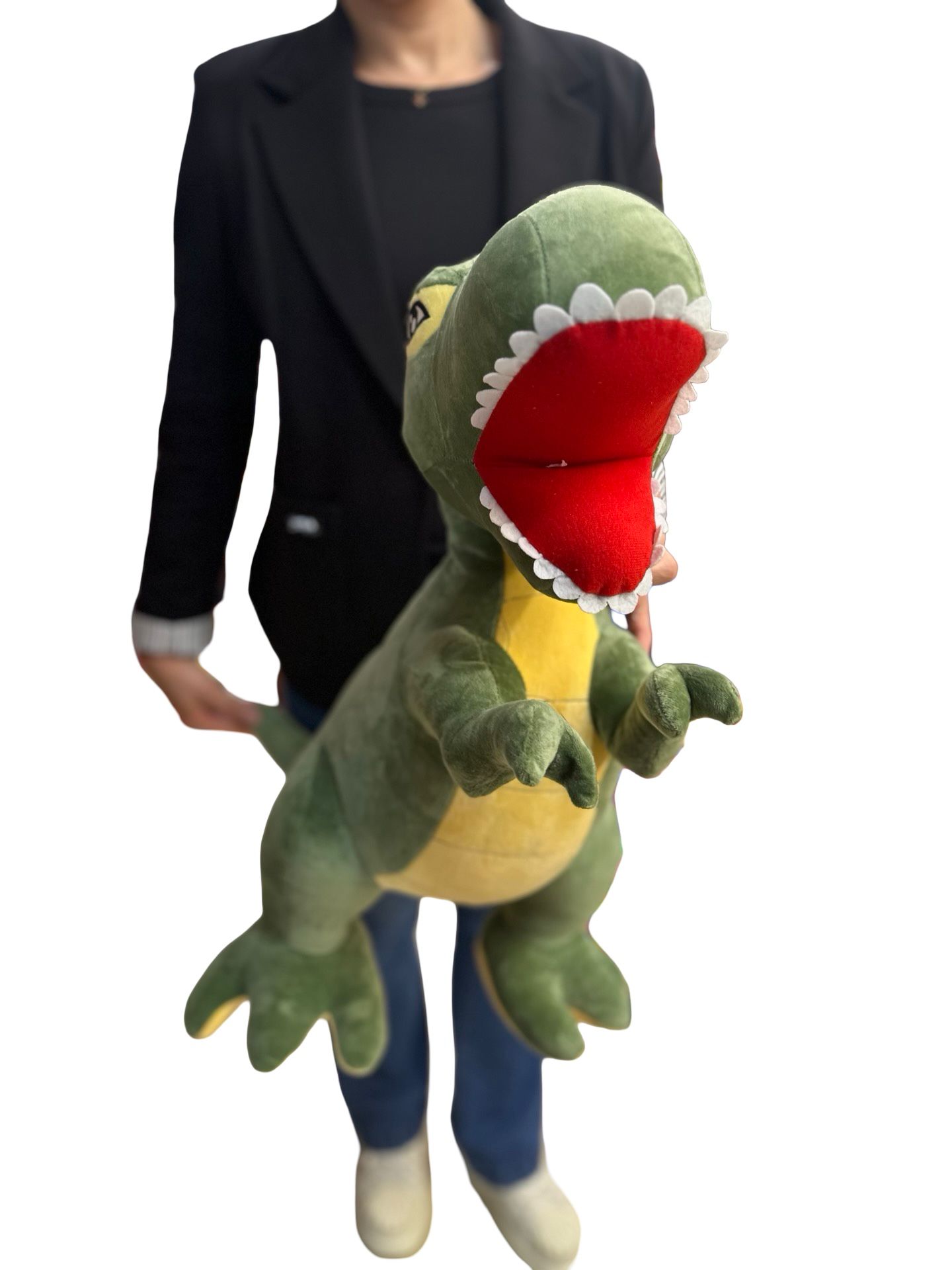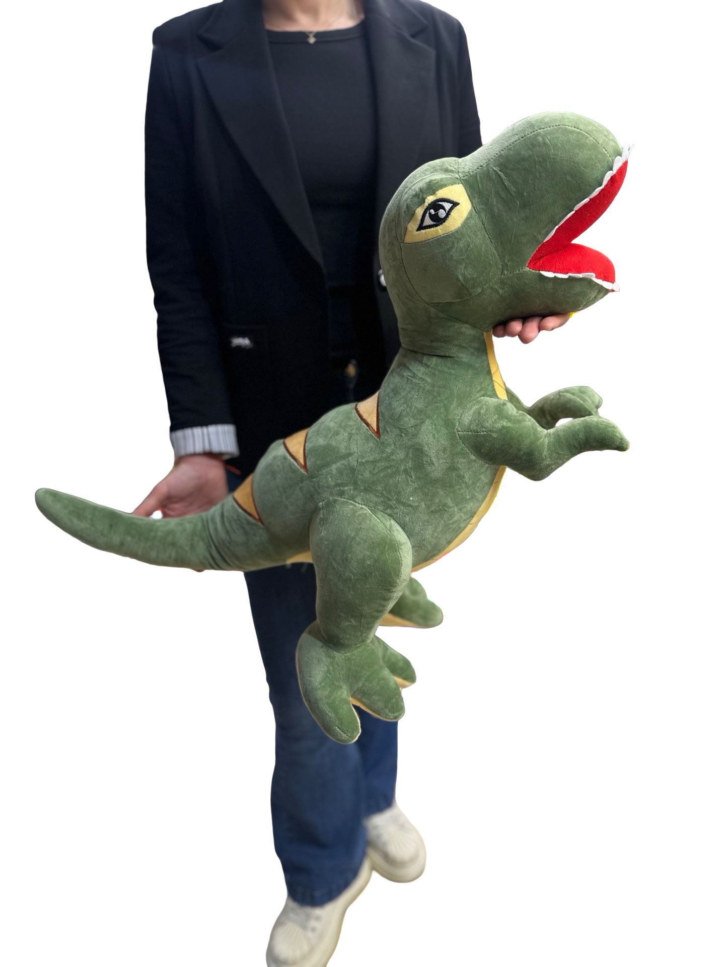 Dinozaur verde din plus cu dimensiunea de 90 cm. este umplut cu puf siliconat antialergic iar la exterior este realizat din plus scurt ecologic si placut la atingere. Este usor si poate fi folosit de catre copii la joaca cu usurinta.