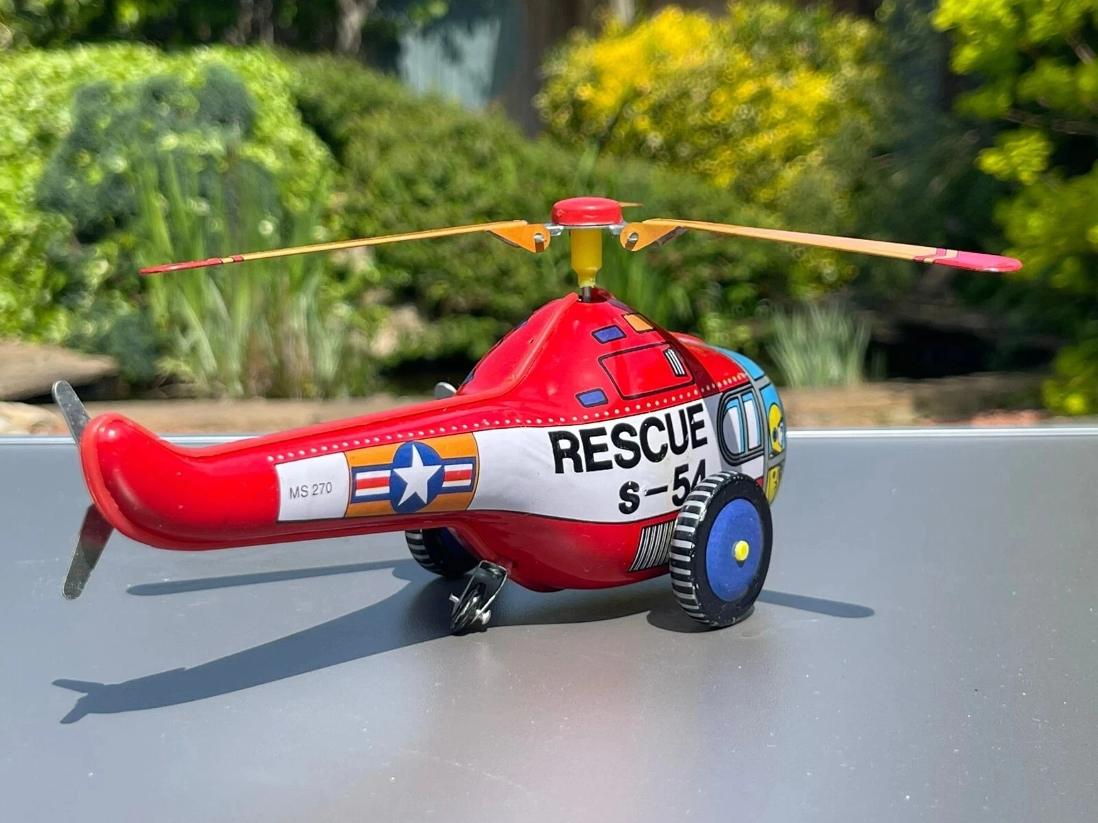 Acest elicopter de salvare (model Rescue S-54) este o jucarie mecanica clasica realizata din tabla litografiata ce emana farmecul obiectelor de aviatie din epoca de aur. Este o piesa deosebita atat pentru colectionari cat si ca element de decor intr-un spatiu cu tematica retro.