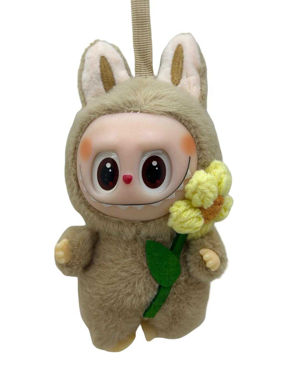 Labubu apare intr-o versiune adorabila, imbracat intr-un costum pufos, tinand in mana o floare galbena tricotata. Zambetul sau jucaus si ochii mari expresivi aduc un plus de veselie oricarei colectii. Figurina masoara aproximativ 15 cm si este prevazuta cu panglica pentru agatare. Perfecta pentru decor, cadou sau ca piesa de colectie.