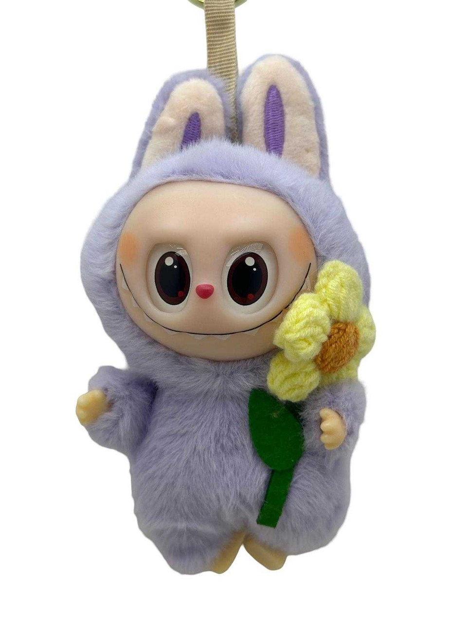Labubu apare intr-o versiune adorabila, imbracat intr-un costum pufos, tinand in mana o floare galbena tricotata. Zambetul sau jucaus si ochii mari expresivi aduc un plus de veselie oricarei colectii. Figurina masoara aproximativ 15 cm si este prevazuta cu panglica pentru agatare. Perfecta pentru decor, cadou sau ca piesa de colectie.