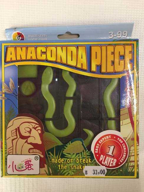 Joc de logica care are drept obiectiv reconstruirea sarpelui. Sunt incluse 100 de cartonase cu provocari de la incepator la expert. Jucatorul trage un cartonas, aseaza piesele conform acestuia si apoi trebuie sa rezolve puzzle-ul astfel incat sa recreeze anaconda. Jocul contine 100 de provocari pe cinci nivele, solutiile, tabla de joc tu un loc foarte convenabil pentru depozitare, opt piese de puzzle cu doua fete. Recomandat pentru jucatori cu varsta intre trei si 99 ani. Material plastic si carton. Dimensiuni cutie 15 cm / 15 cm