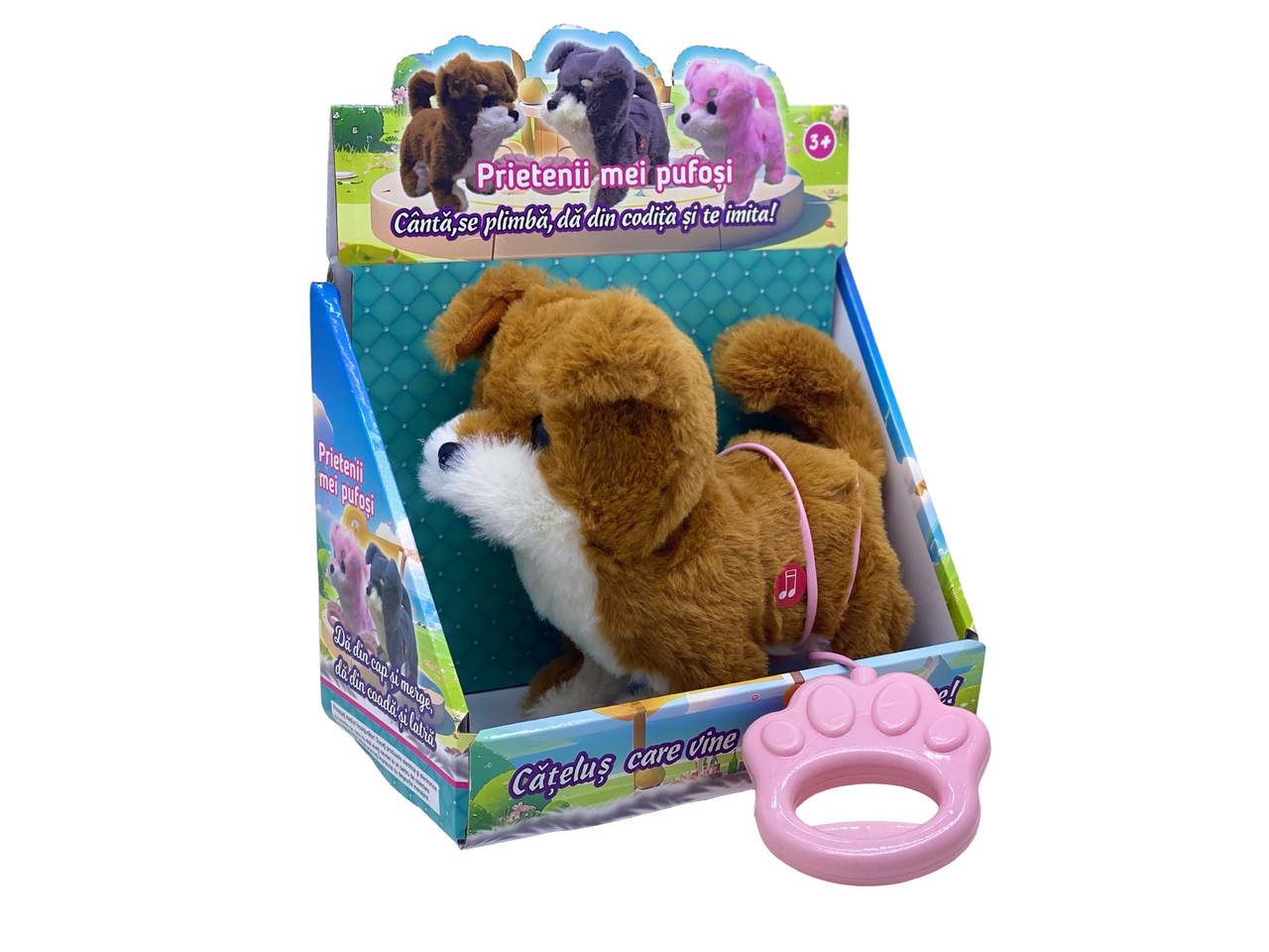 Catel din plus mergator . Catelul din plus mergator este jucaria interactiva perfecta pentru copilul tau , odata ce ii apesi butonul ii v a atrage atentia sigur prin Miscarile de dans prin faptul ca da din coada cand merge si prin functia de imitare catelul inregistreaza si reda sunetele din jurul sau. Functioneaza cu 3 baterii de tip AAA 1.5 V . Functii merge , da din codita , inregistreaza si latra . Este reocomandat copiilor cu varsta de peste 3 ani .