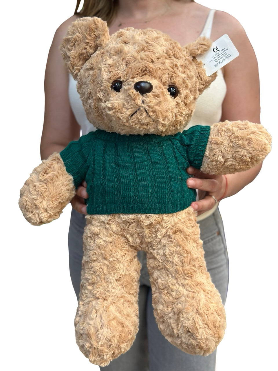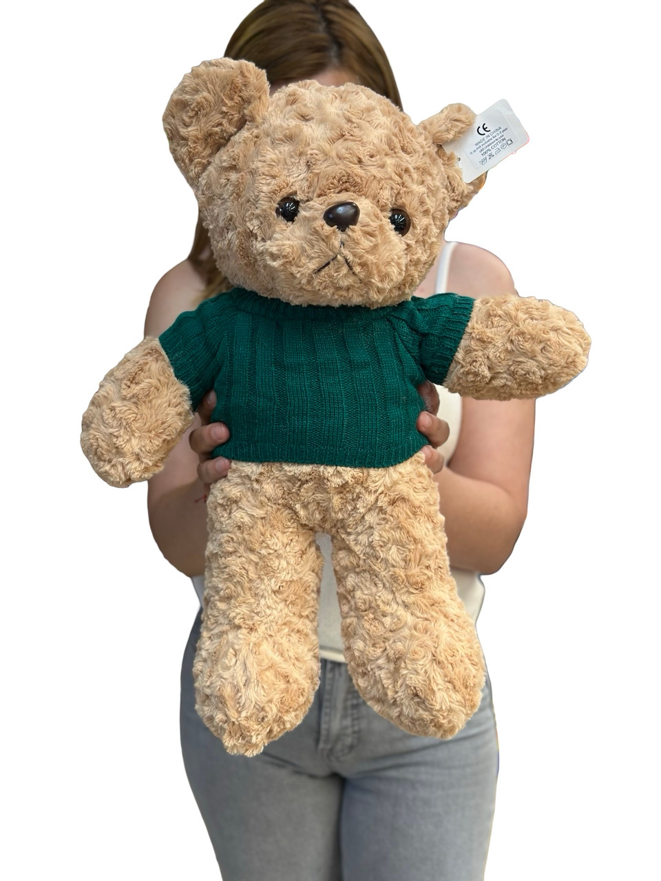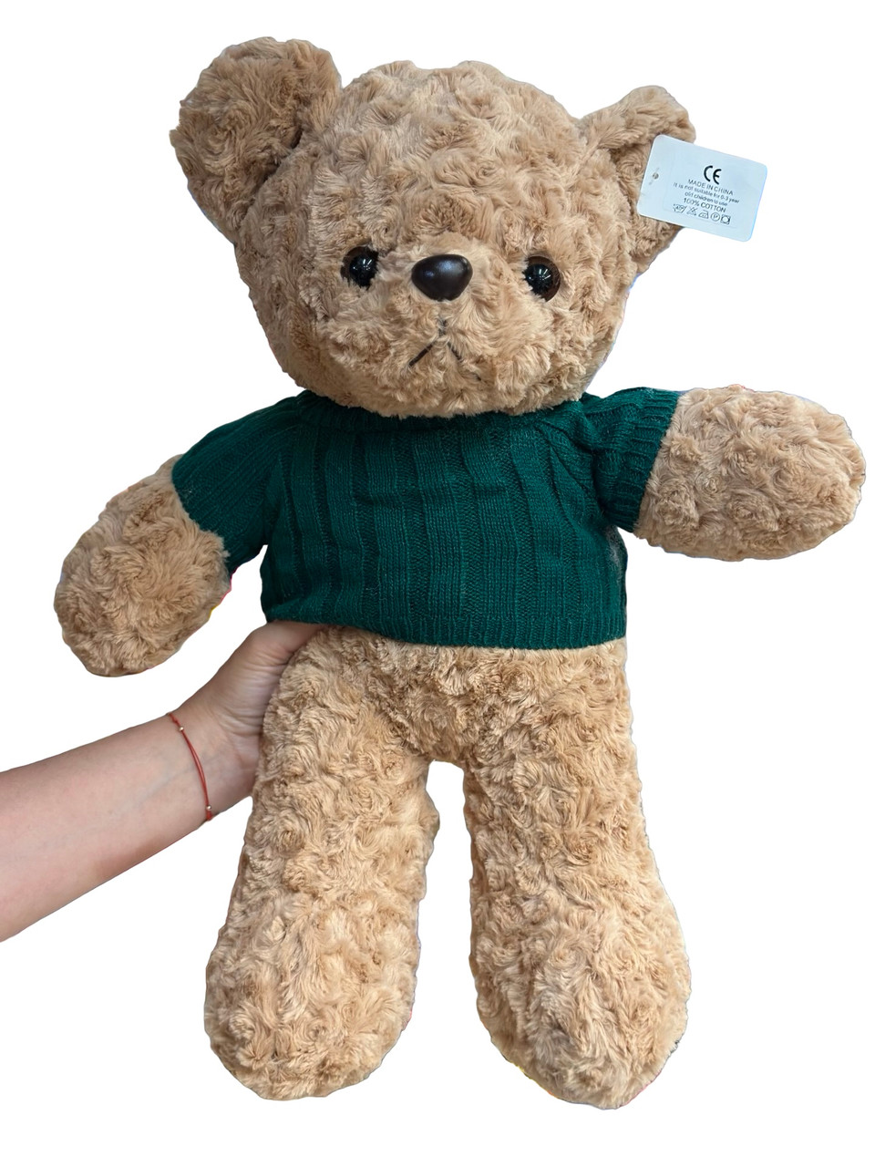 Jucarie de plus ursulet peticel maro cu hanorac verde. Este umplut cu puf siliconat antislergic iar blanita are o textura foarte pufoasa. Se poate curata prin stergere cu o carpa umeda prin stergere. Dimensiune 50cm
