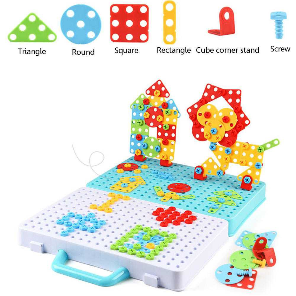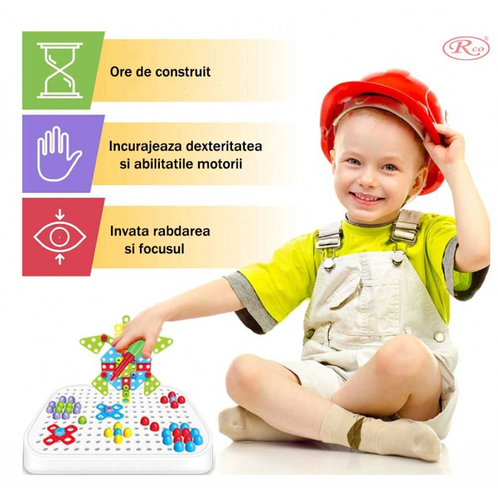Setul cu bormasina electrica si carcasa portabila este compus din 237 de piese puzzle in diverse culori (galben, verde, albastru, rosu) si forme diferite (patrat, triunghi, cerc si dreptunghi). Micutii viitori ingineri pot folosi bormasina electrica (butonul de pe maner avand dublu sens) si surubelnita manuala pentru a insuruba/desuruba intr-un timp foarte scurt placile pe grila de baza si pentru a construi cu usurinta mestesuguri 2D si 3D precum leu, camion, fluture, flori, pasare, elicopter, etc. asa cum este prezentat si in manualul de utilizare sau lasand imaginatia in mod provocator sa curga.