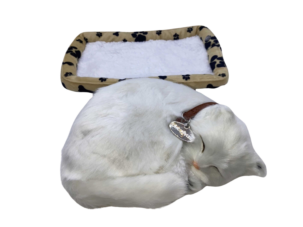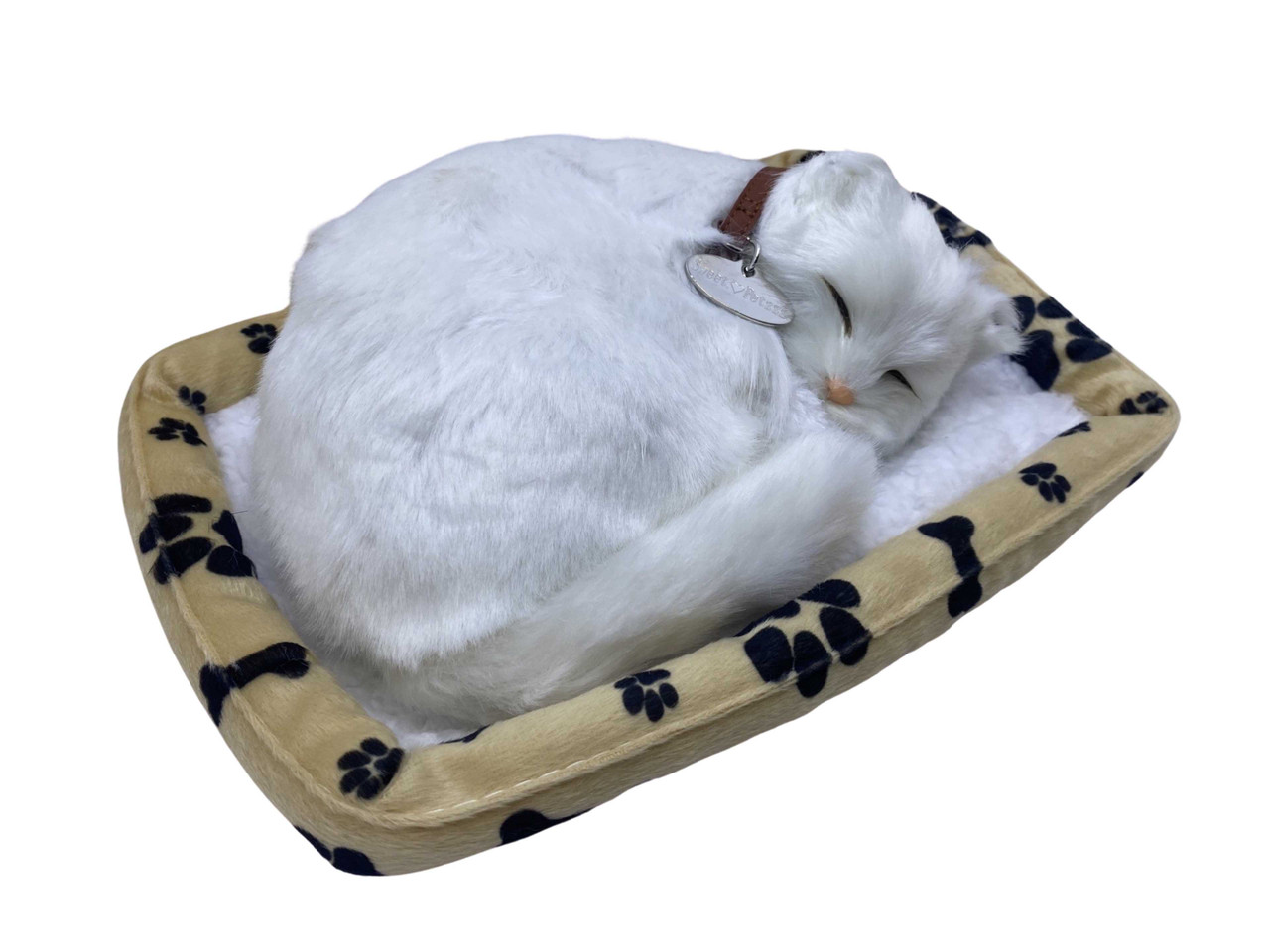Jucarie pisica alba care doarme pe un frumos pled din plus catifelat. In timpul somnului pisicuta misca din coada usor, in sus si in jos exact ca o pisica adevarata simuland miscarea de perfecta relaxare. Aceasta functioneaza cu 3 baterii de tip AA. Aceasta pisicuta este realizata din material plastic la interior unde se gaseste si mecanismul care actioneaza coada. La exterior are blanita din par sintetic pentru a parea cat mai realist iar la gat are un medalion. Dimensiune 20cm lungimea pisicutei si 24 cm lungime pled. Este recomandata copiilor peste trei ani.