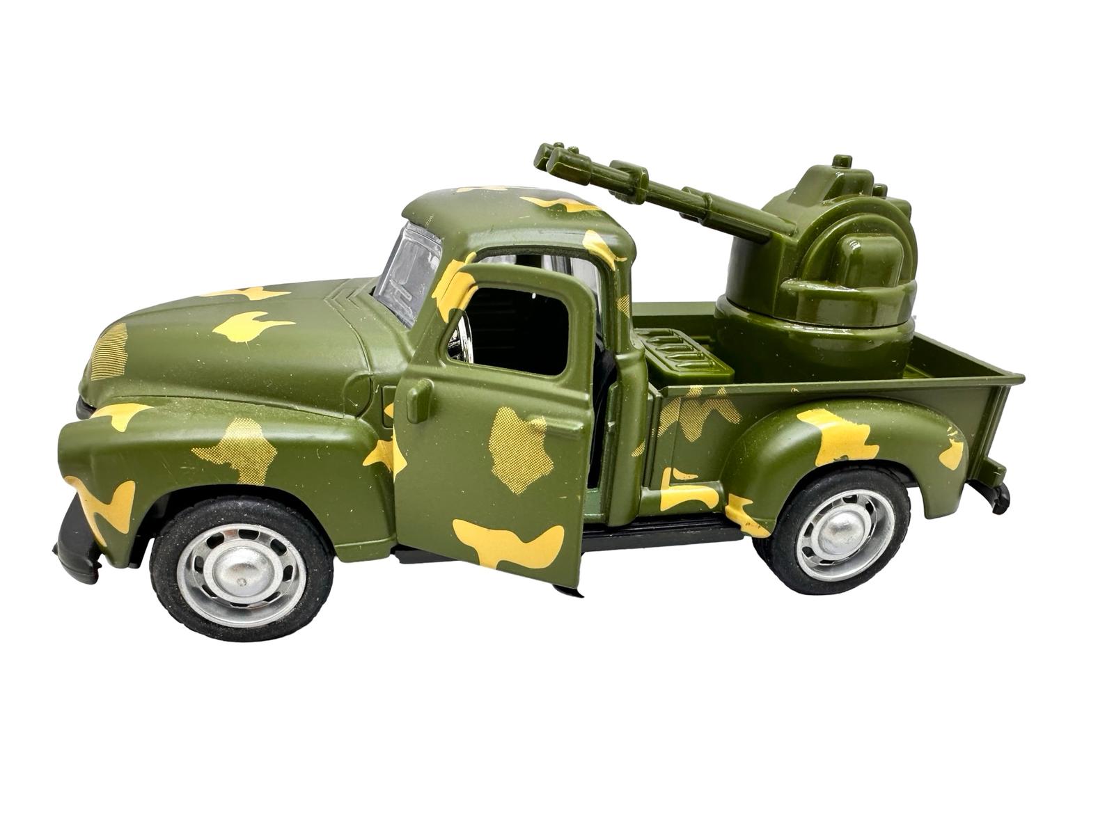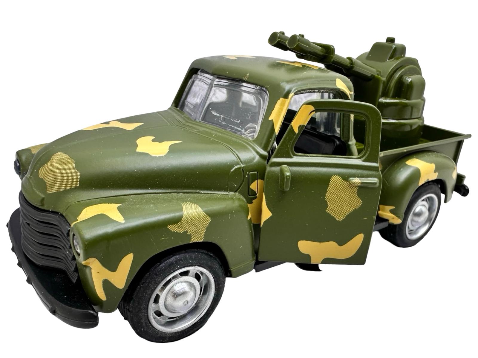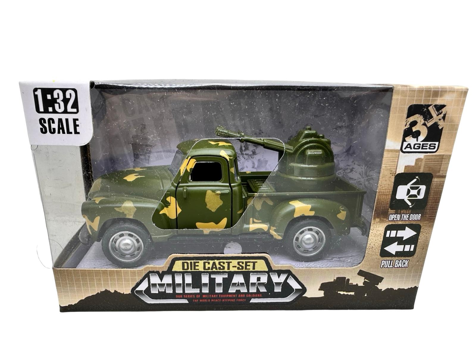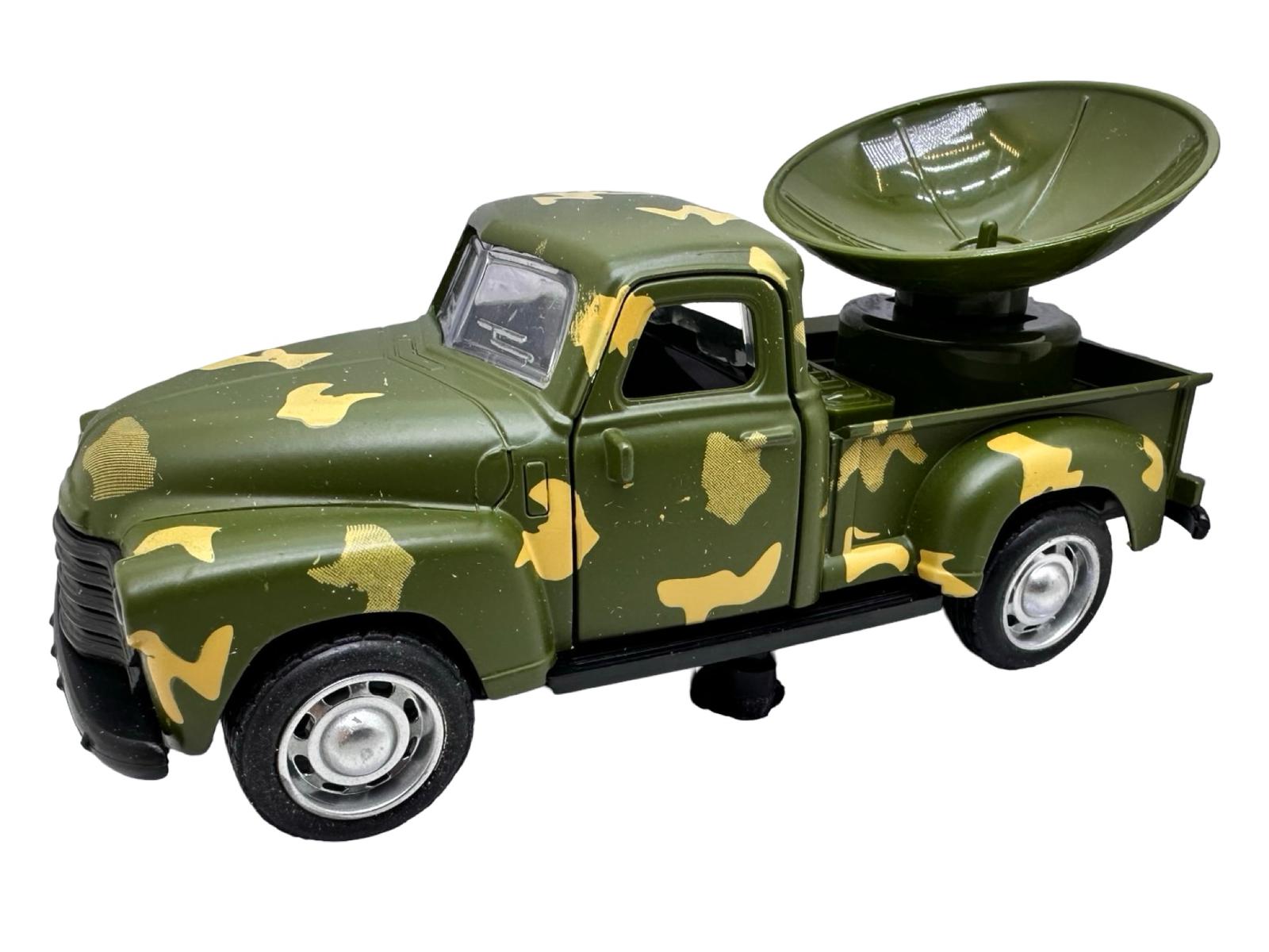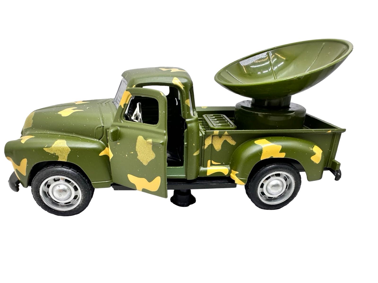 Masina Militara Die-Cast 1:32 Pickup Camuflaj cu tun sau radar, usi deschise si mecanism pull back. Model din metal si plastic pentru copii 3+. Ideal pentru joaca si colectie.