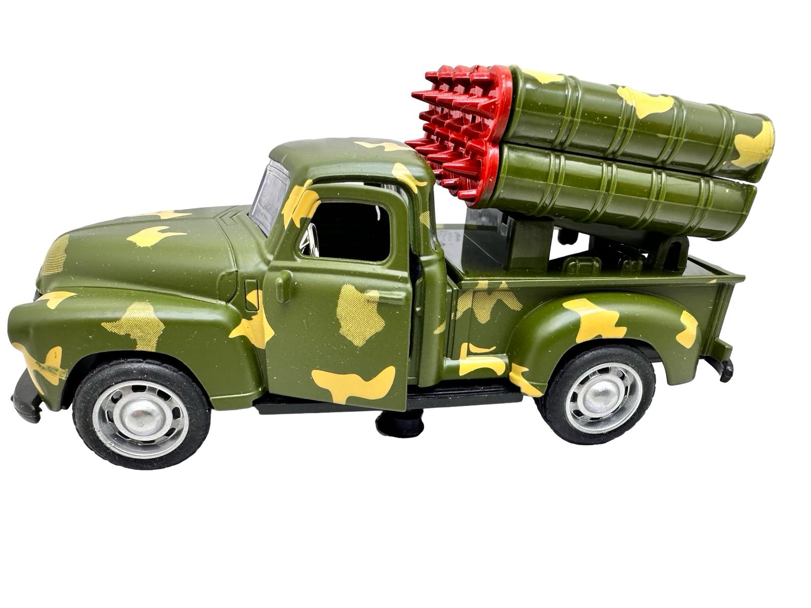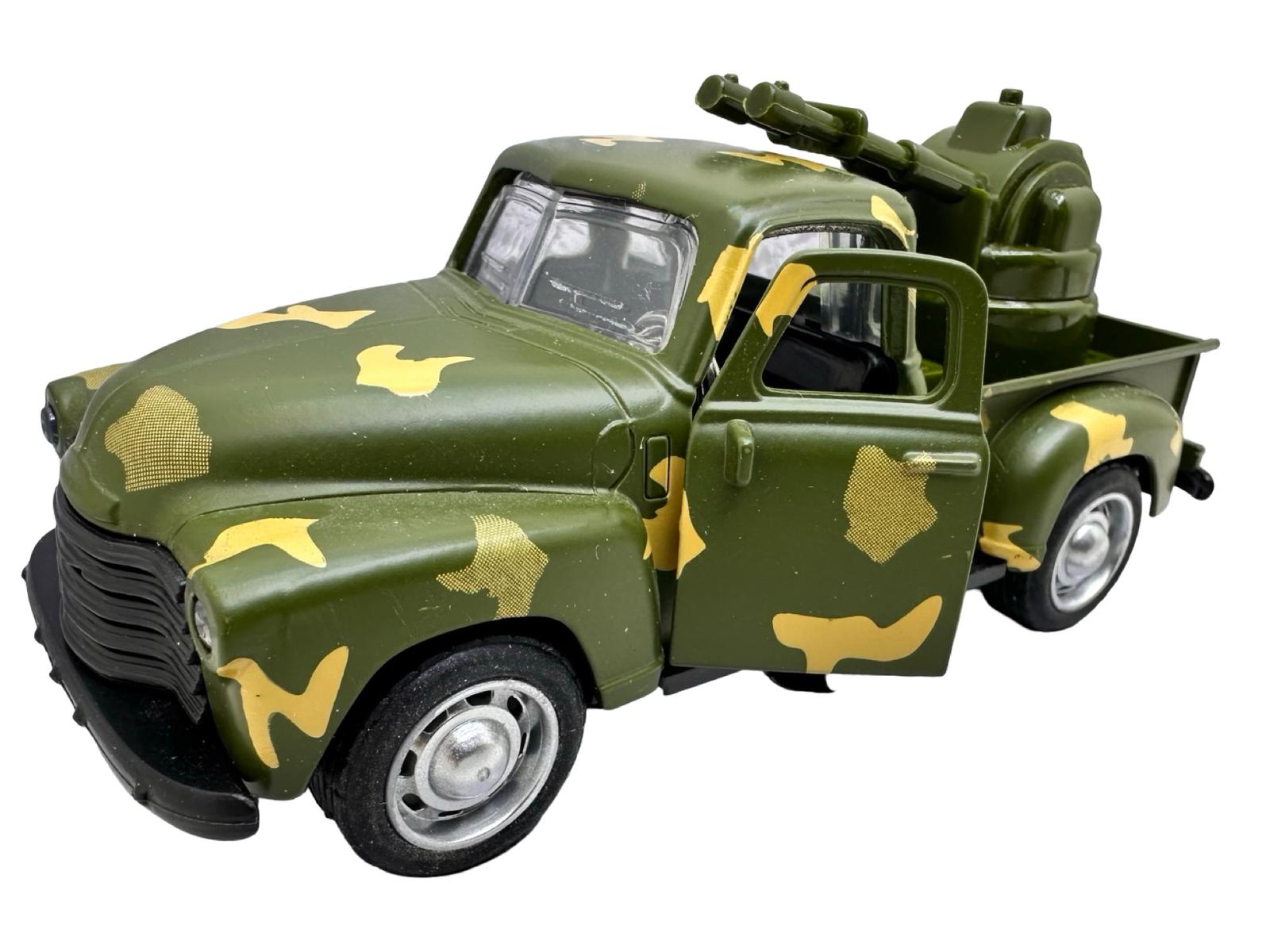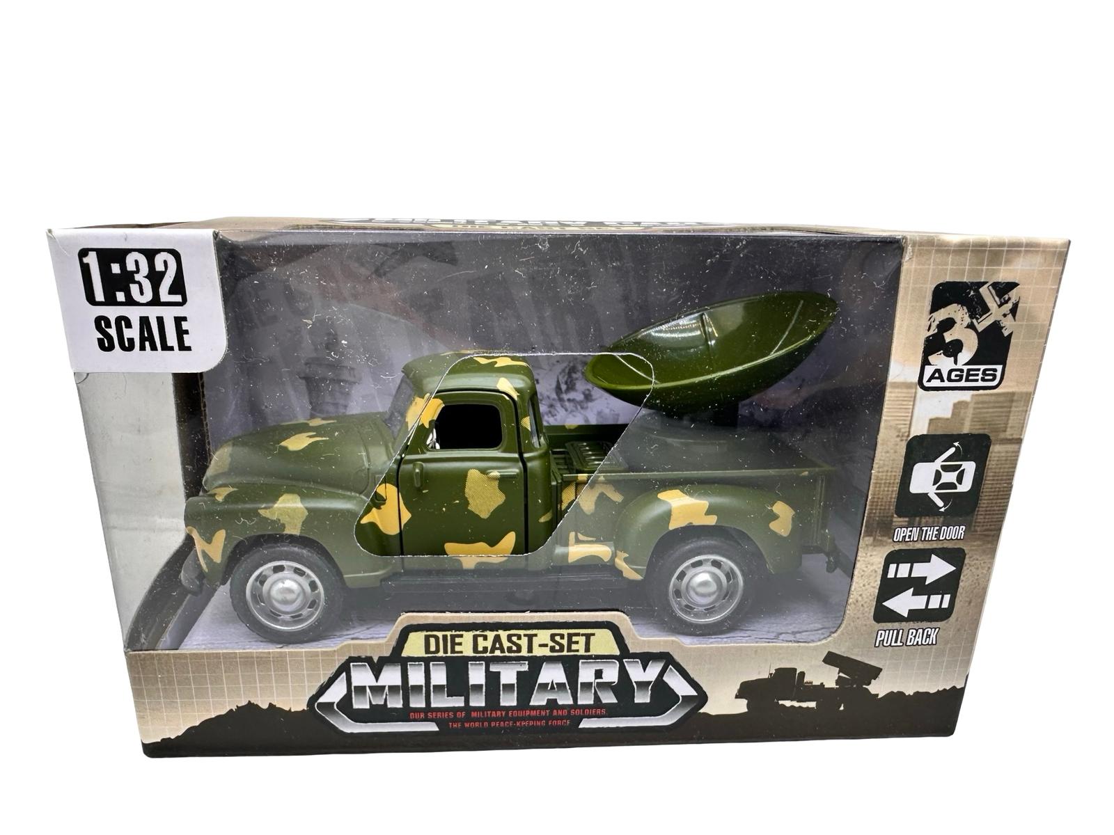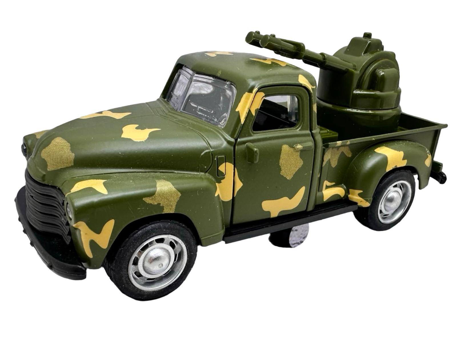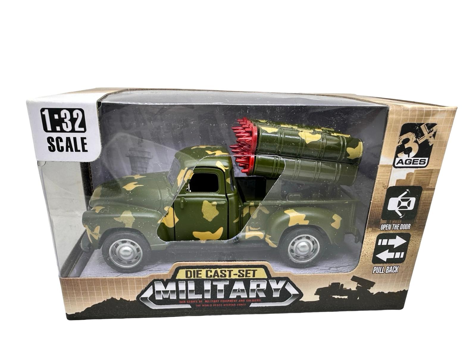 Masina Militara Die-Cast 1:32 Pickup Camuflaj cu tun sau radar, usi deschise si mecanism pull back. Model din metal si plastic pentru copii 3+. Ideal pentru joaca si colectie.