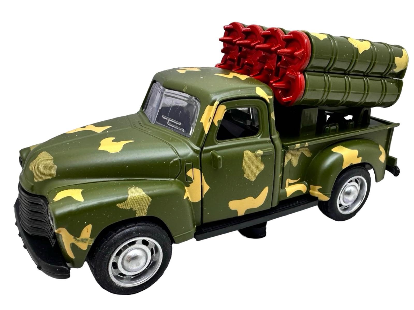Masina Militara Die-Cast 1:32 Pickup Camuflaj cu Tun si Radar este o jucarie robusta si realista, perfecta pentru copiii pasionati de vehicule militare si scenarii de actiune. Modelul este construit din metal si plastic de calitate, cu mecanism pull back si doua accesorii diferite: tun rotativ si antena radar.