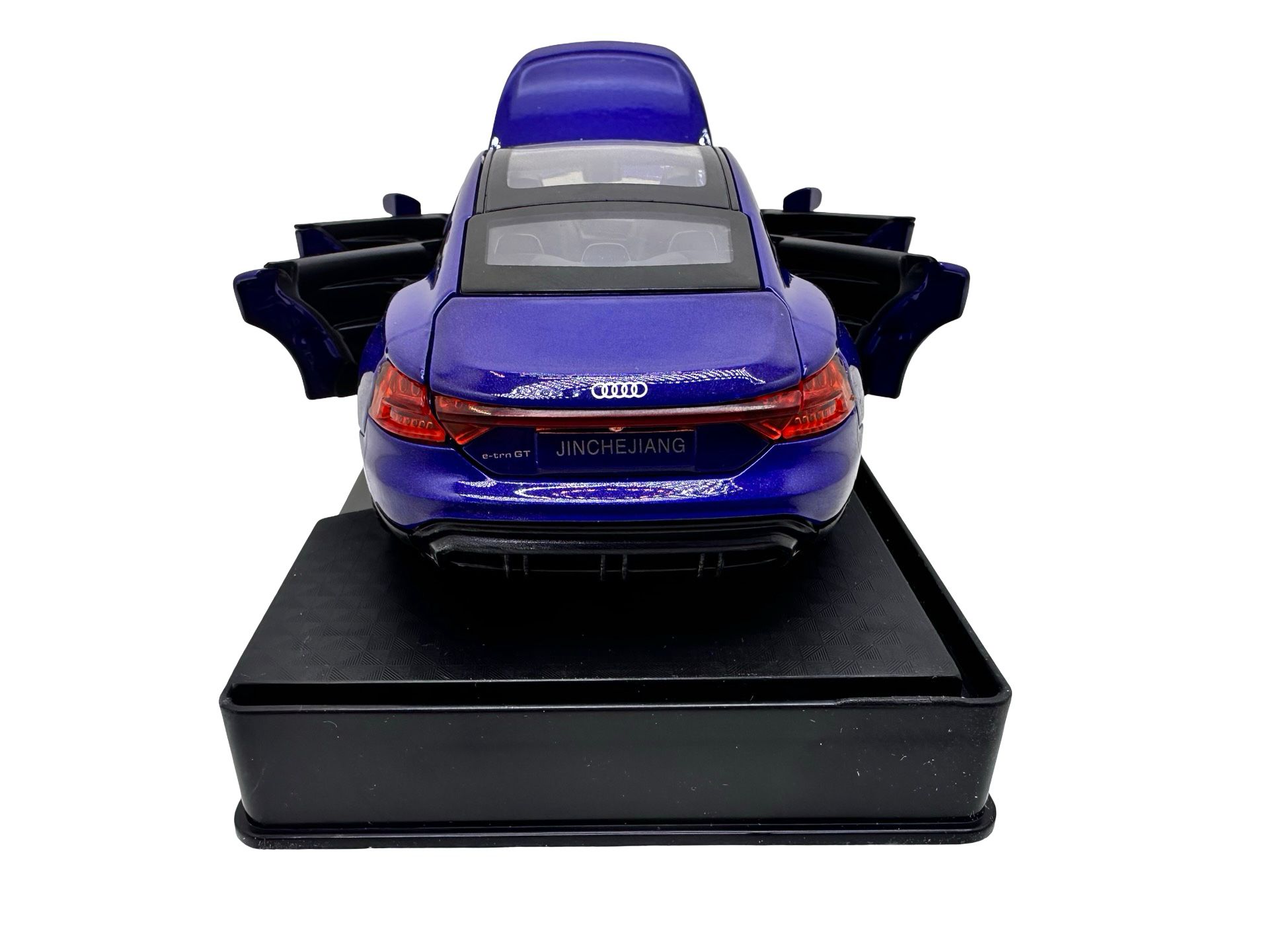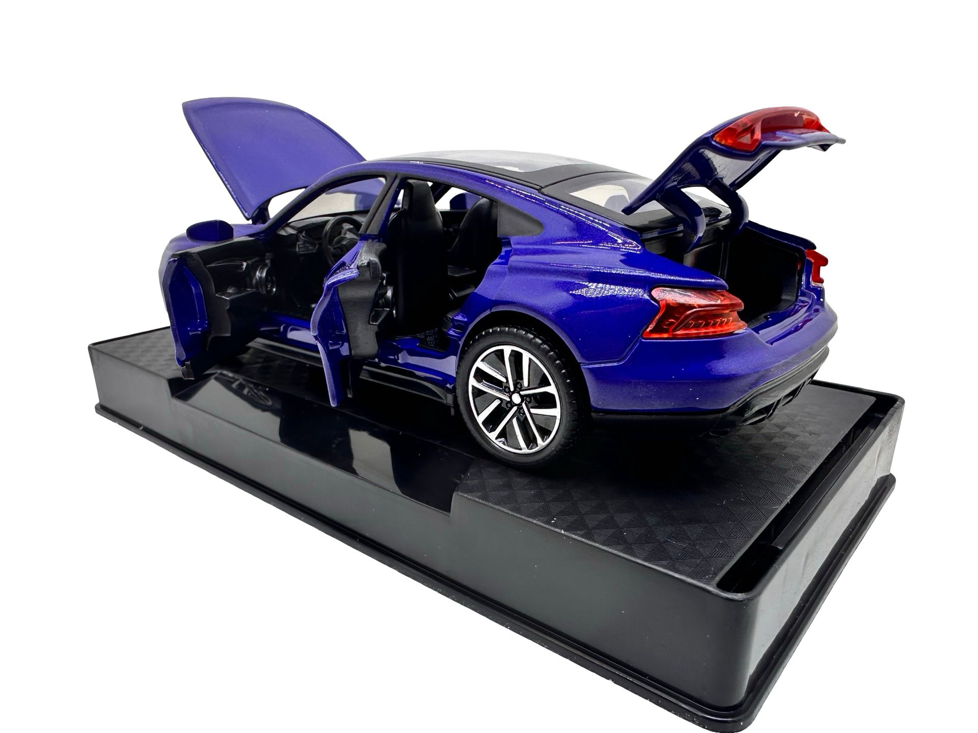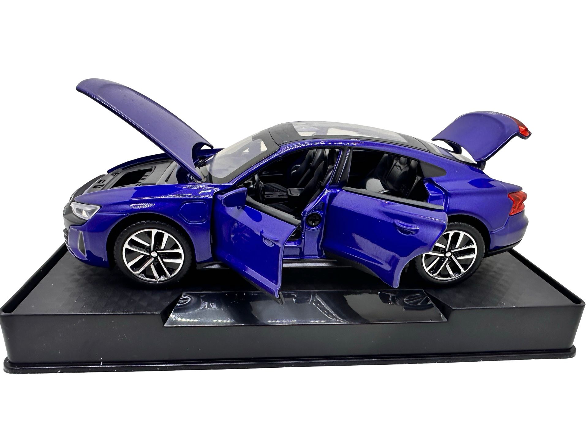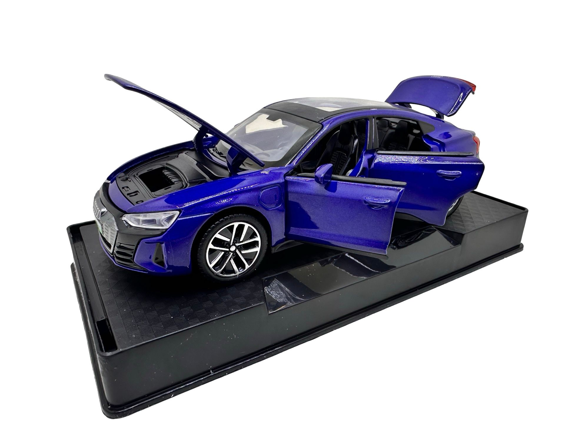 Macheta Audi e-tron GT albastru 1:32 metal die-cast lumini si sunete usi capota si portbagaj deschise