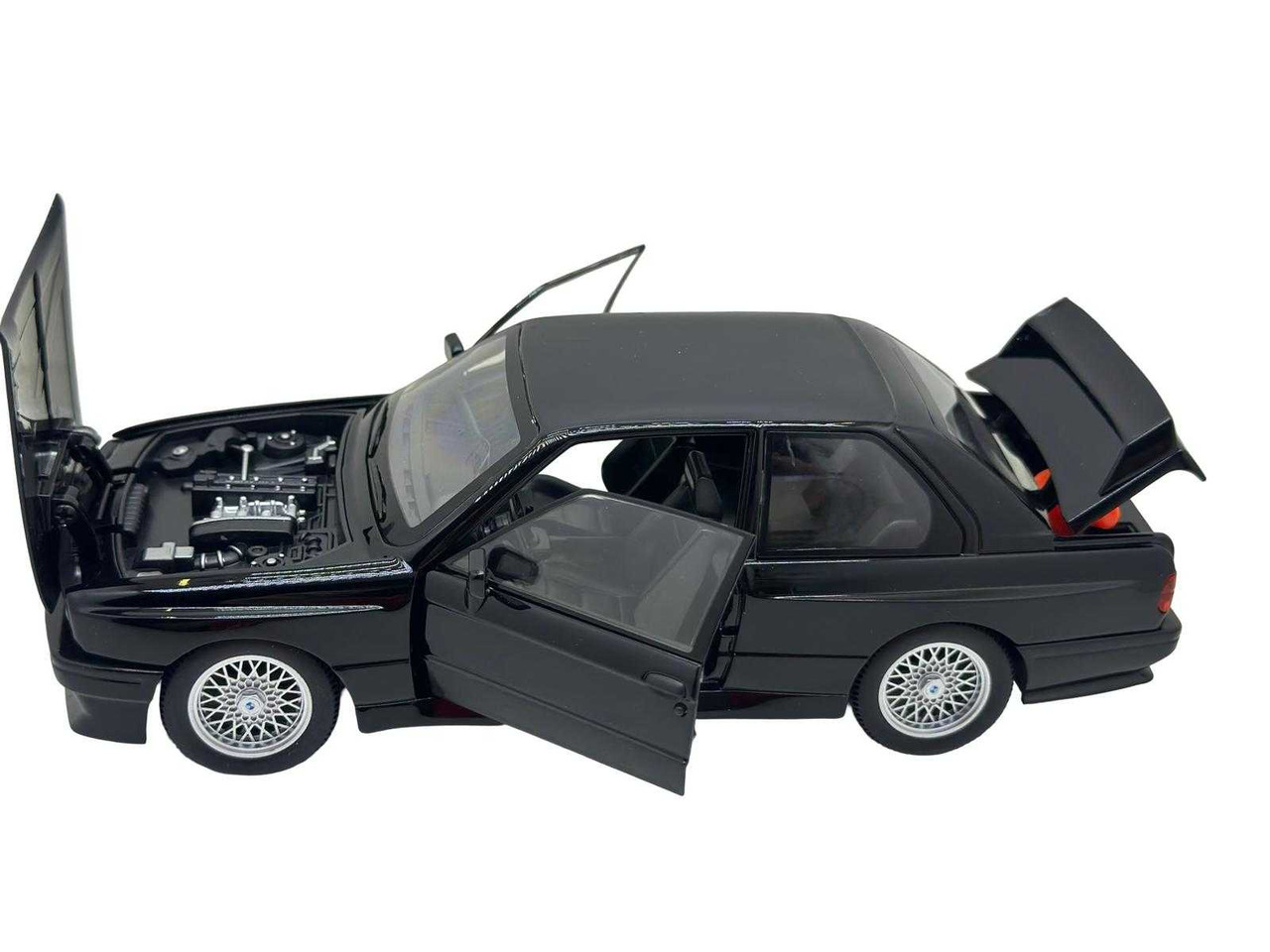 Macheta BMW E30 M3 negru ursulet 1:24 cu sunet, lumini, pornire pe volan, resort