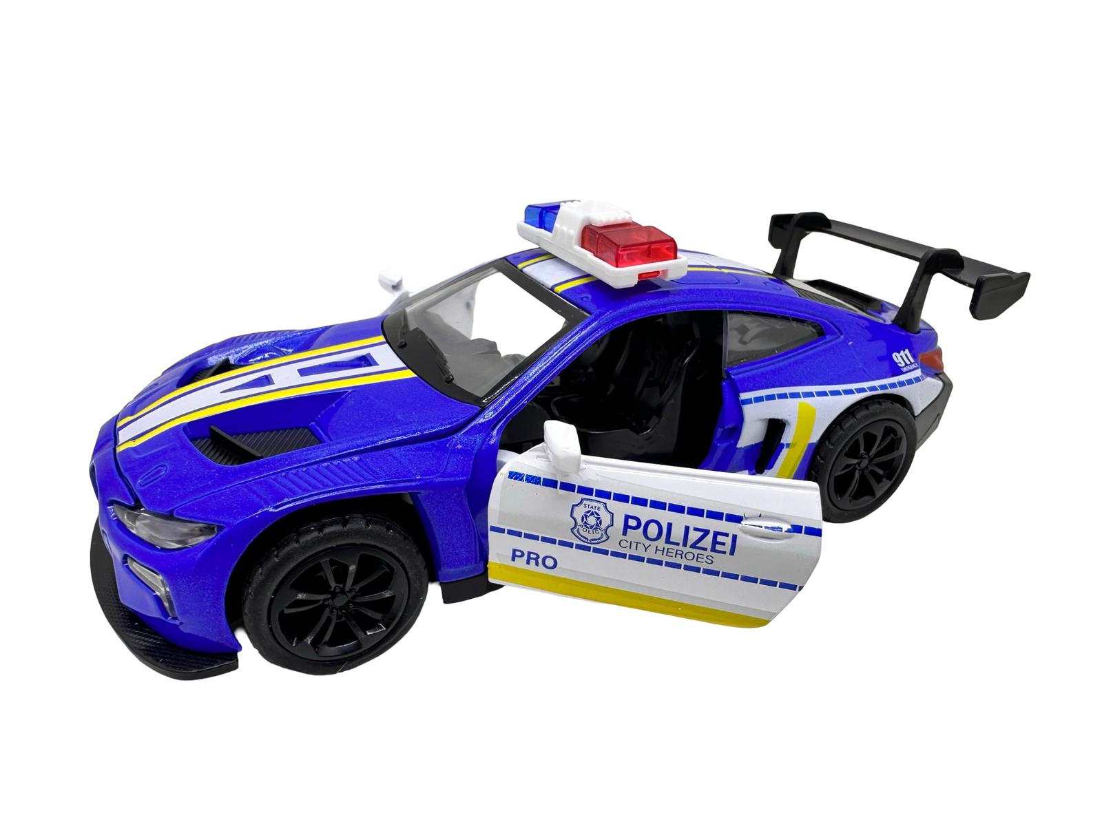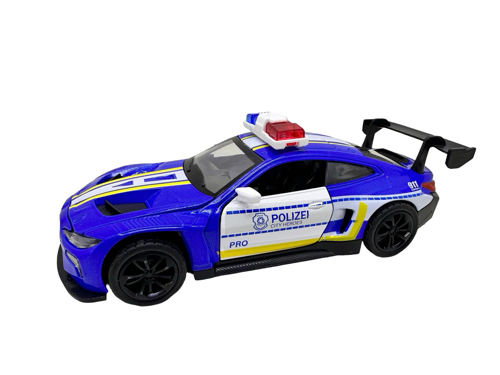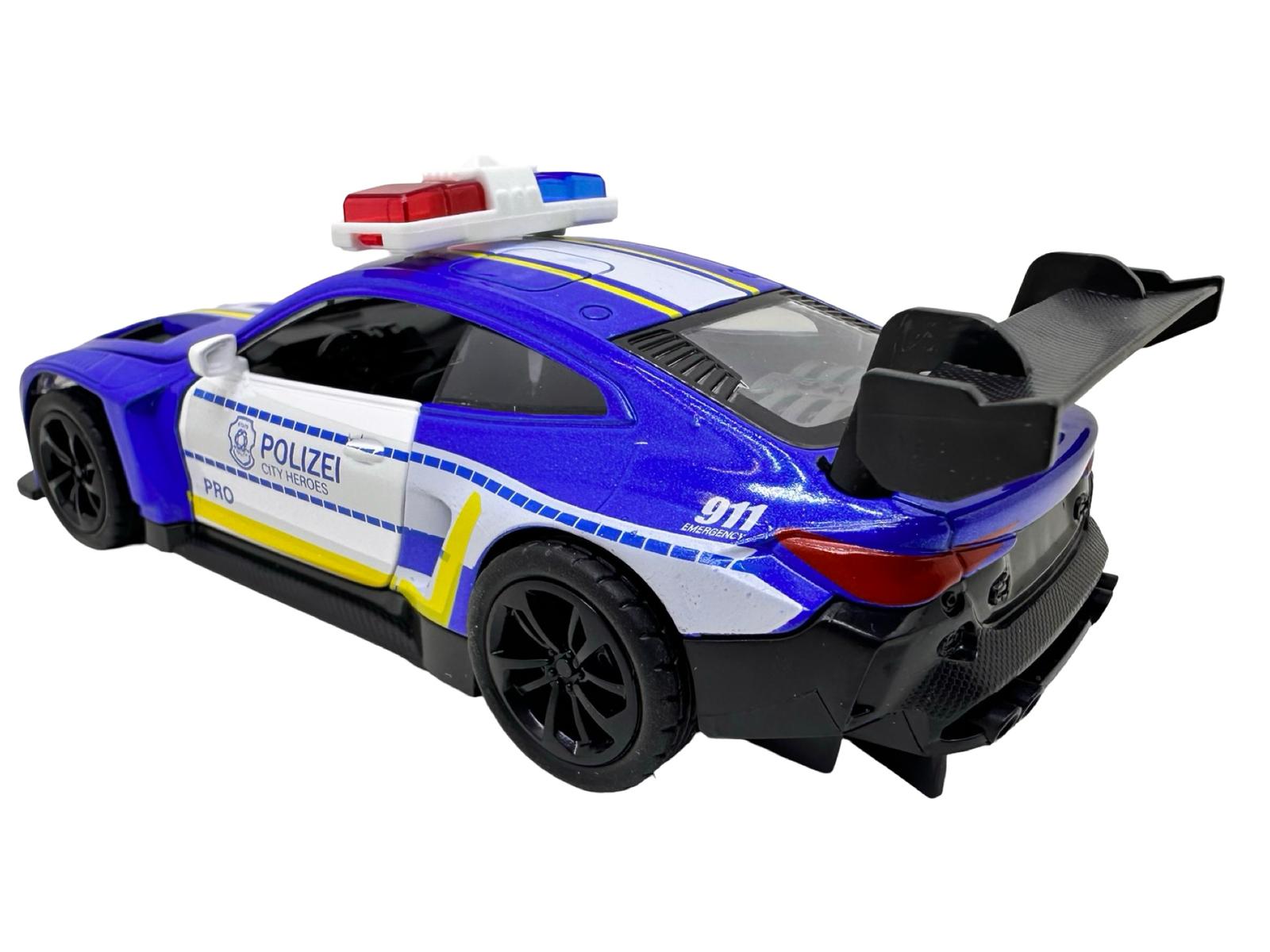 Macheta BMW M4 albastru Politie Sport 1:28 metal lumini si sunete deschide usile