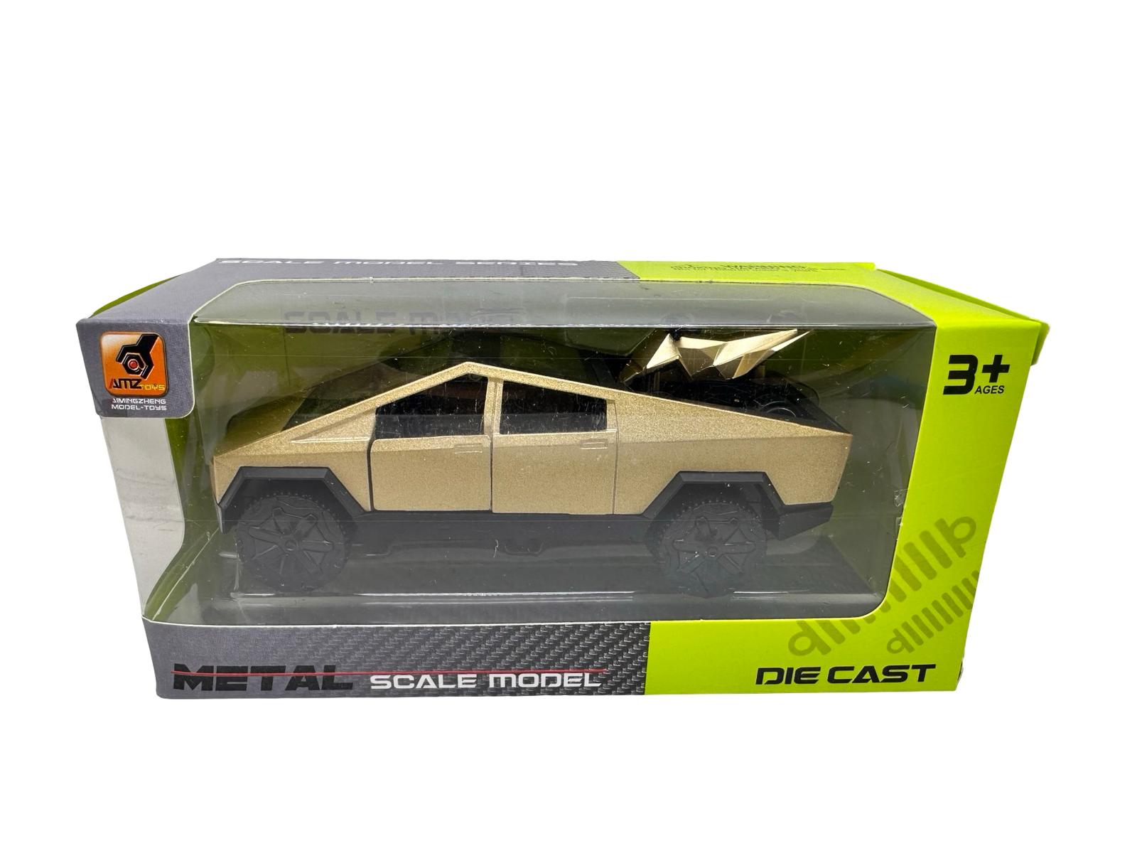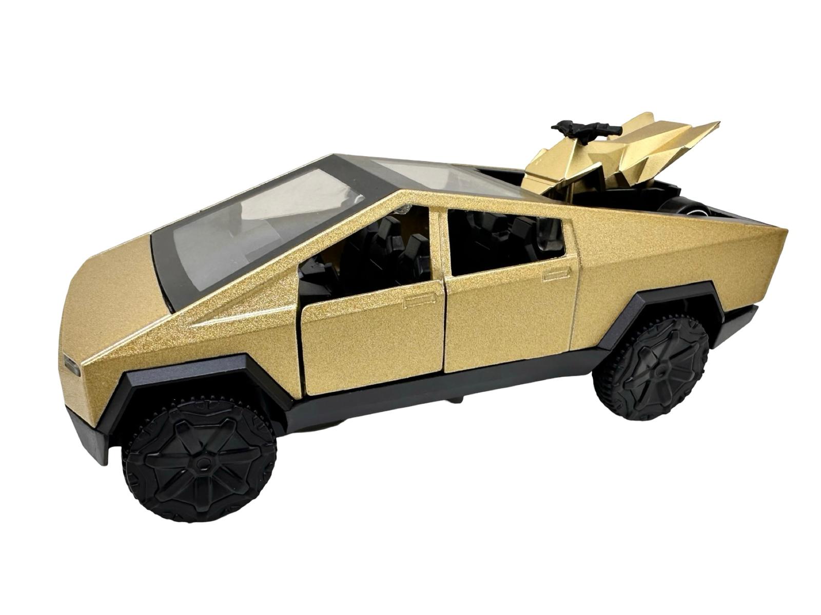Macheta Tesla Cybertruck cu ATV in varianta aurie premium este realizata din aliaj metalic die-cast cu finisaj lucios. Usi functionale, roti mobile, ATV inclus in set. Ideala pentru joaca sau colectie. Lungime macheta: aproximativ 12 cm. Material: metal si plastic ABS. Varsta recomandata: 3+ ani.