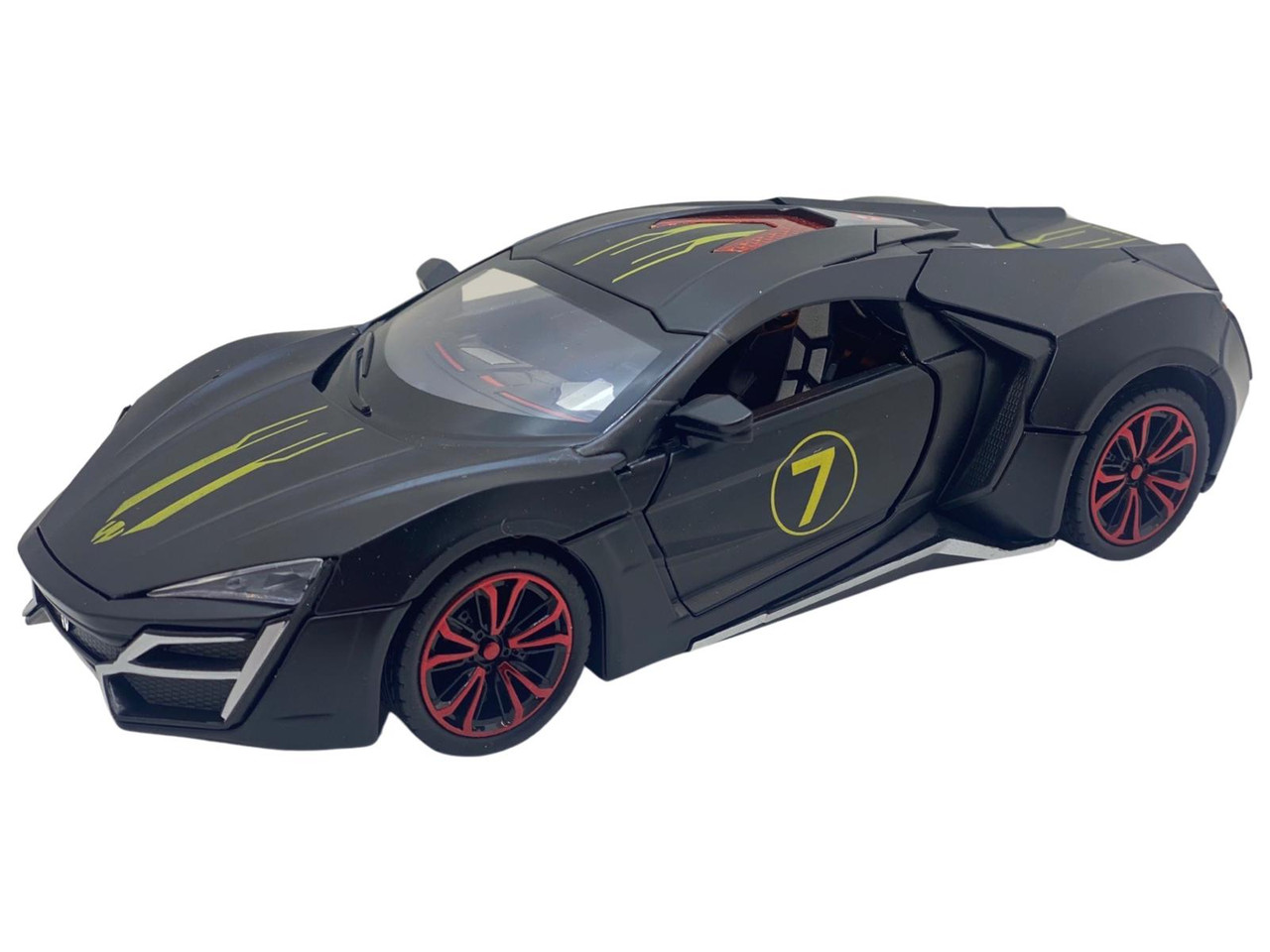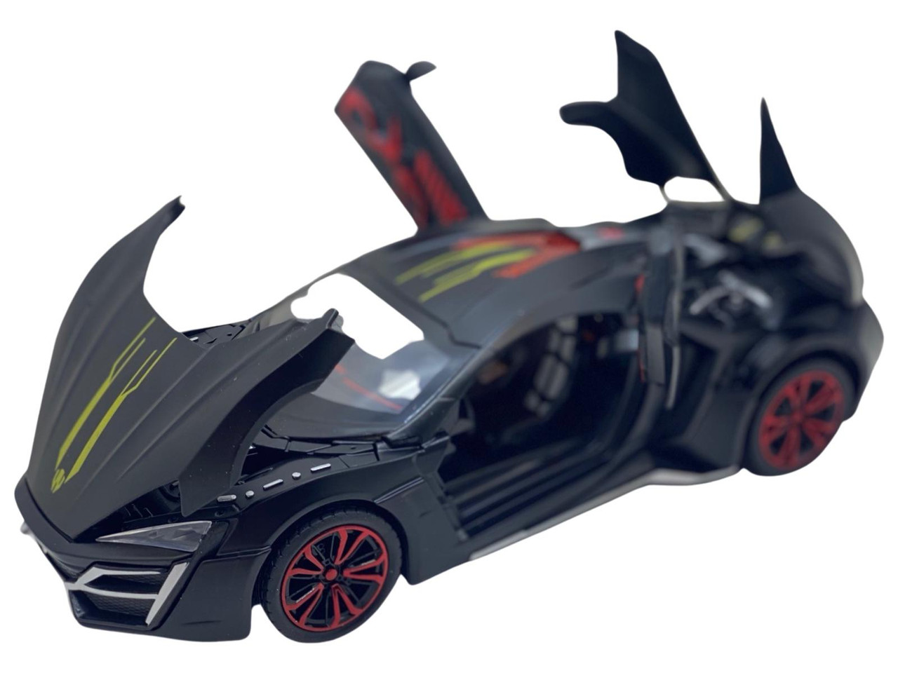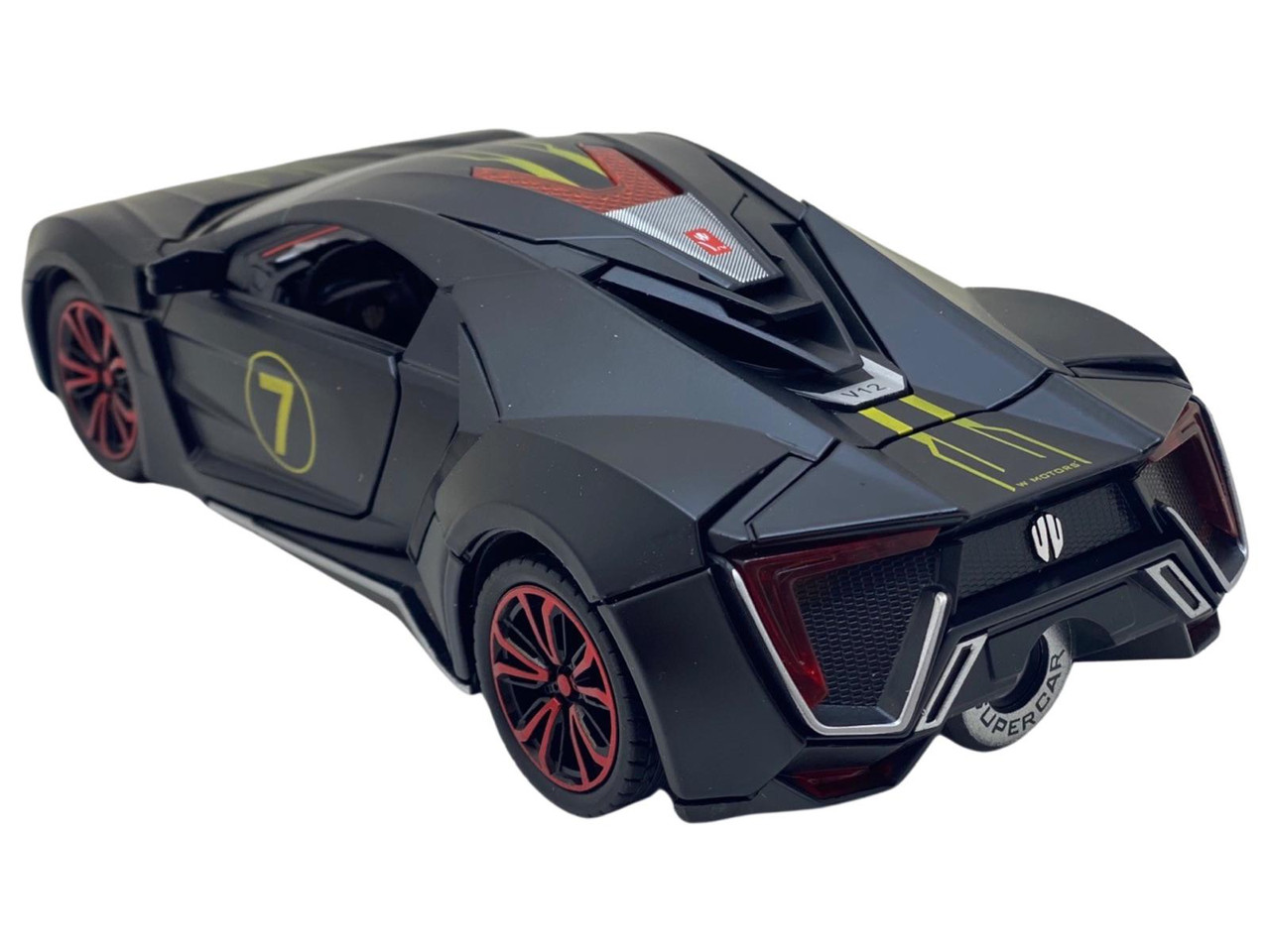 Macheta din metal Lykan negru replica cu fum scara 1:24. Masinuta Deschide usile fata din spate, portbagajul si capota. Este produs replica si este sigilata. Are detalii foarte bune si finisaje de calitate.