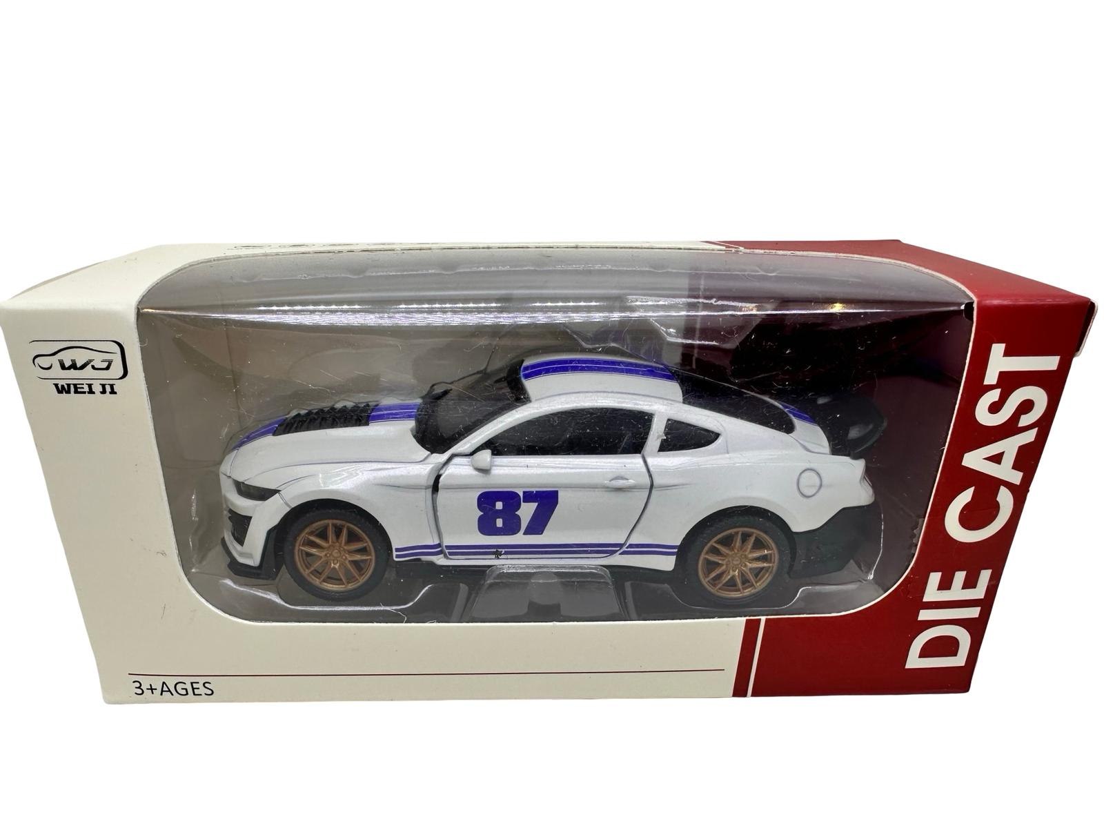 Macheta Ford Mustang Shelby GT500 1:38 alb usi capota portbagaj lumini sunete pull back este o replica die cast realizata din metal si plastic, cu un design sportiv inspirat din celebrul muscle car american.