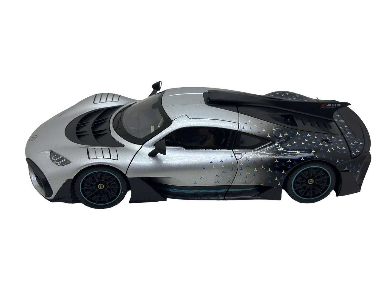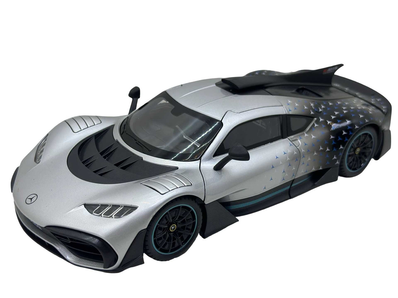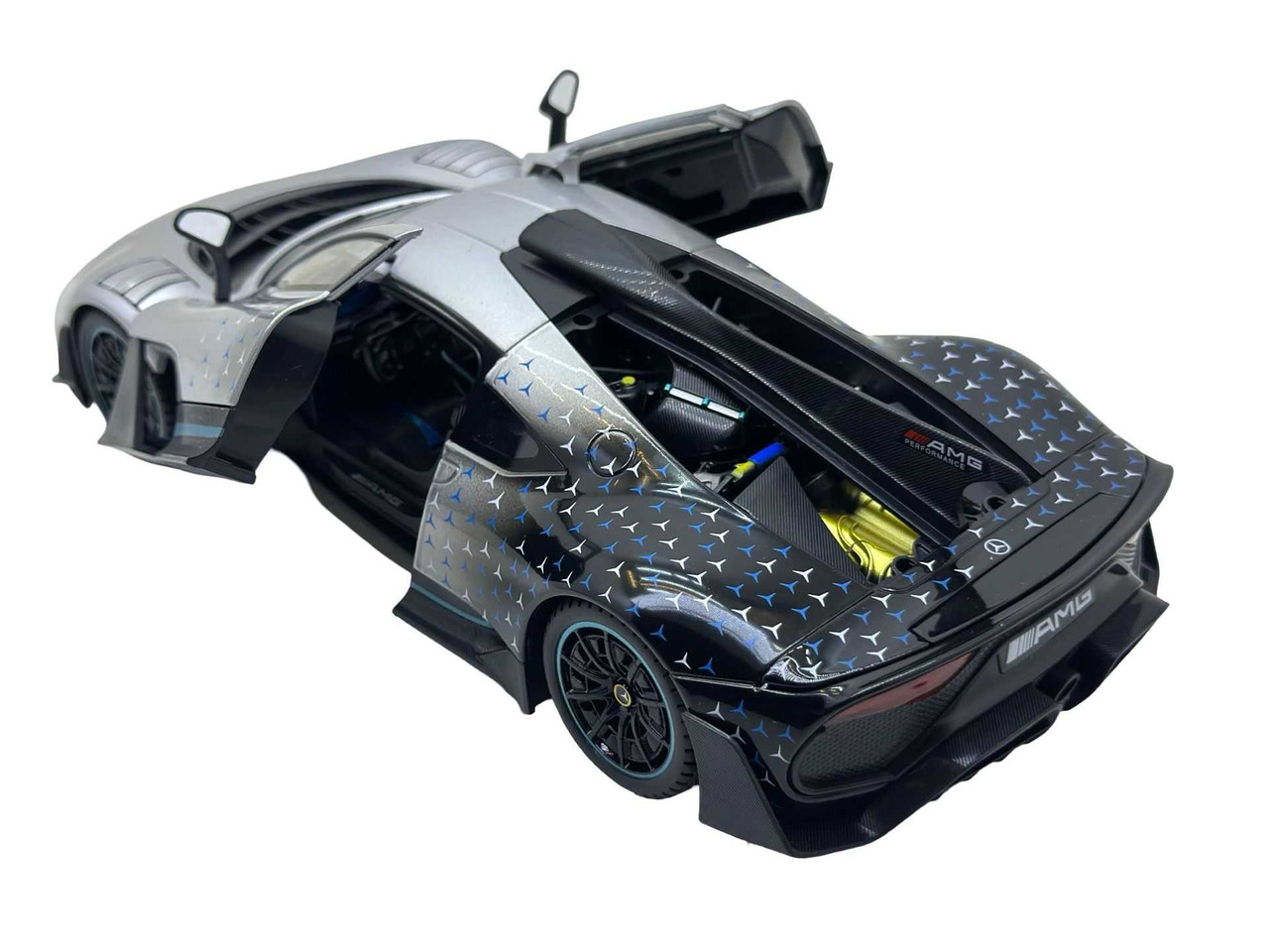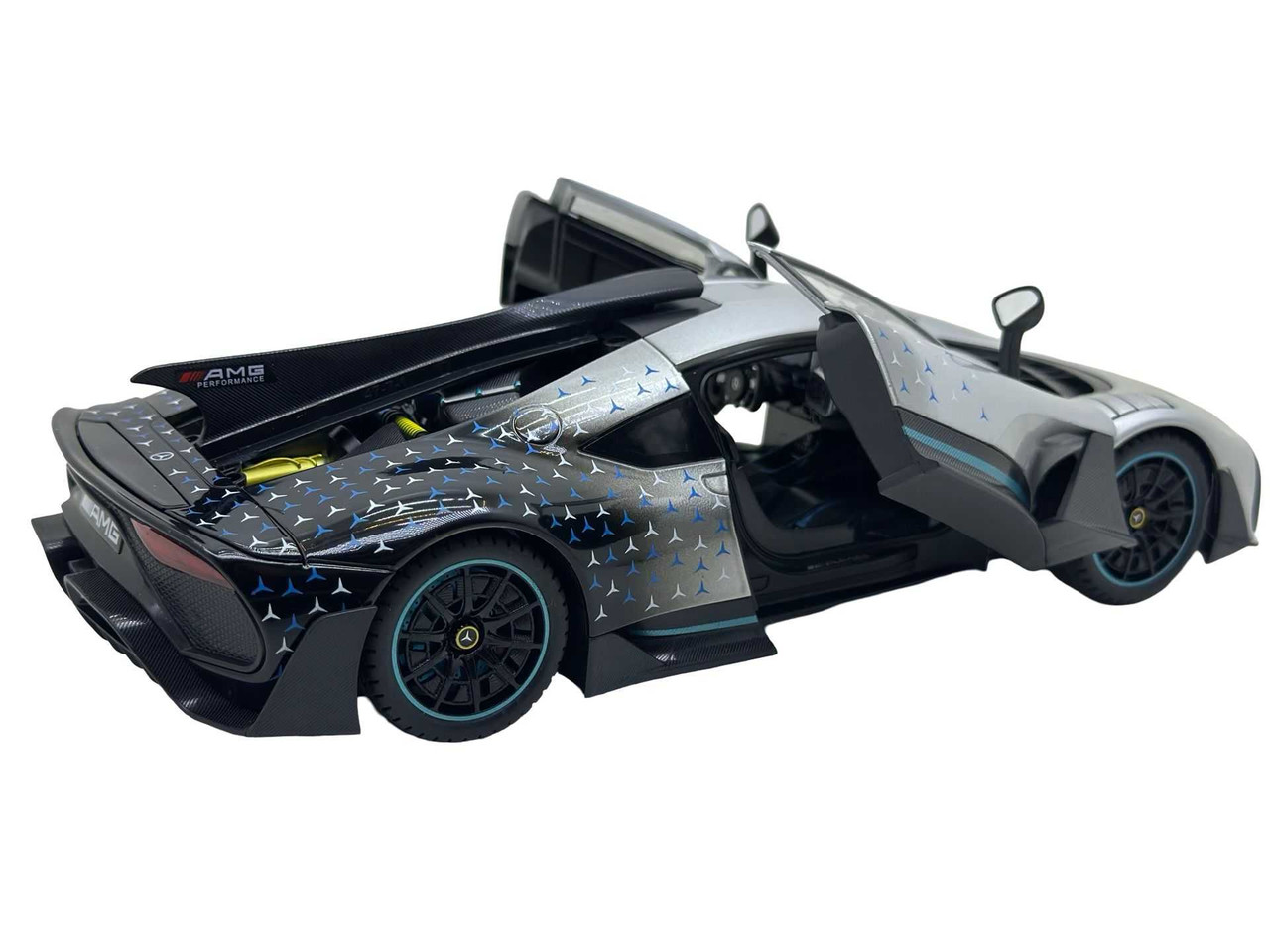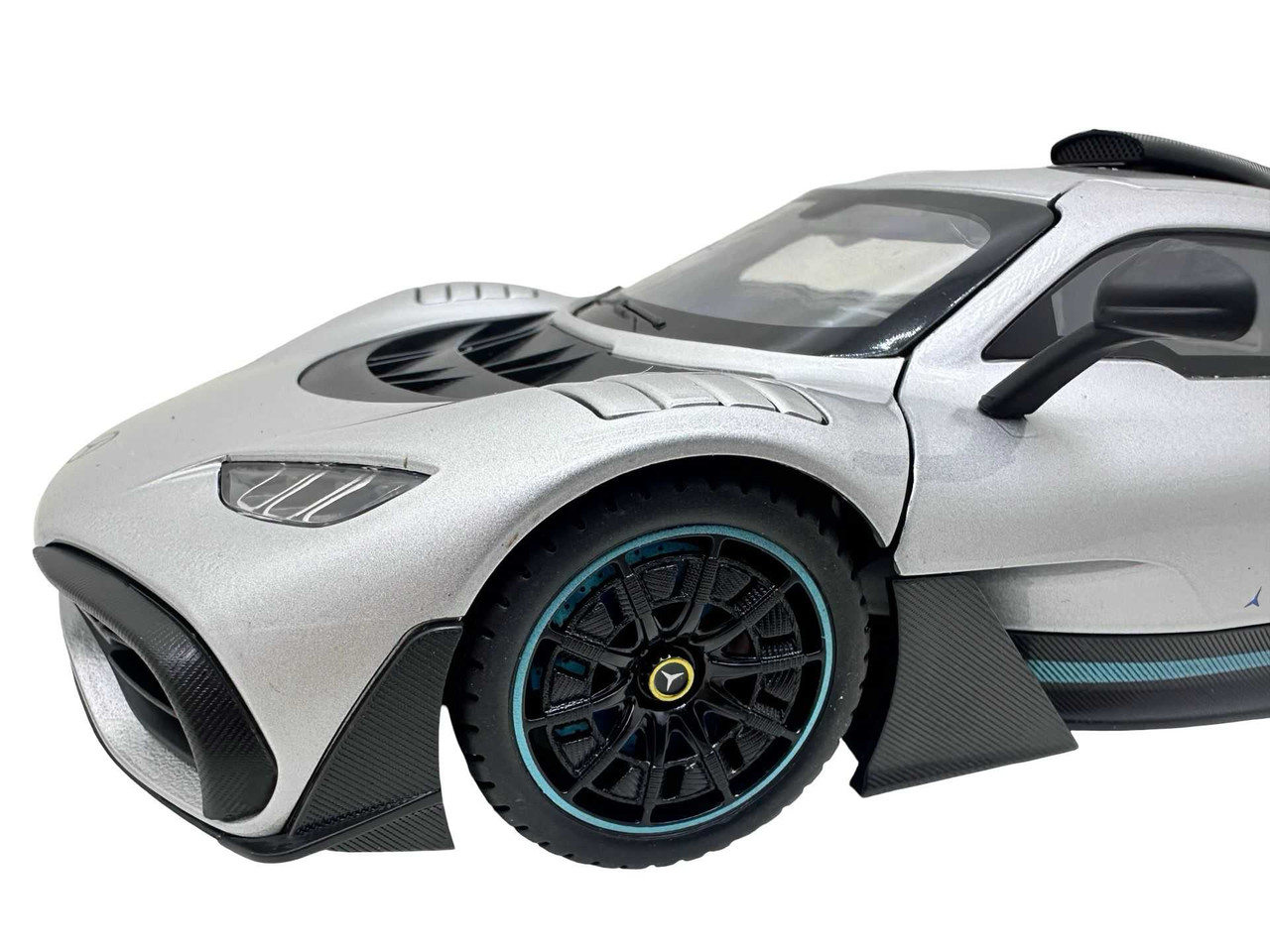 Macheta Mercedes One 1/18 replica metal cu sunet si lumini, usi deschise gri argintiu