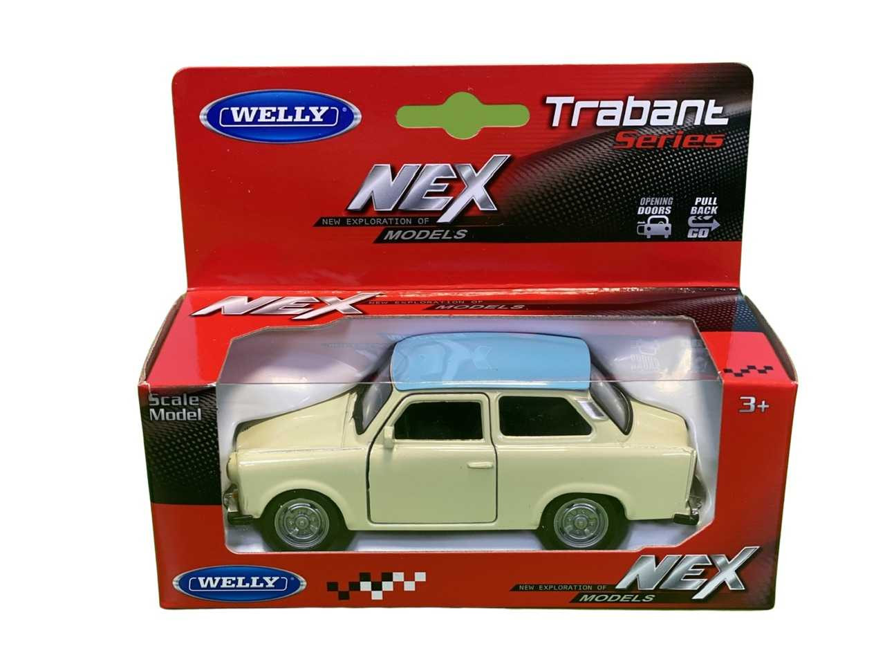 Macheta metal Trabant crem cu plafon albastru. Macheta este Scara 1:43 produs de Welly. Deschide usile si are resort pe rotile din spate. Masinuta este un produs original. Este recomandata copiilor peste 6 ani sau colectionarilor.