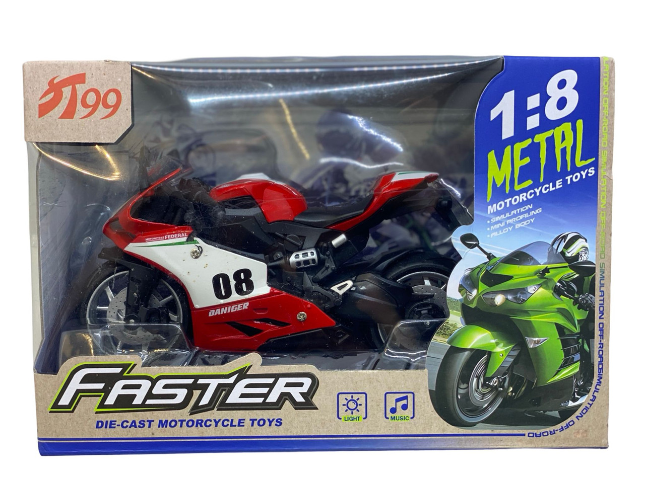 Aceasta macheta metalica la scara 1:8 reproduce fidel un model de motocicleta sport de viteza. Fabricata din metal die-cast, aceasta piesa este ideala pentru colectionari si pasionatii de motociclete. Modelul dispune de functii interactive, cum ar fi efecte luminoase si sonore, oferind o experienta captivanta. Detaliile sunt de o precizie impresionanta, aducand realism la fiecare viraj si accelerare.
