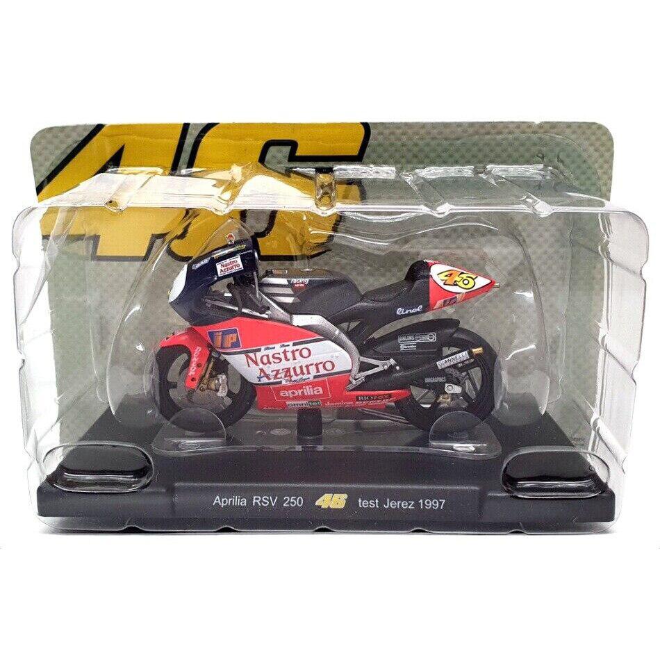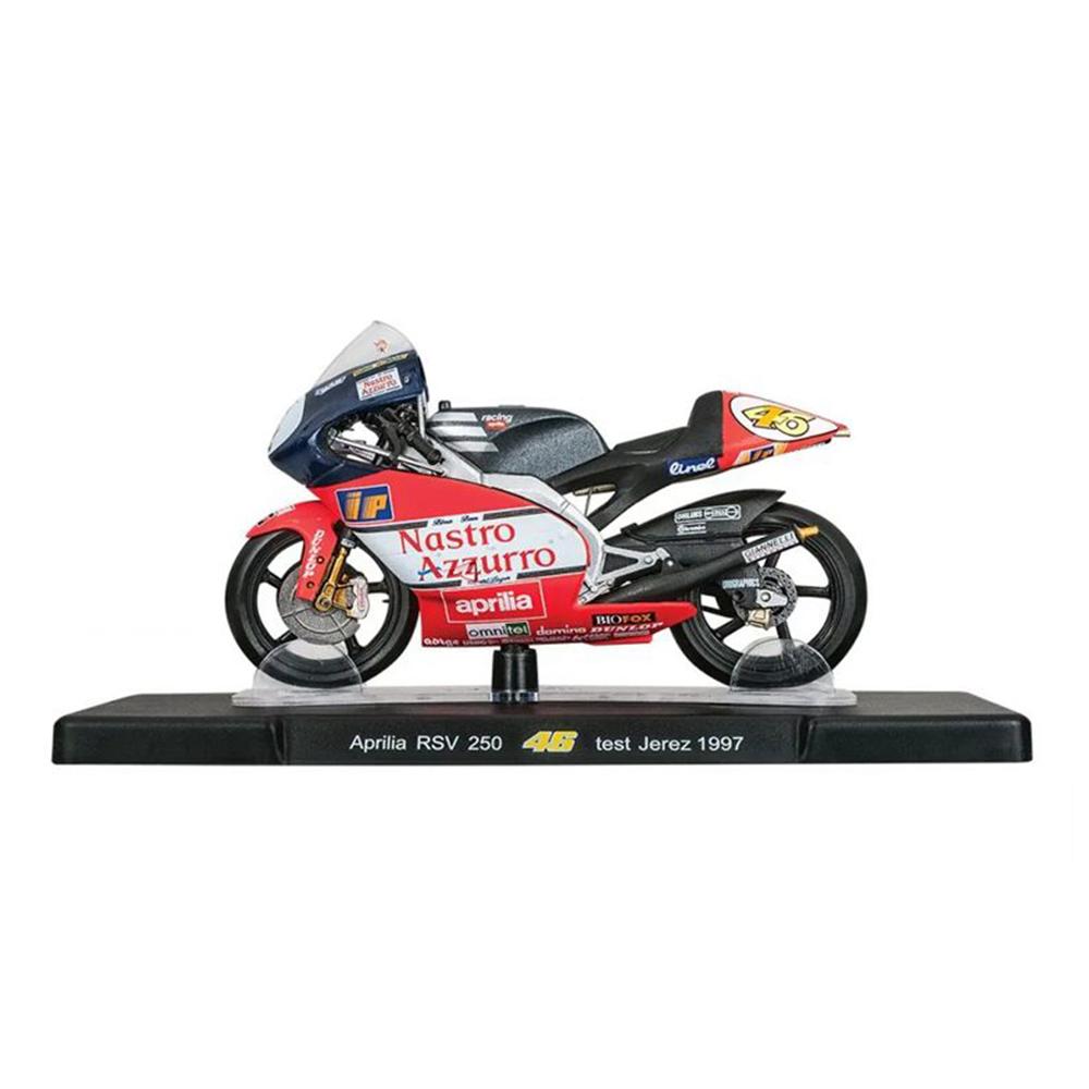 Aceasta macheta reproduce motocicleta Aprilia RSV 250 folosita in testele de la Jerez din 1997, asociata cu numarul 46, marcand inceputurile unei cariere legendare in motociclismul de viteza.