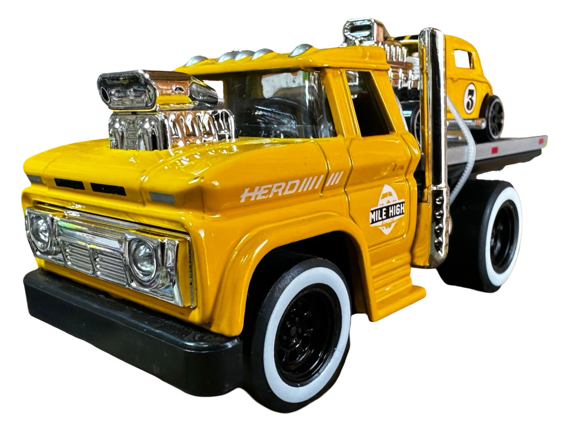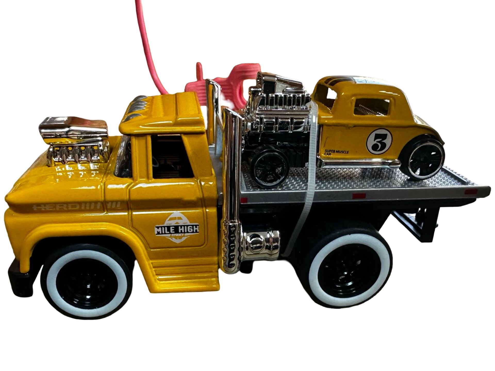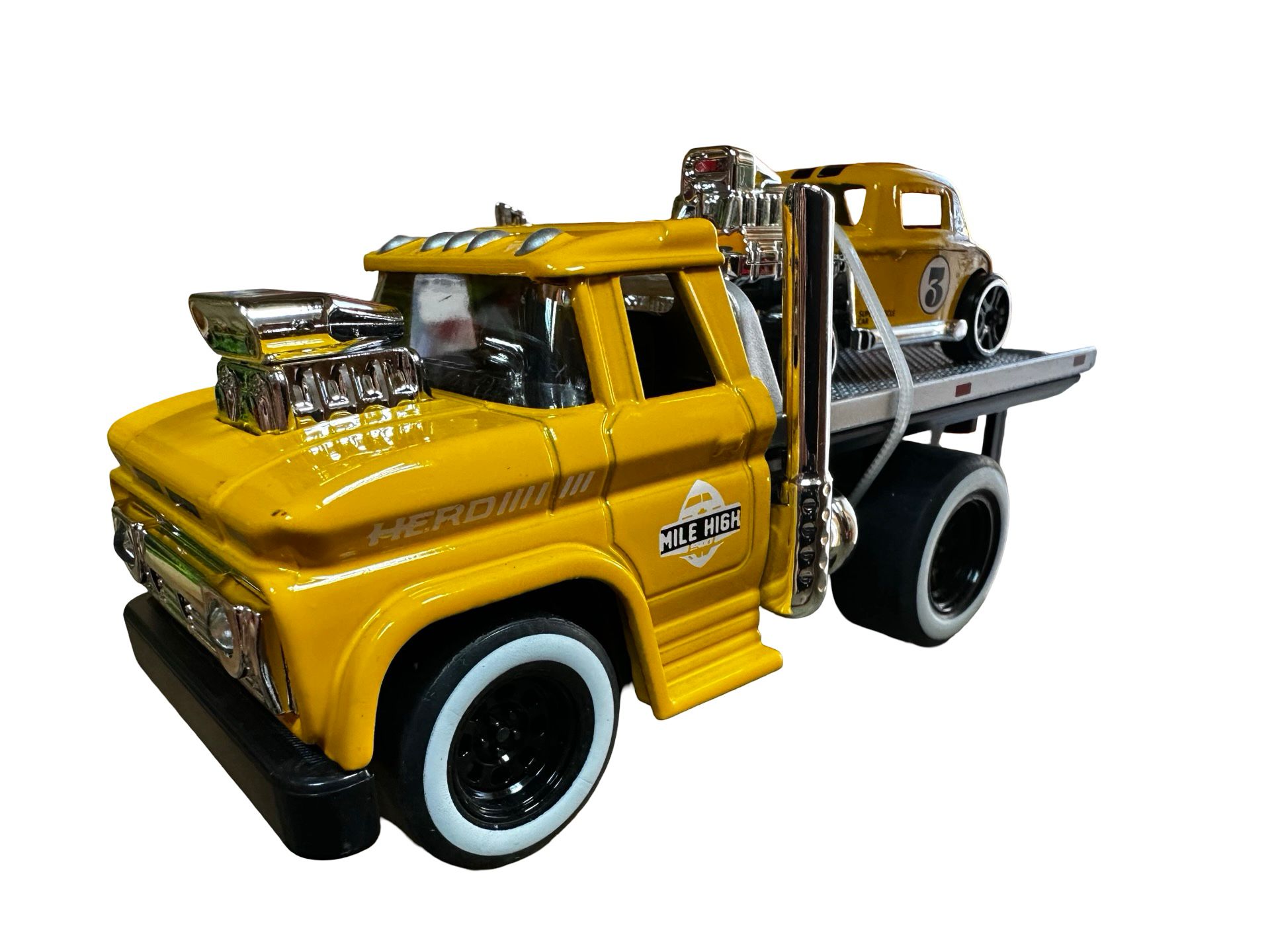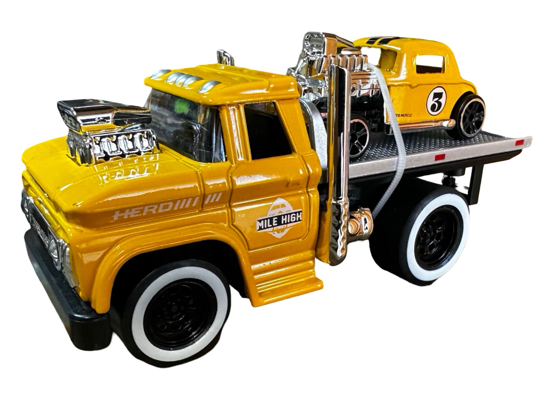 <p>Aceasta macheta galbena cu sunet si lumini, platforma de tractare si masina retro inclusa este o jucarie captivanta pentru micii colectionari si pasionati de masini. Camionul metalic are un design realist, cu platforma de transport, cabina detaliata si roti functionale, fiind insotit de o masina retro deosebita.</p>