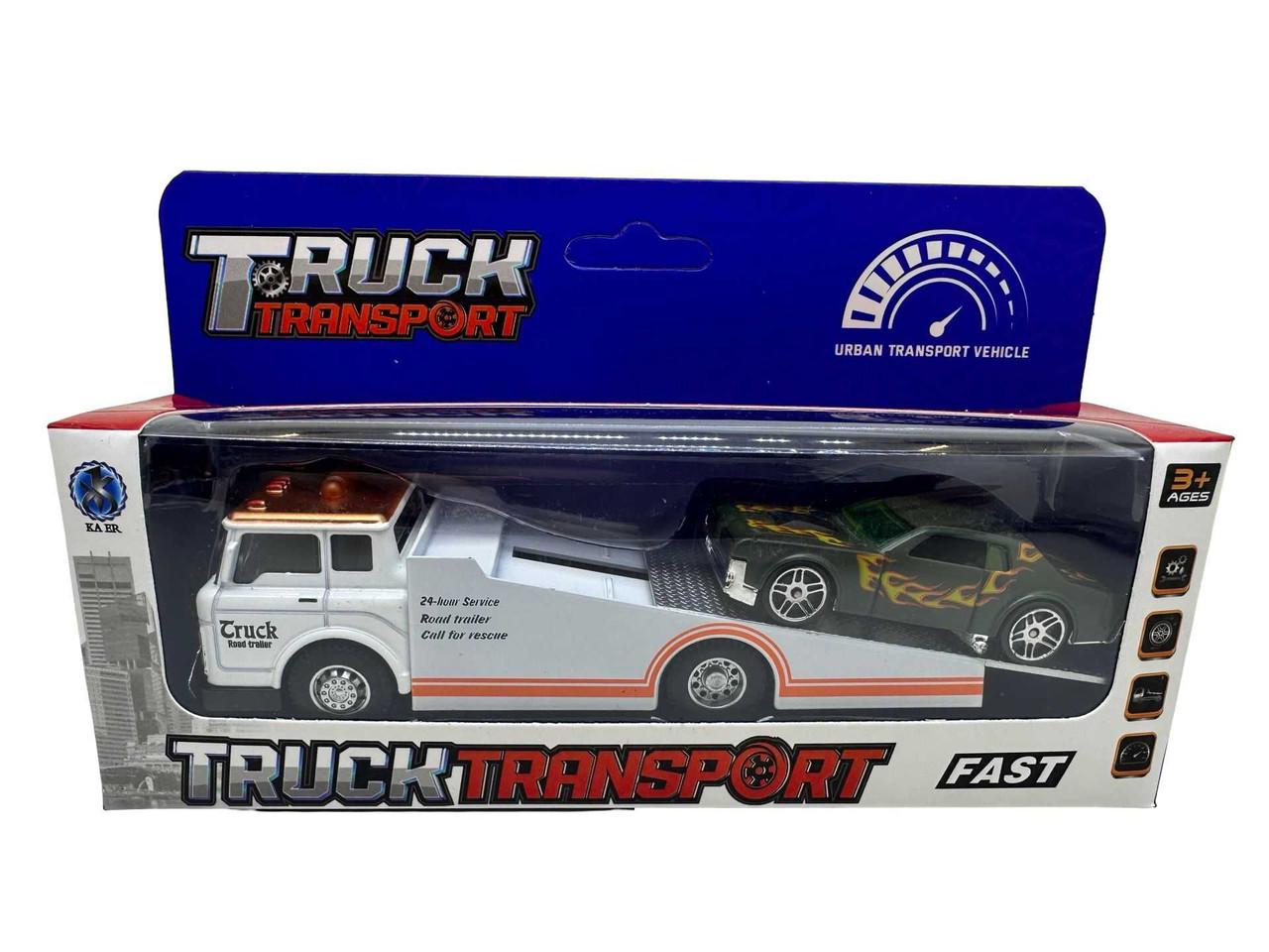 Aceasta macheta cu platforma de tractare si masina sport inclusa este o jucarie captivanta pentru micii colectionari si pasionati de masini. Camionul metalic are un design realist, cu platforma de transport, cabina detaliata si roti functionale, fiind insotit de o masina sport verde cu flacari imprimate, gata de actiune.