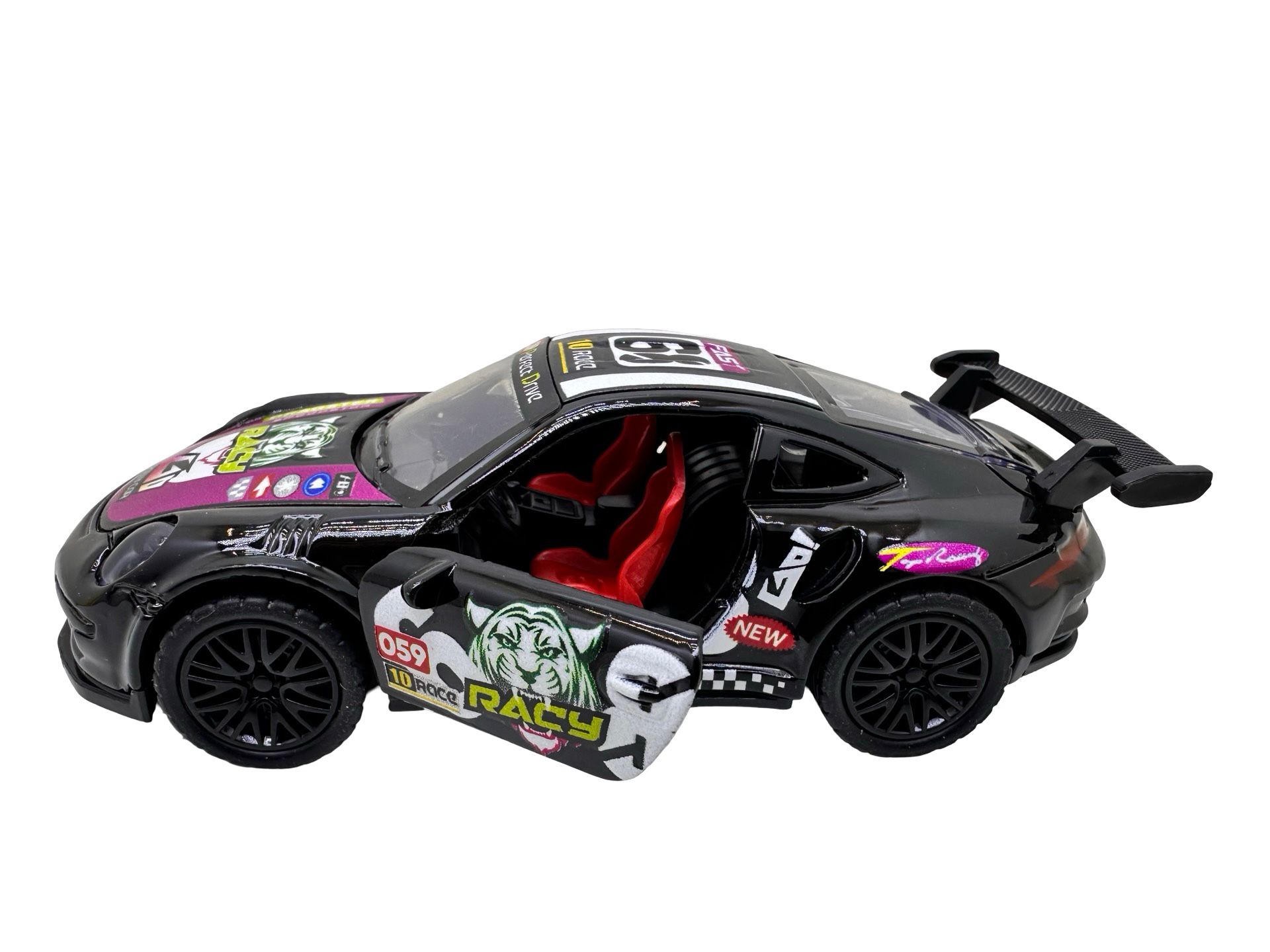 Macheta Porsche negru 1:43 metal lumini si sunete usi deschise pull-back
