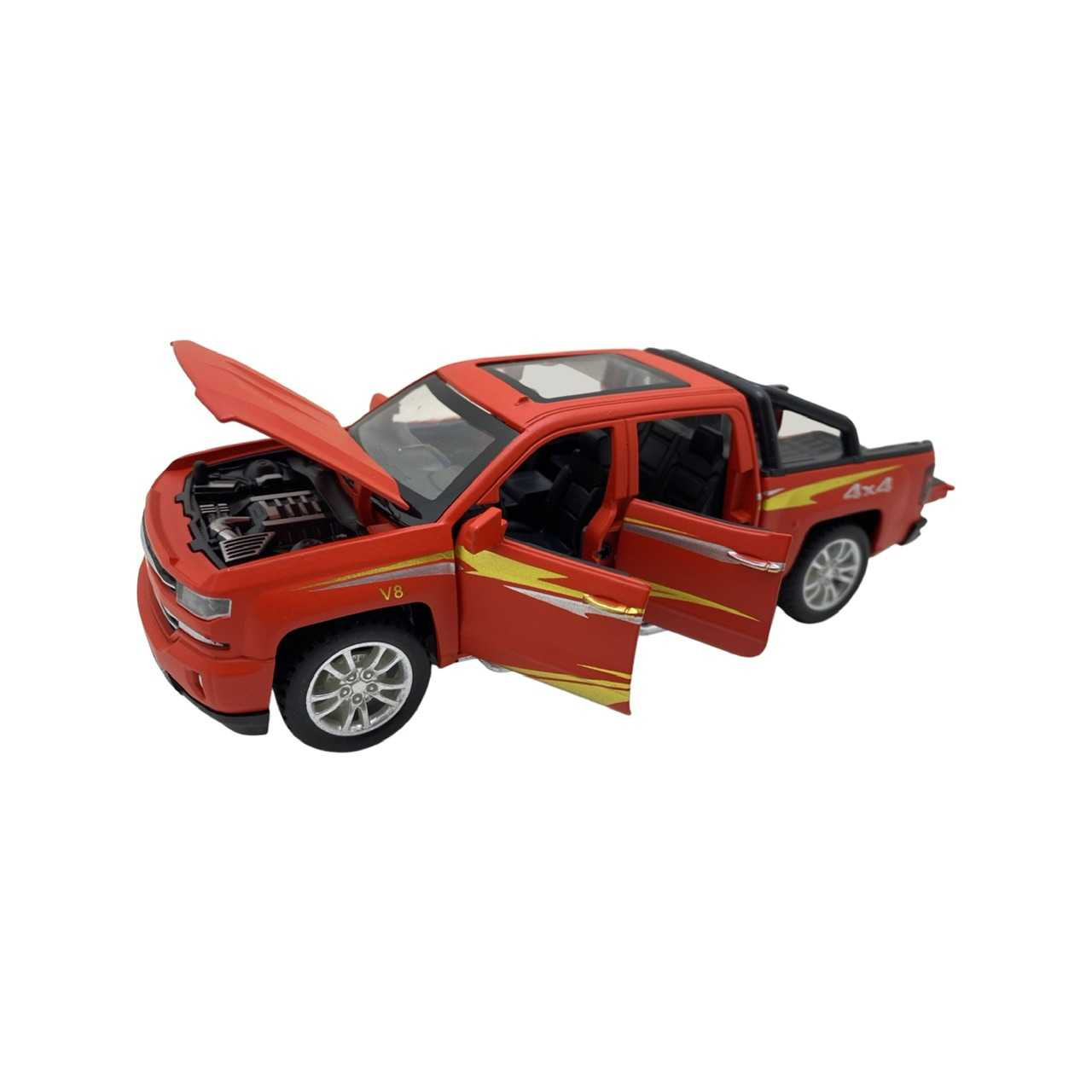 Macheta replica Chevrolet Silverado rosu cu sunete si lumini scara 1:32 (17-18 cm lungime). Masinuta vine ambalata in cutie individuala si are bateriile AG13 incluse. Masinuta are sunete de motor care se activeaza atunci cand este usor apasata si merge in față. Cand se deschide usa de la sofer masinuta de asemenea emite sunete. Cea mai importanta caracteristica a acestor masinute este faptul ca deschide toate usile si capotele fata-spate. Finisajele de asemenea sunt de calitate foarte bune cu detalii si la interior. Recomandata copiilor cu varsta peste 3 ani.