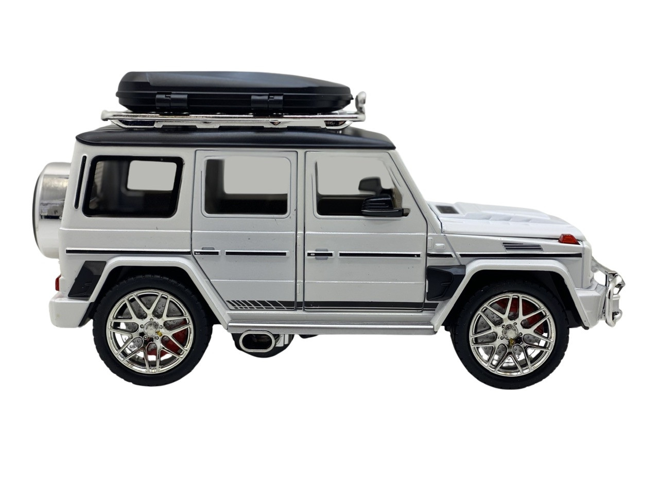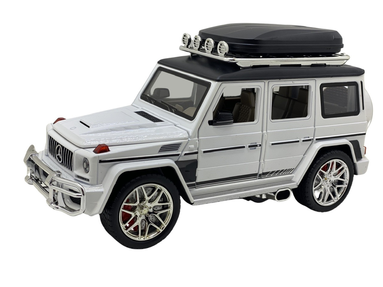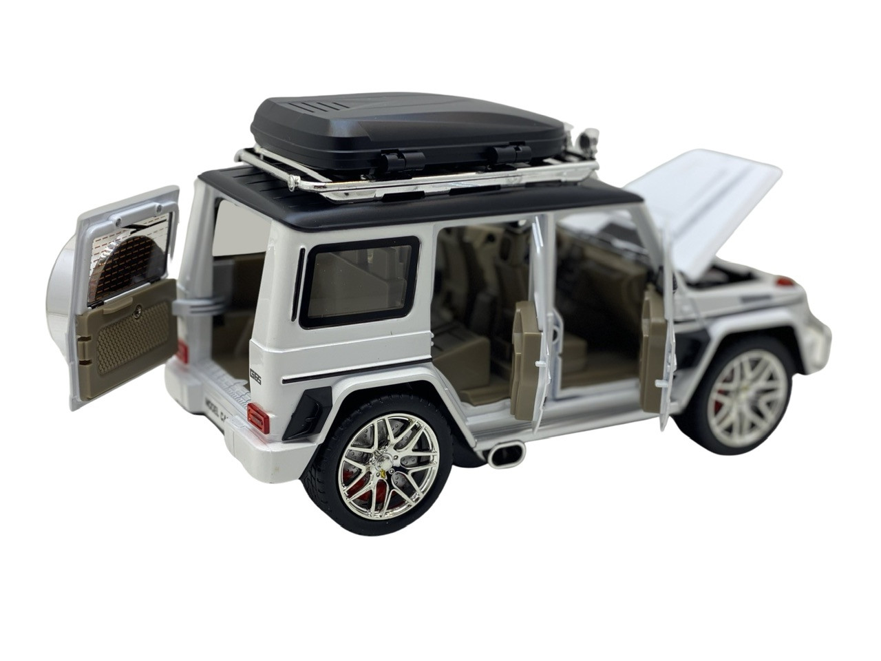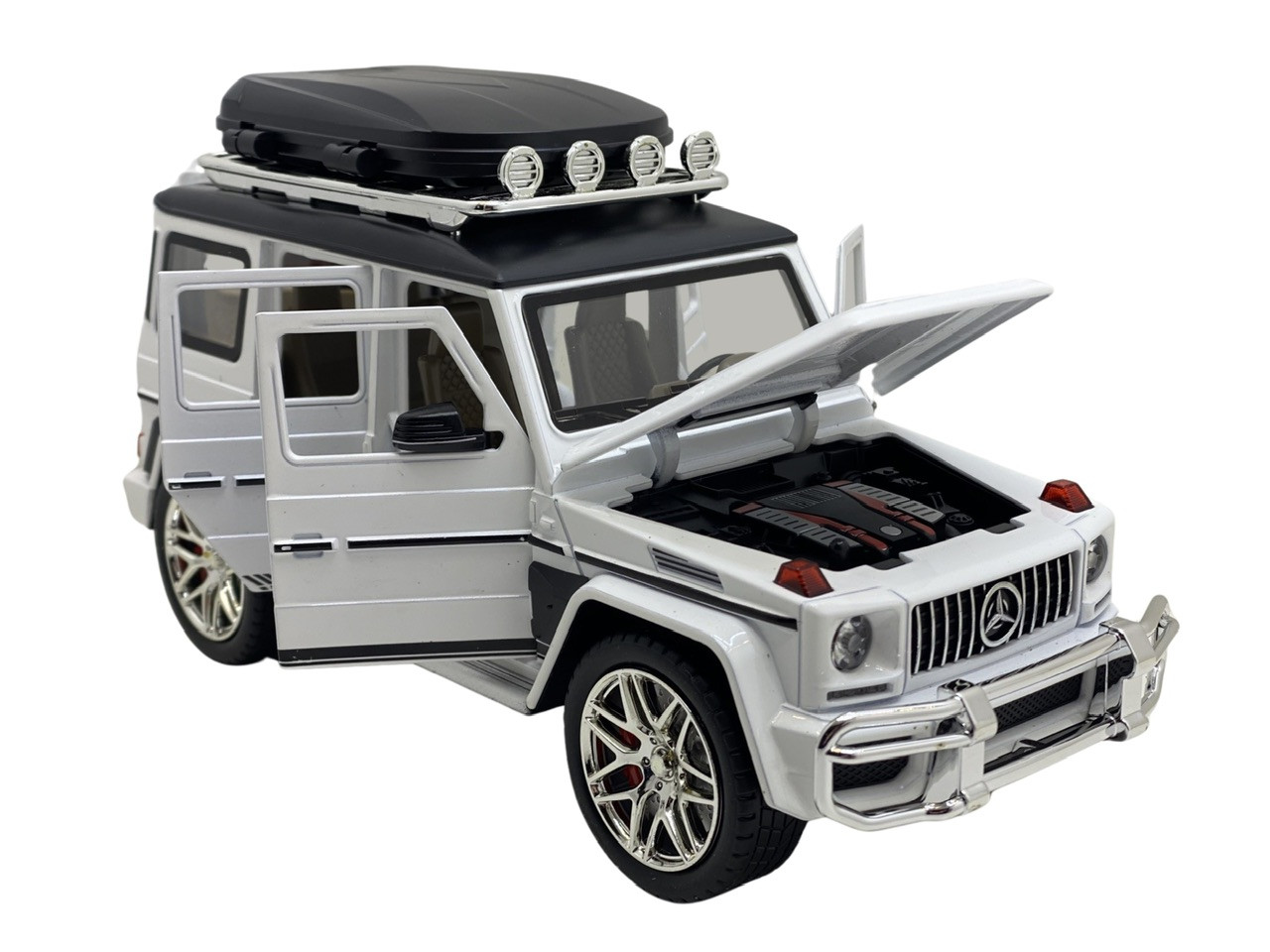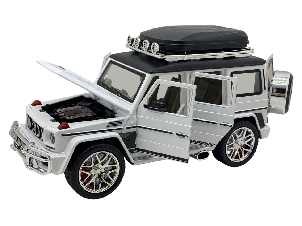 Macheta replica Mercedes G Class alb cu sunete, lumini si fum care iese pe ambele tobe. Scara este 1:24 (20cm lungime). Masinuta are sunete de motor care se activeaza atunci cand este usor apasata si merge in față. Cand se deschide usa de la sofer masinuta de asemenea emite sunete. Cea mai importanta caracteristica a acestor masinute este faptul ca deschide toate usile si capotele fata-spate. Finisajele de asemenea sunt de calitate foarte bune cu detalii si la interior. Recomandata copiilor cu varsta peste 3 ani.