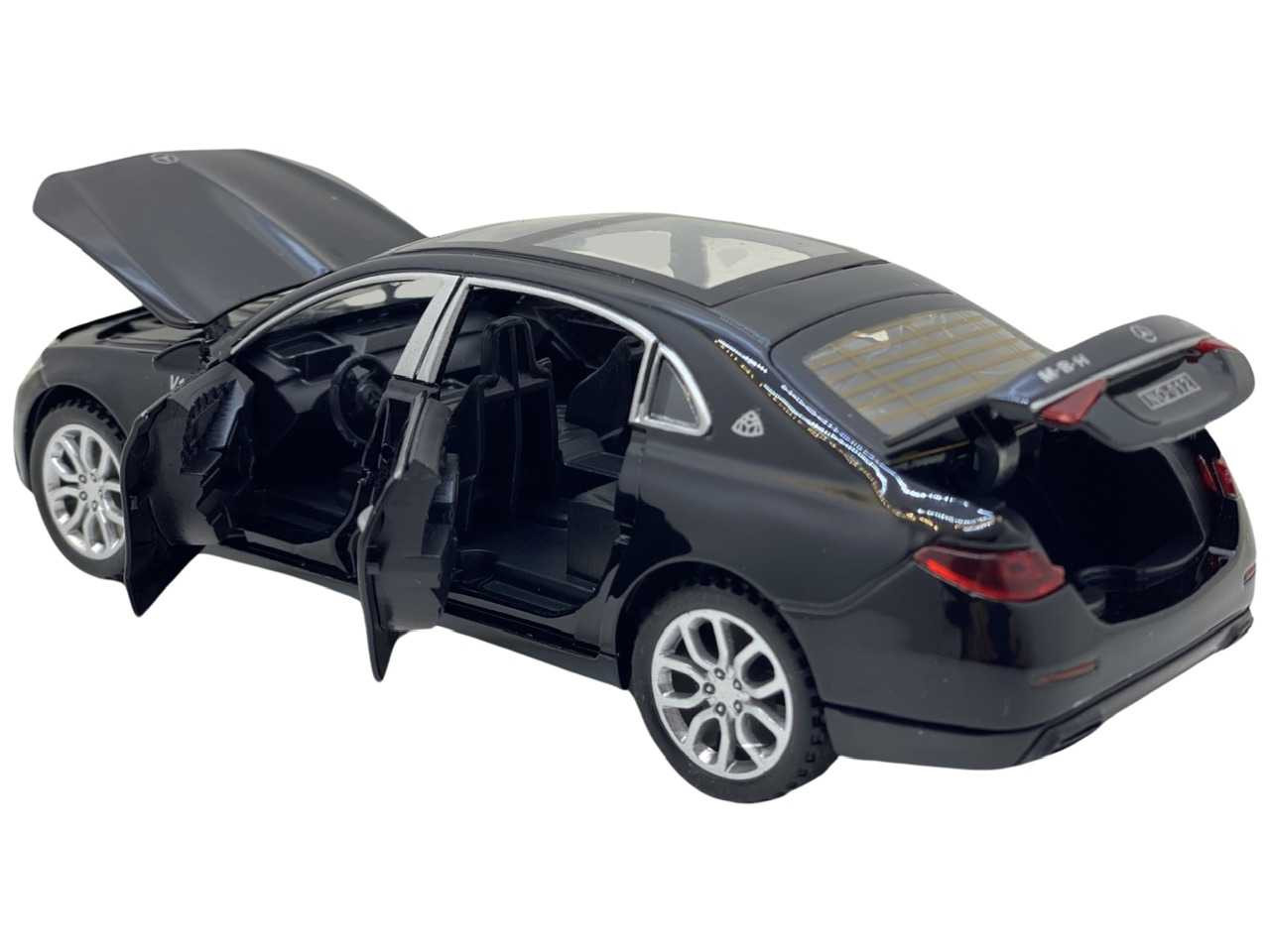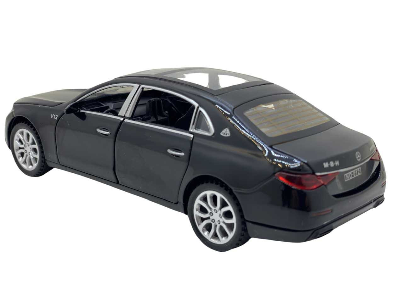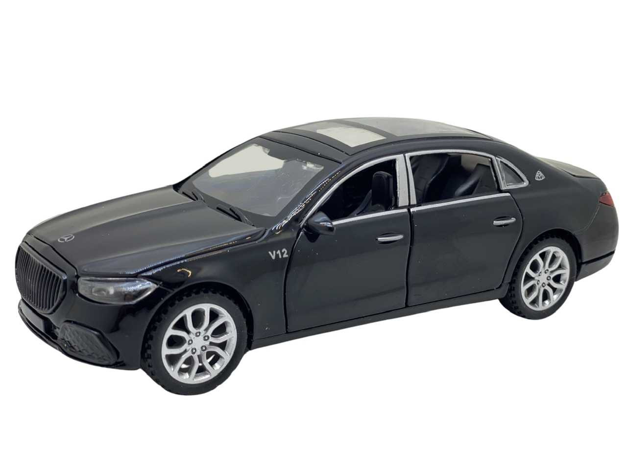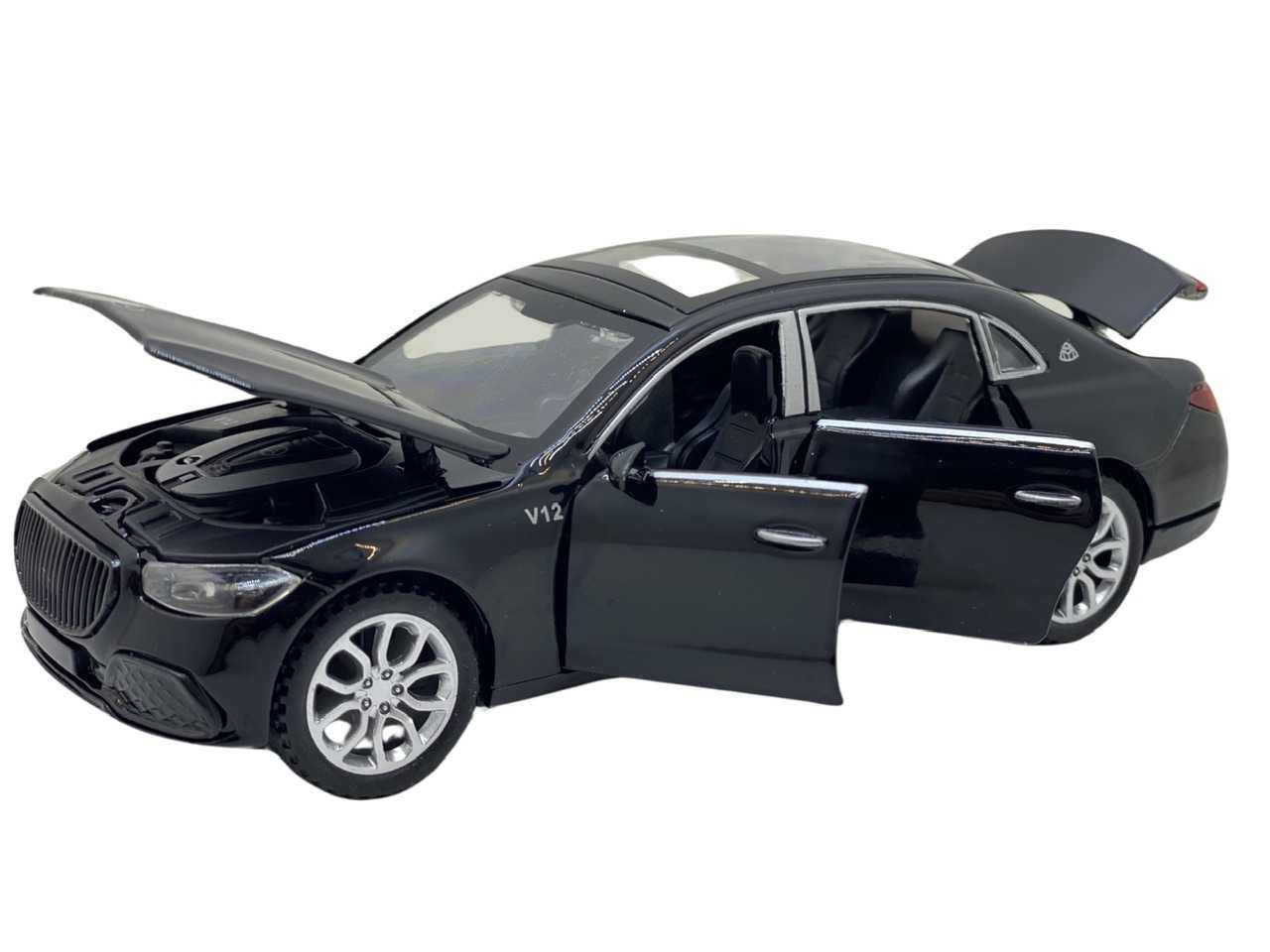 Macheta replica Mercedes Maybach S Class negru cu sunete, lumini, deschide usi, capote scara 1:32 (14 cm lungime). Masinuta vine ambalata in cutie individuala si are bateriile AG13 incluse. Masinuta are sunete de motor care se activeaza atunci cand este usor apasata si merge in față. Cand se deschide usa de la sofer masinuta de asemenea emite sunete. Cea mai importanta caracteristica a acestor masinute este faptul ca deschide toate usile si capotele fata-spate. Finisajele de asemenea sunt de calitate foarte bune cu detalii si la interior. Recomandata copiilor cu varsta peste 3 ani.