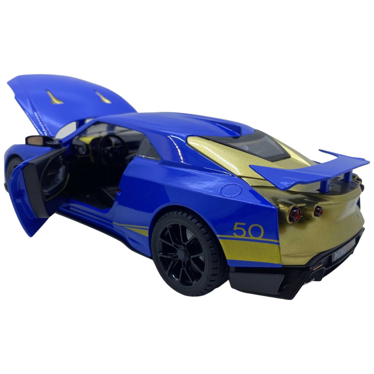 Macheta replica Nissan GTR albastru deschide 4 usi, portbagaj si capota, lumini si sunete