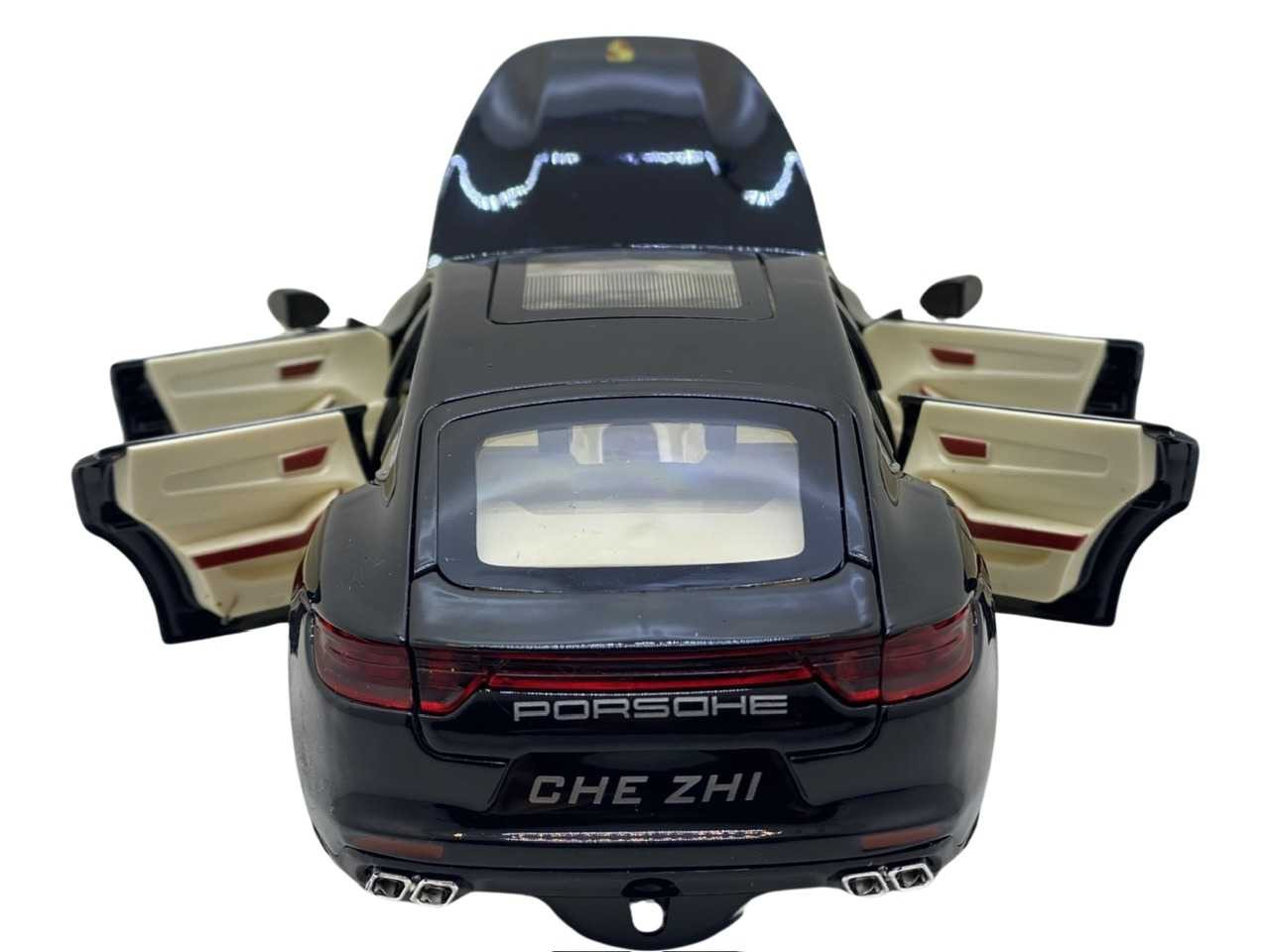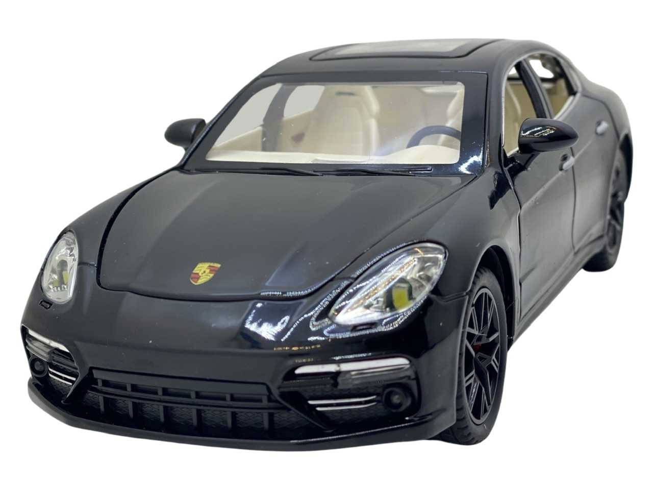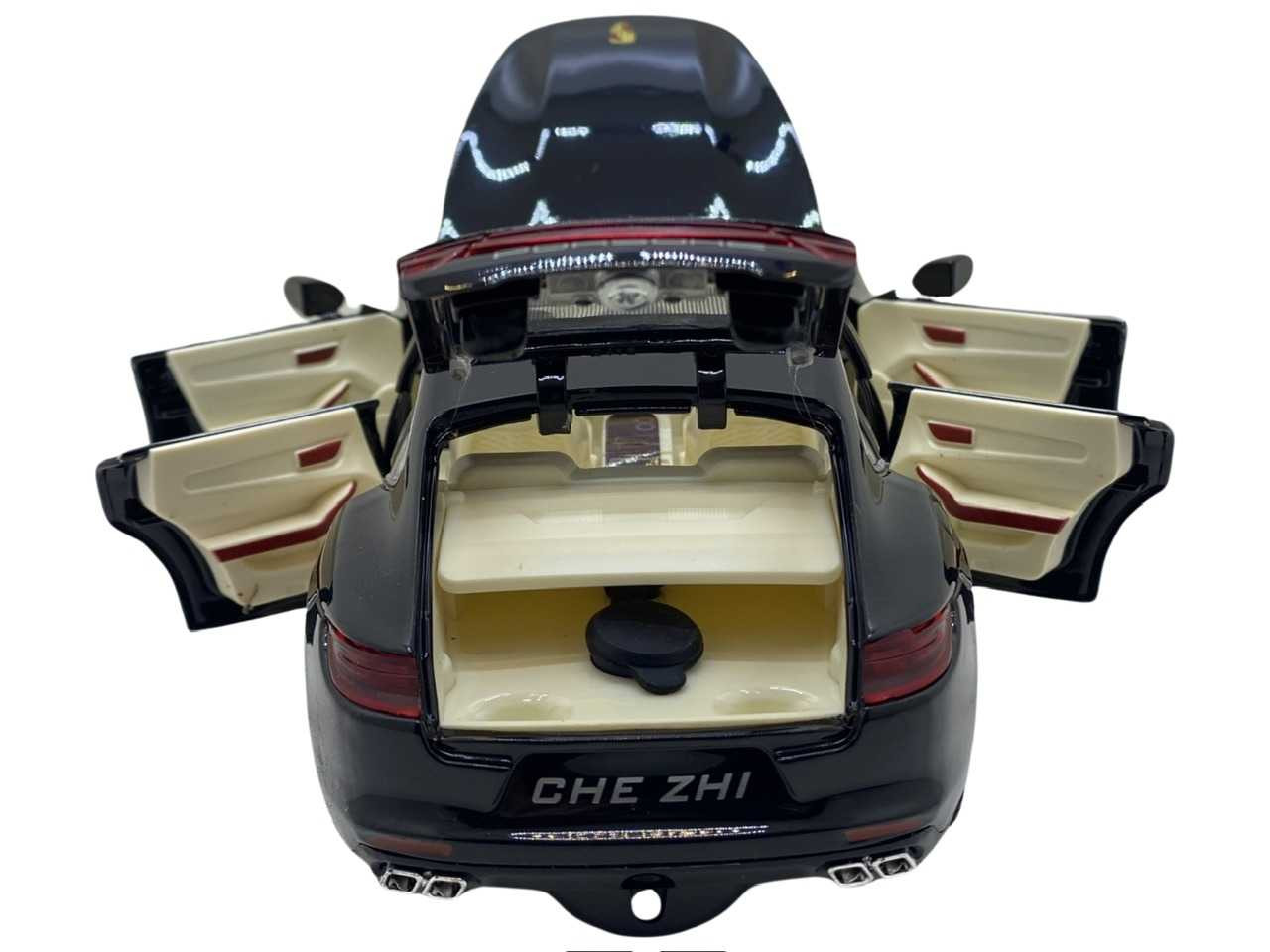 Macheta replica Porsche cu fum negru scara 1:24 ( 20 cm lungime). Masinuta are cutie proprie si are bateriile AAA incluse. Masinuta are sunete de motor care se activeaza atunci cand este usor apasata si merge in față. Cand se deschide usa de la sofer masinuta de asemenea emite sunete. Cea mai importanta caracteristica a acestor masinute este faptul ca deschide toate usile si capotele fata-spate. Masina contine un recipient unde se poate turna apa, ca sa scoata fum. Finisajele de asemenea sunt de calitate foarte bune cu detalii si la interior. Recomandata copiilor cu varsta peste 3 ani.