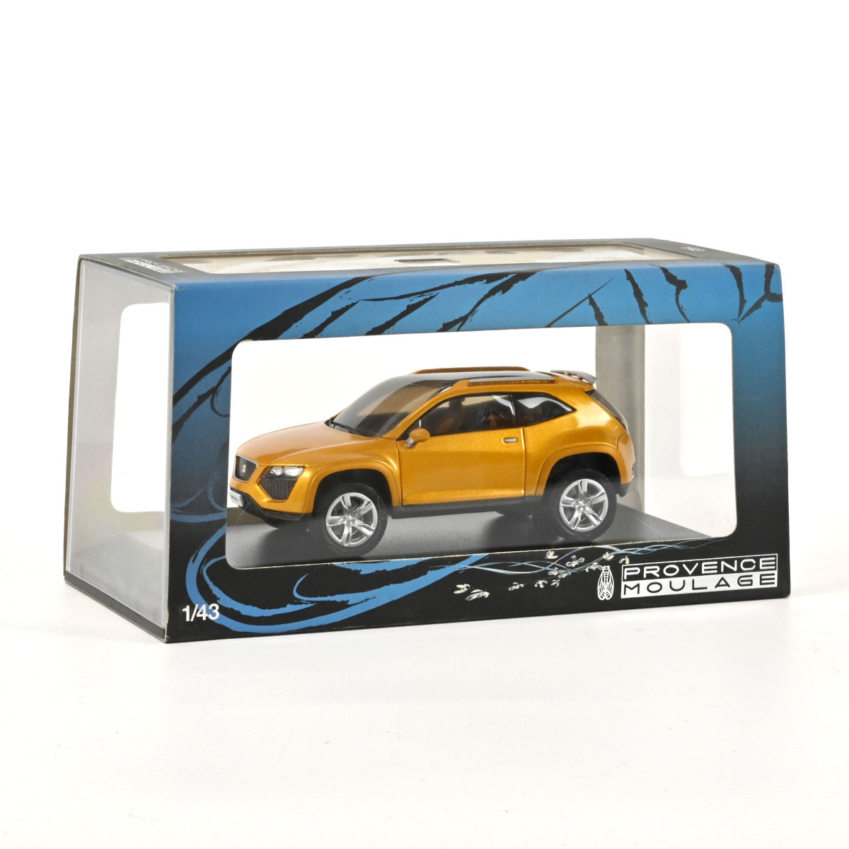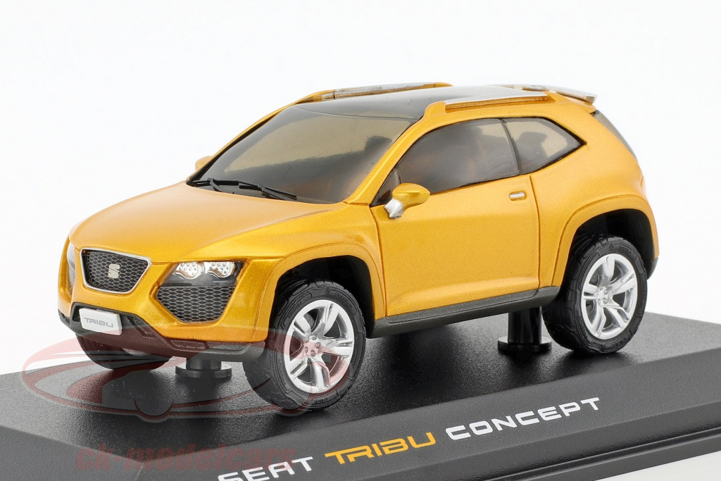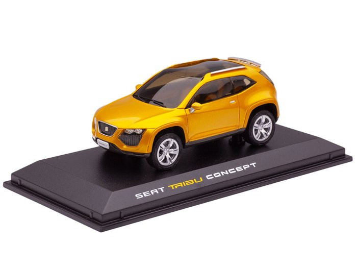 Caroseria metalica are un finisaj auriu stralucitor, accentuand designul futurist si sportiv al vehiculului. Jantele sunt realizate cu atentie la detalii, iar interiorul este vizibil prin geamurile transparente, completand realismul machetei. Modelul este expus pe un suport elegant, cu inscriptia SEAT Tribu Concept ideal pentru colectionari si display.