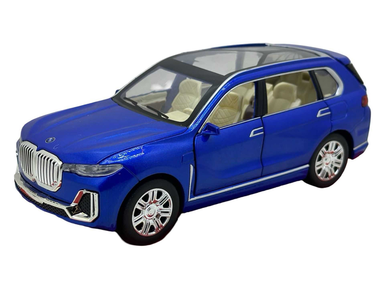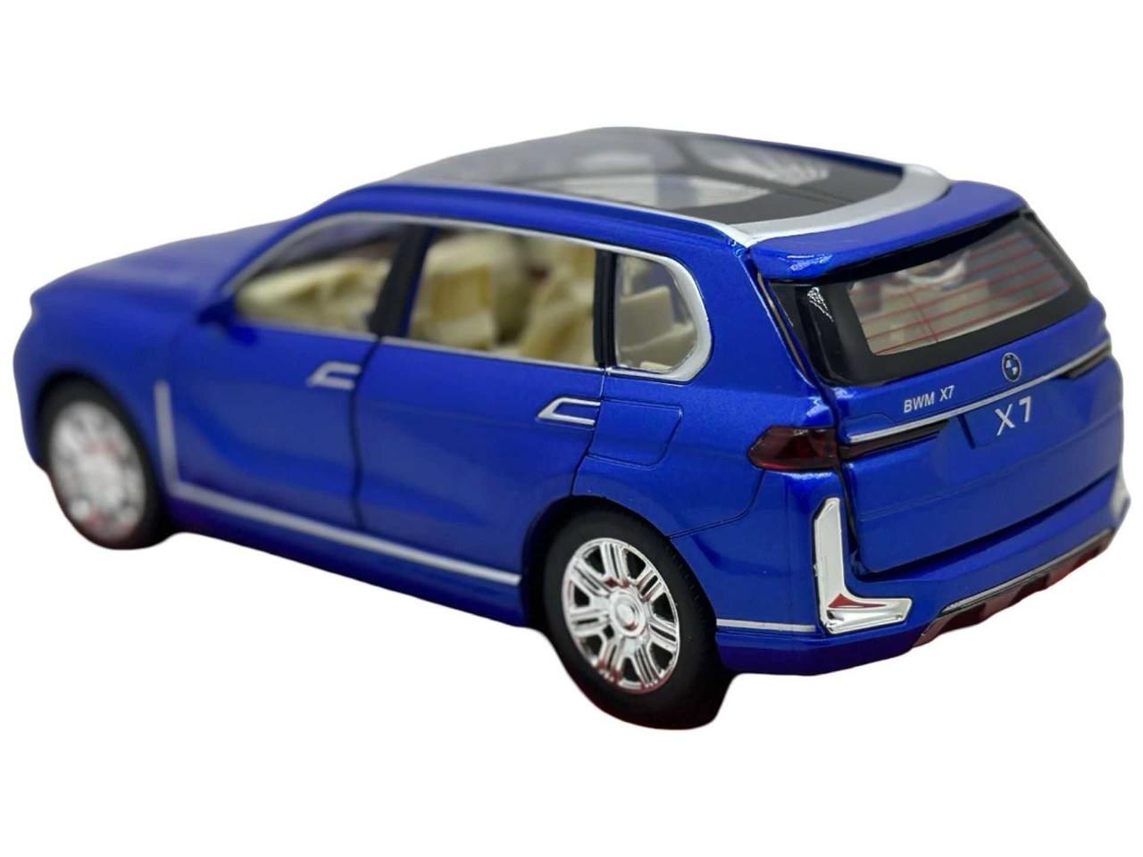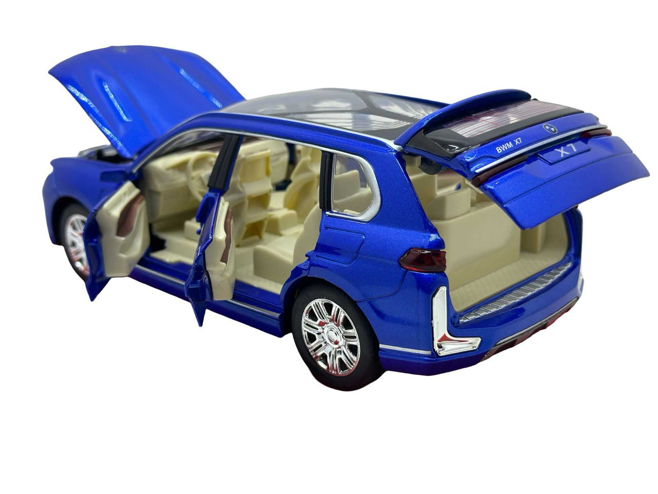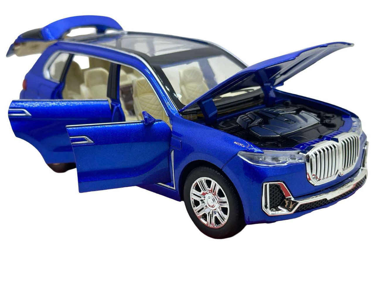 Replica SUV-ului de lux BMW X7, vopsit in albastru metalizat. Modelul are usi si capota functionale, interior bej detaliat si roti mobile. Include lumini si efecte sonore realiste.