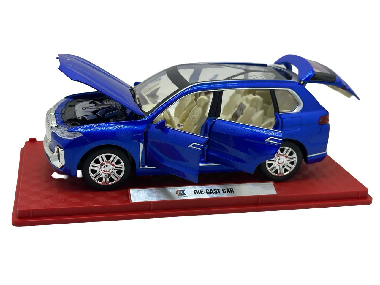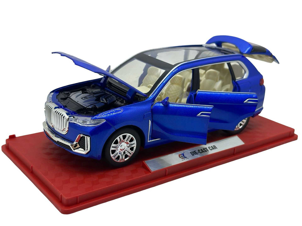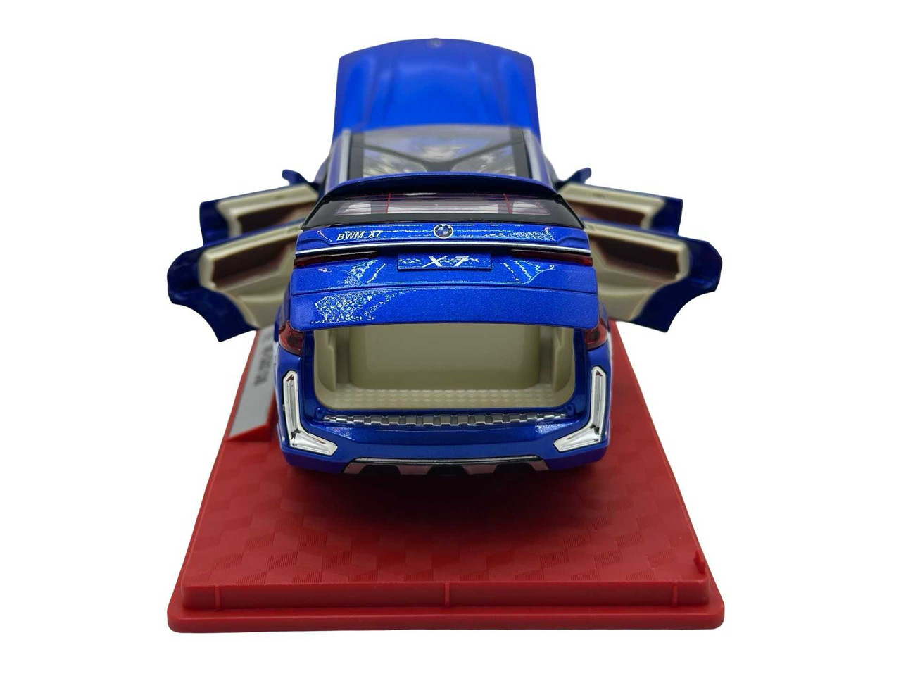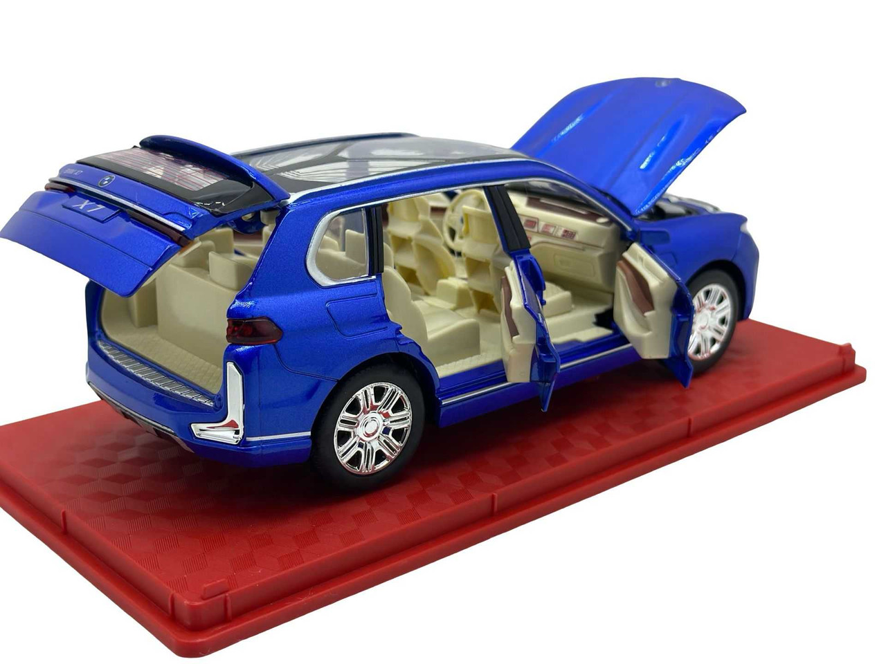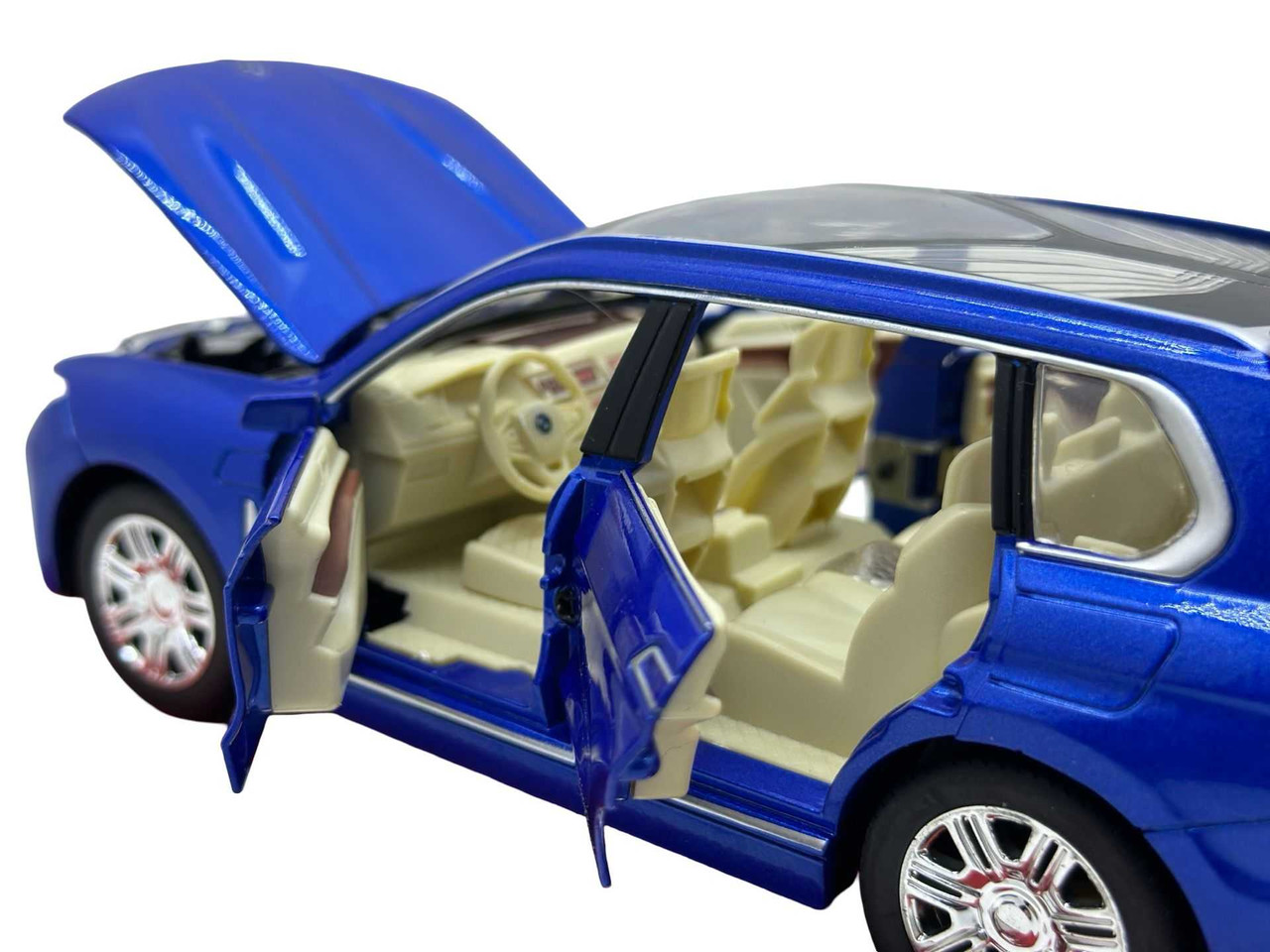 Replica SUV-ului de lux BMW X7, vopsit in albastru metalizat. Modelul are usi si capota functionale, interior bej detaliat si roti mobile. Include lumini si efecte sonore realiste.