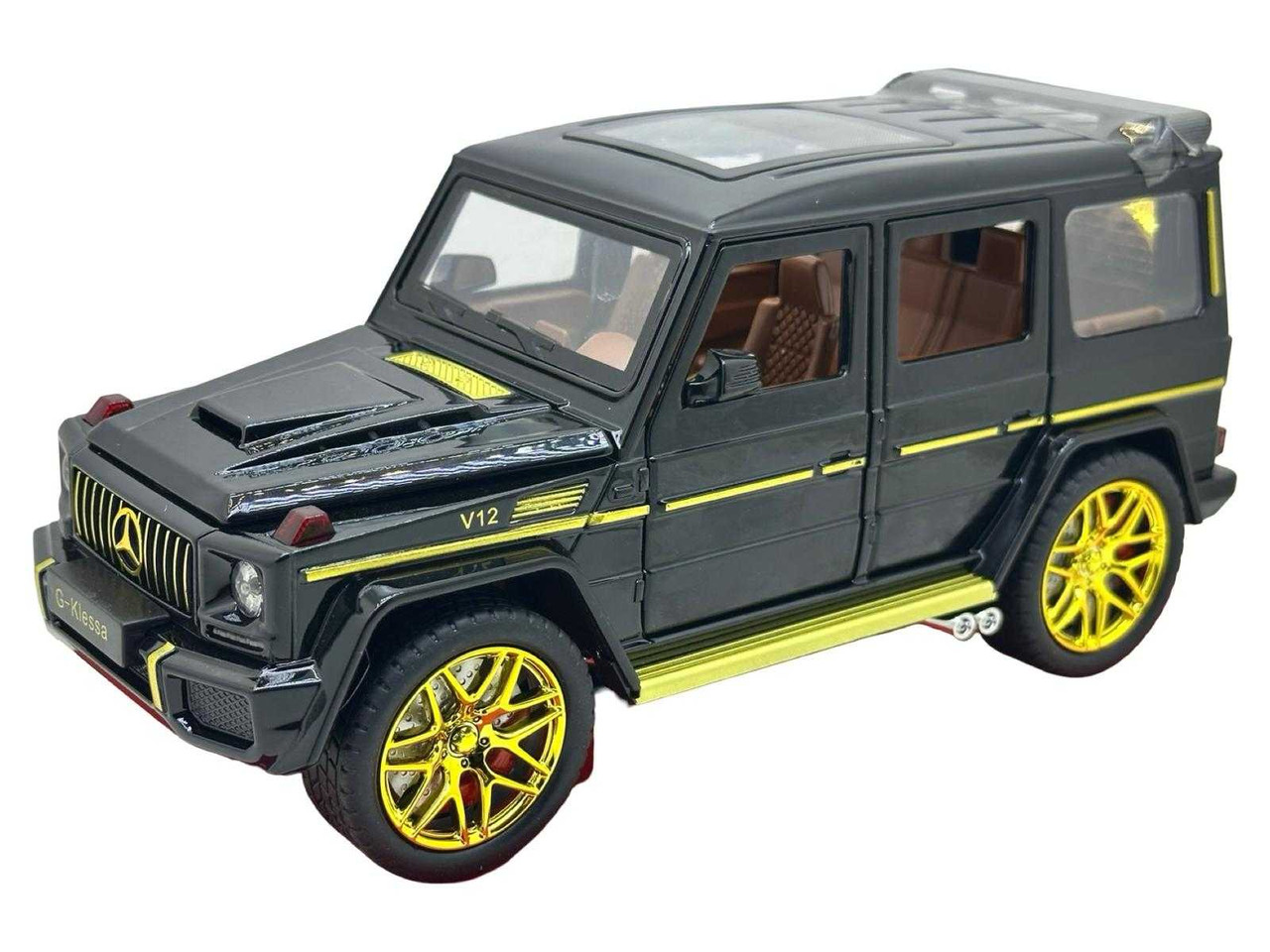 Model metalic la scara 1:24 cu detalii sport si accente aurii, inspirat de un SUV de lux V12. Cu roti aurii, interior maro si usi functionale, acest model aduce stil si putere in orice colectie.