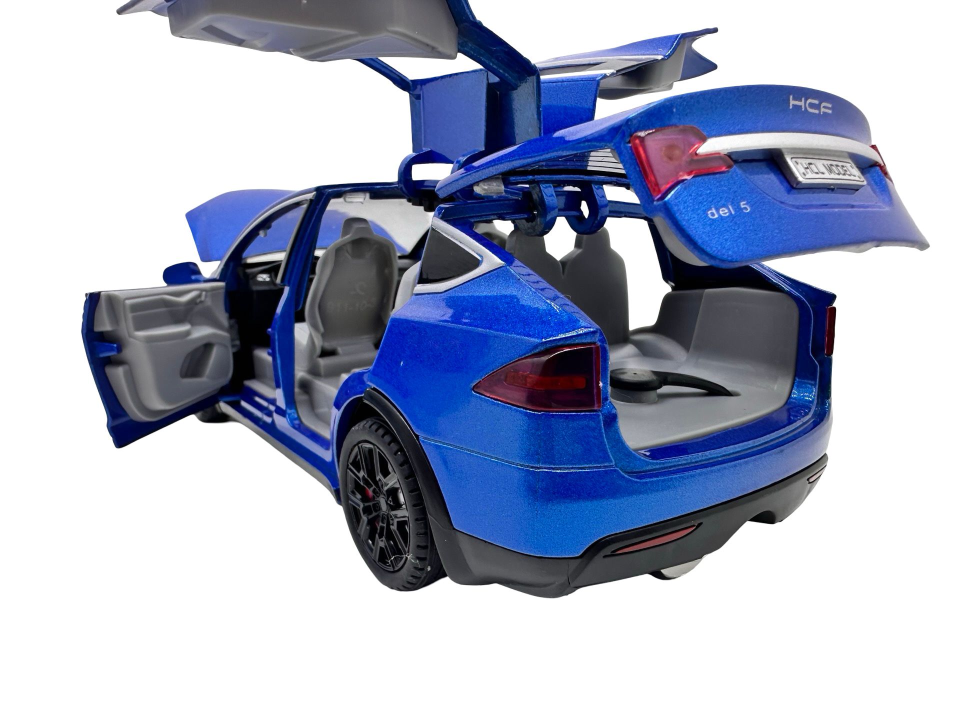 Macheta Tesla Model X albastru 1:22 replica metal cu radiocomanda, fum, lumini si usi functionale