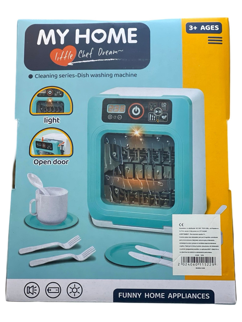 Masina de spalat vase de jucarie „My Home Little Chef Dream” este un aparat interactiv conceput pentru copiii de peste 3 ani, perfect pentru a-i introduce în activitățile de gospodărie. Aceasta are un design realist cu panou de comenzi, ușă care se deschide și funcții de lumini și sunete, oferind o experiență captivantă. Pachetul include tacâmuri și vase de jucarie pentru un joc complet. Încurajează creativitatea și dezvoltarea abilităților motorii fine ale copiilor. O jucărie din seria de electrocasnice amuzante care îmbină distracția cu învățarea.