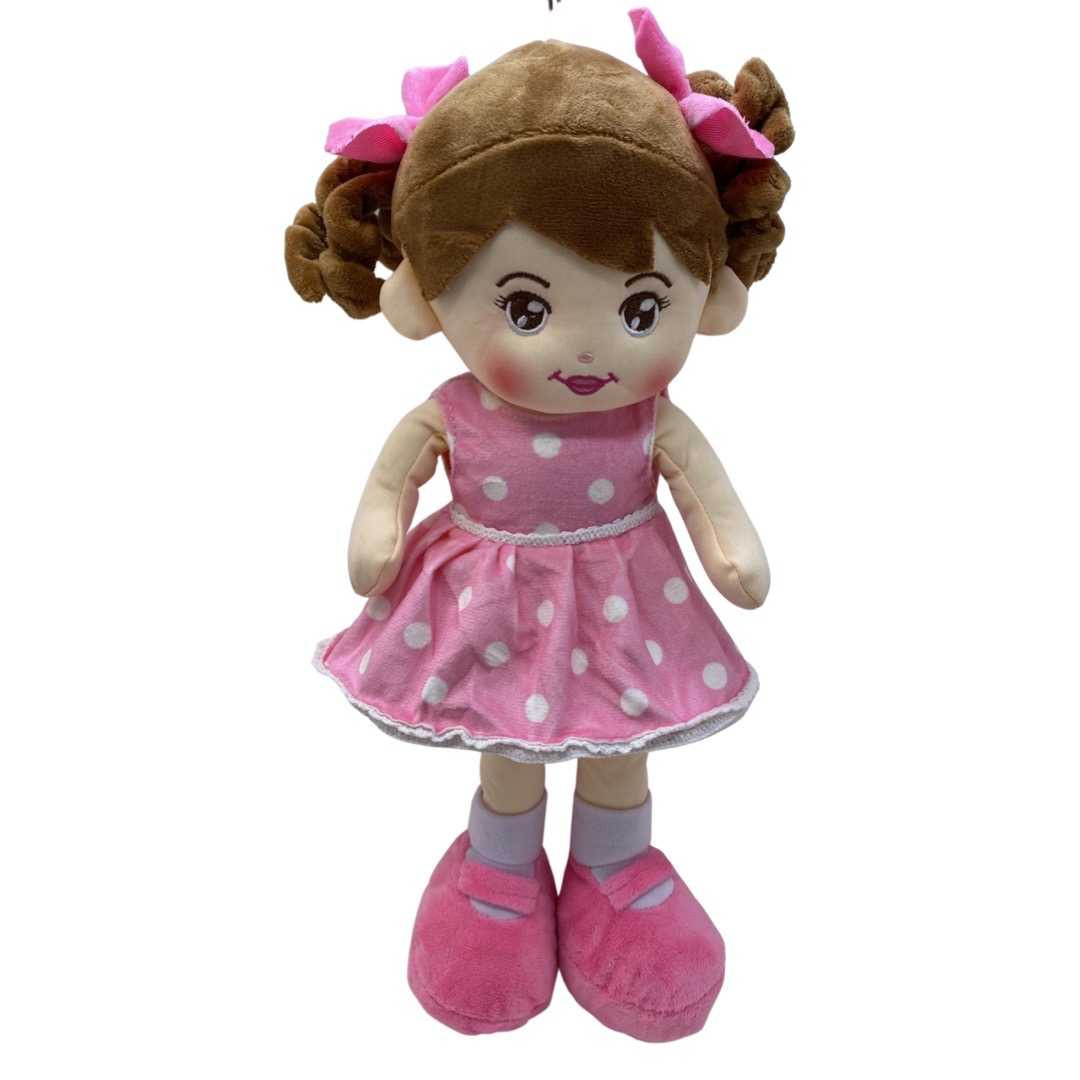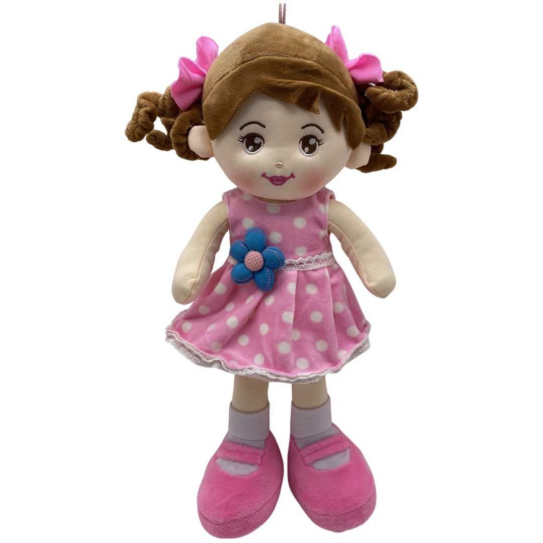 Papusica roz din plus canta Aram sam sam sau o alta melodie in limba romana. Are lungimea de 40 cm si este umpluta cu puf siliconat. La interior veti gasi un aparat care canta melodia Aram sam sam atunci cand este apasat. Functioneaza cu 3 baterii AG 13 incluse. Acestea se pot schimba atunci cand se consuma.
