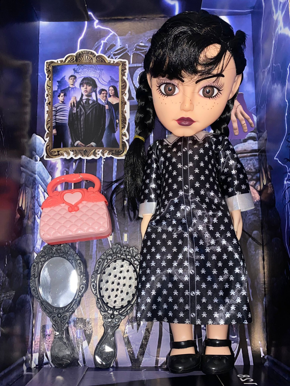 Papusa Wednesday Addams Family muzicala 34 cm in rochie cu fantome. Papusica functioneaza cu 3 baterii tip AG13 care sunt incluse. Pentru prima pornire este necesar sa se scoata siguranta de la baterii. Este realizata din Material plastic si este imbracata in haine din material textil. Papusica are ochii mari din plastic si imita foarte mult personajul din film. Mainile si picioarele sunt articulate. Dimensiune papusa 34 cm. Este recomandat copiilor peste 3 ani.