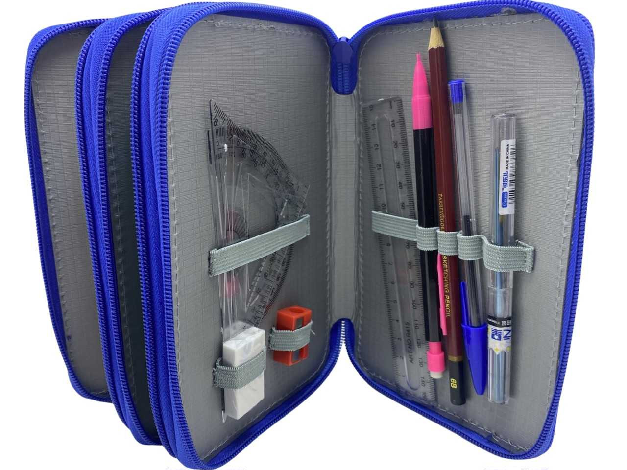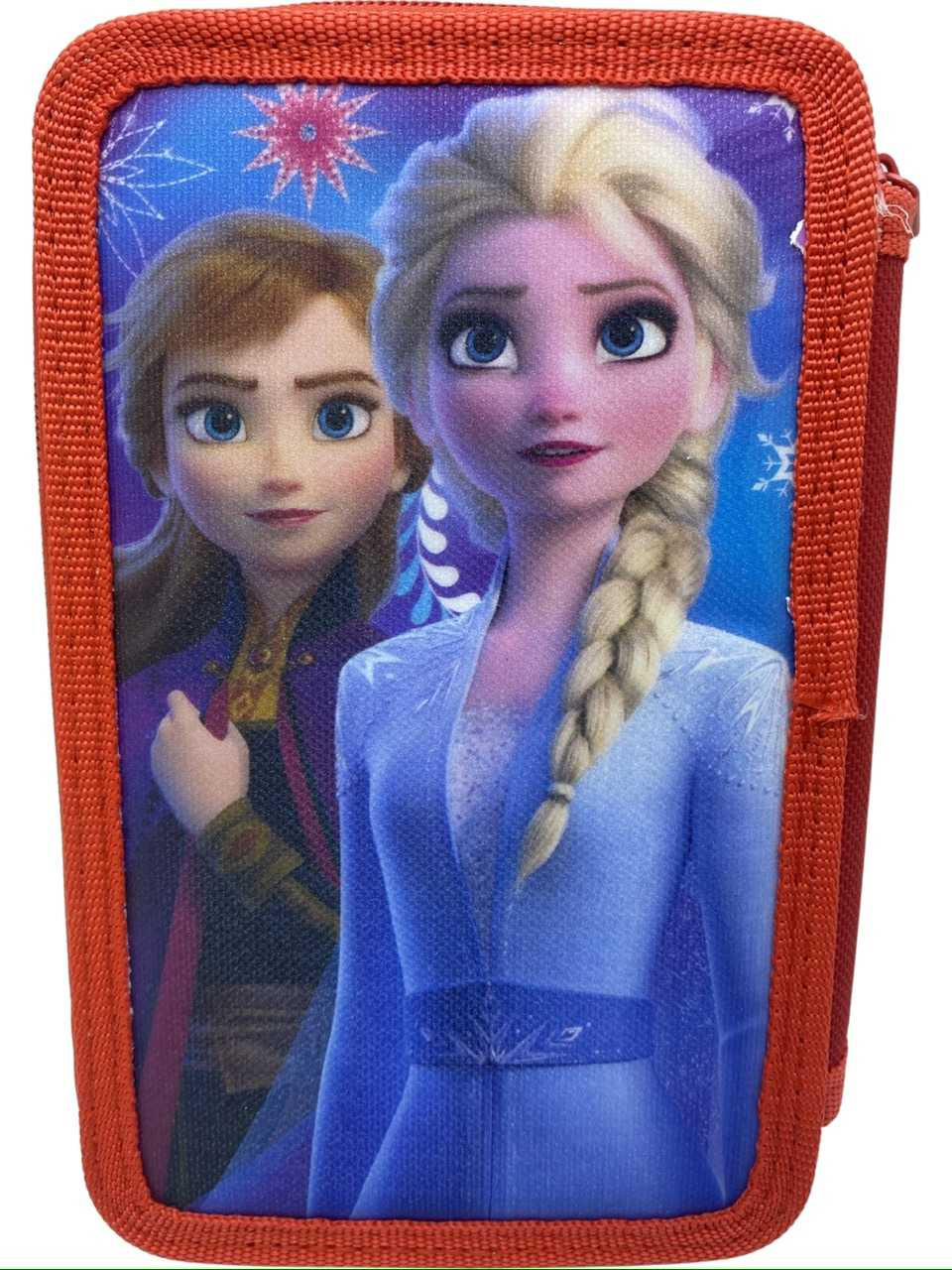 Penar Frozen 3 compartimente echipat complet. La interior gasiti creioane colorate , carioci, pixuri, compas si mini rigle. Este din material textil iar compartimentele se inchid cu fermoar. Este recomandat copiilor cu varsta peste 3 ani.
