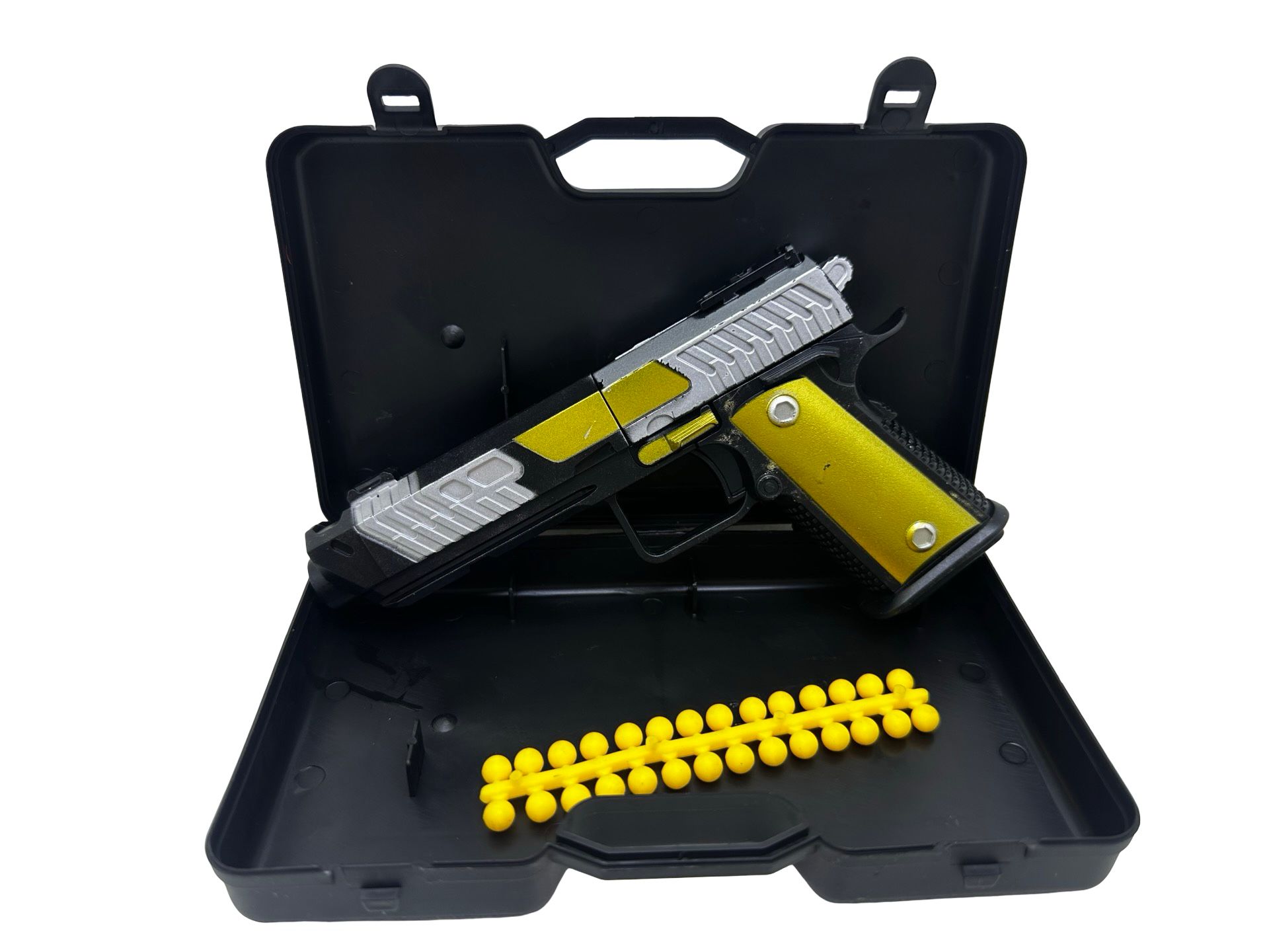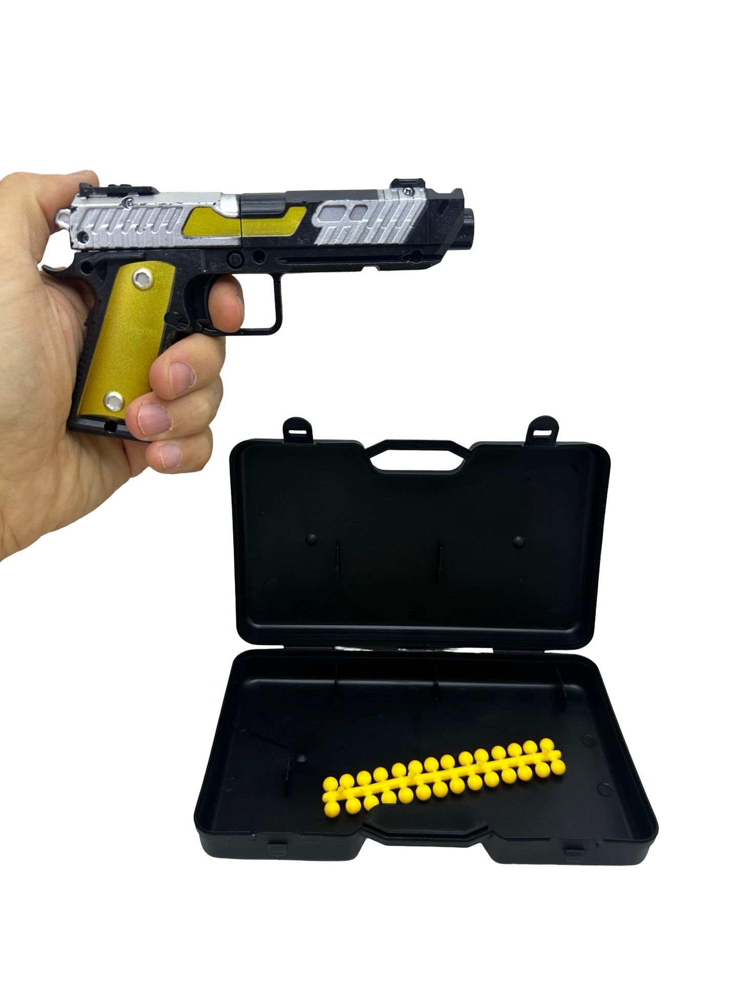 Acest pistol de jucarie este realizat din aliaj metalic si plastic rezistent, oferind un design realist si o experienta de joaca interactiva. Pachetul include pistolul, bilele galbene de plastic si cutia rigida pentru transport si depozitare.