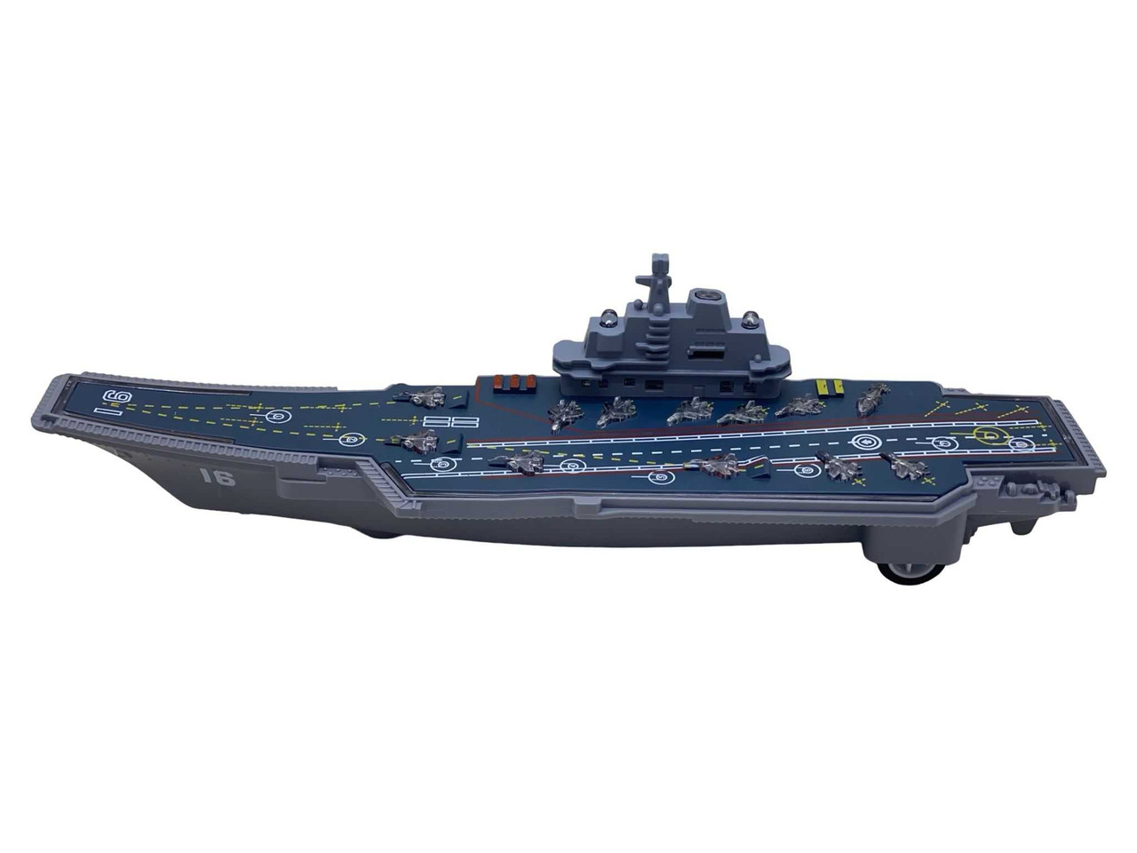 Descriere: Acest portavion din aliaj este o jucărie interactivă perfectă pentru copiii cu vârsta de peste 3 ani. Dotat cu lumini și sunete realiste, oferă o experiență captivantă de joc, în timp ce vehiculul se mișcă prin acționare inerțială. Pe punte, sunt amplasate miniaturi detaliate de avioane de luptă, care completează imaginea unui portavion adevărat. Un cadou ideal pentru micii pasionați de nave și avioane, această jucărie combină distracția cu dezvoltarea imaginației.Dimensiune 24 cm. Este recomandat copiilor peste 3 ani.