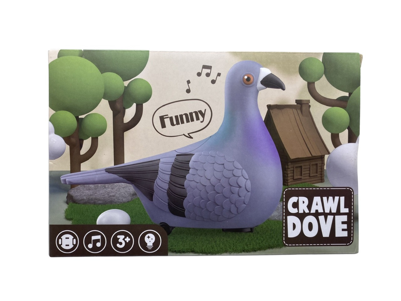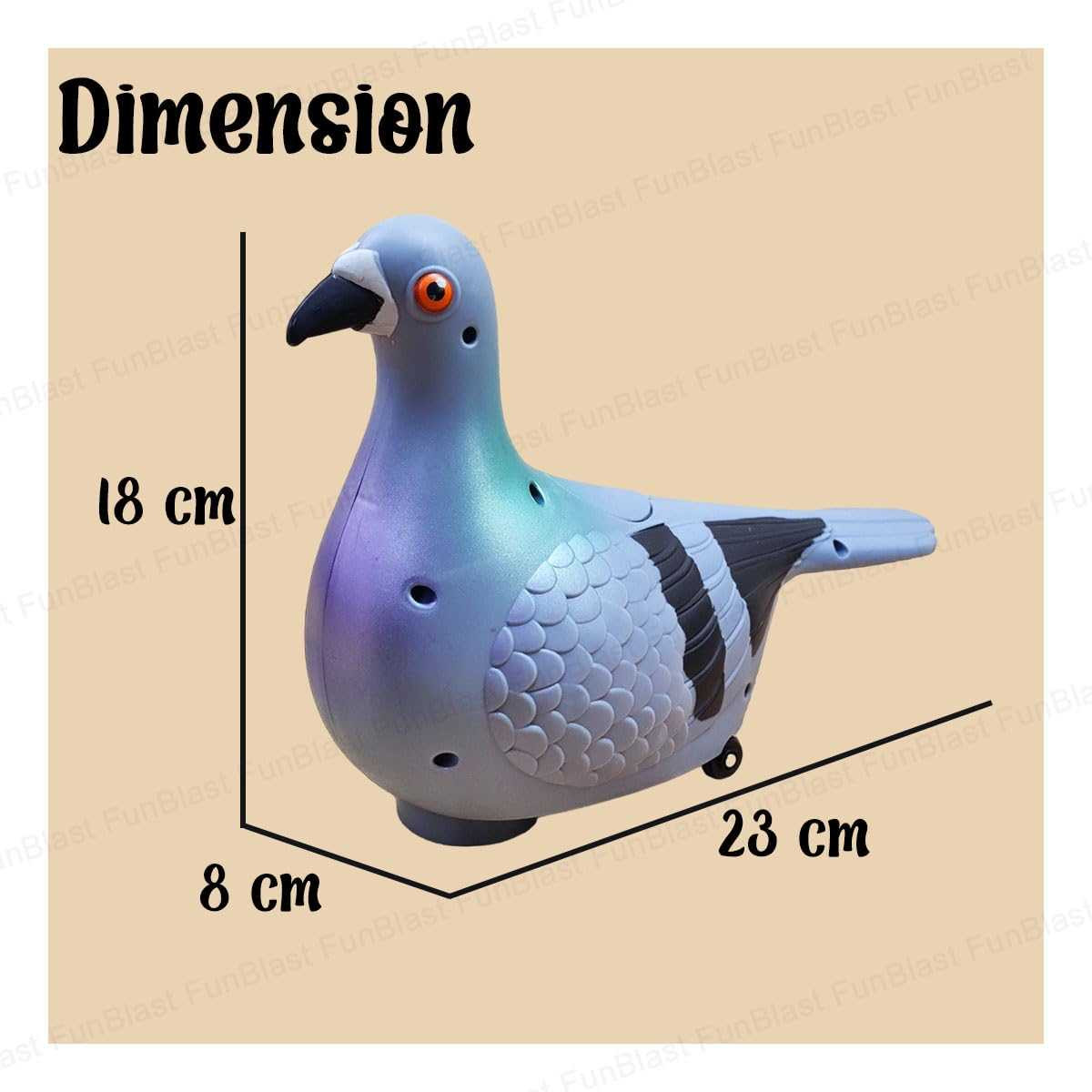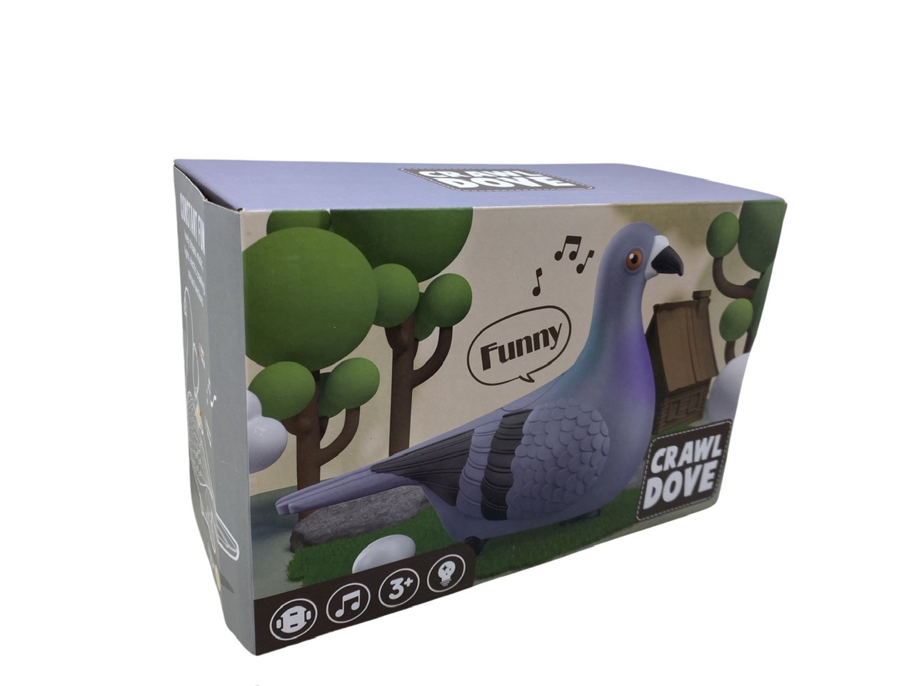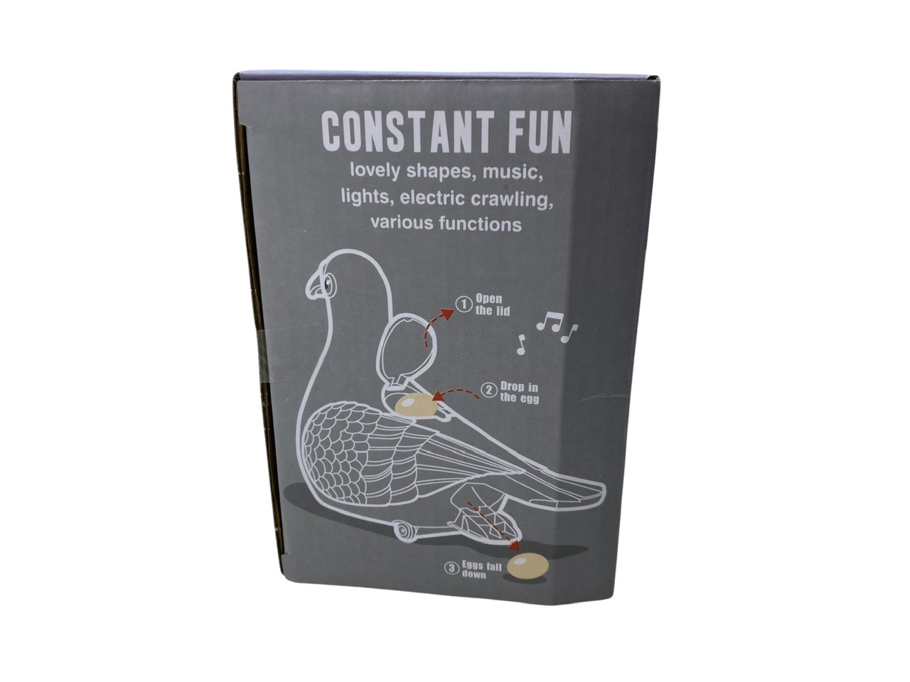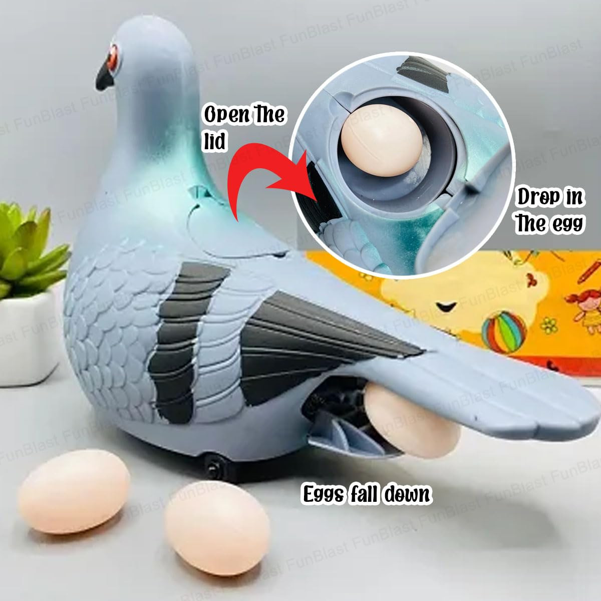 Porumbel de jucarie care face oua. Functioneaza cu 3 baterii AA care nu sunt incluse. Cand este pornita aceasta canta si se deplaseaza cu ajutorul rotitelor. Se opreste din loc in loc si face cate un ou.