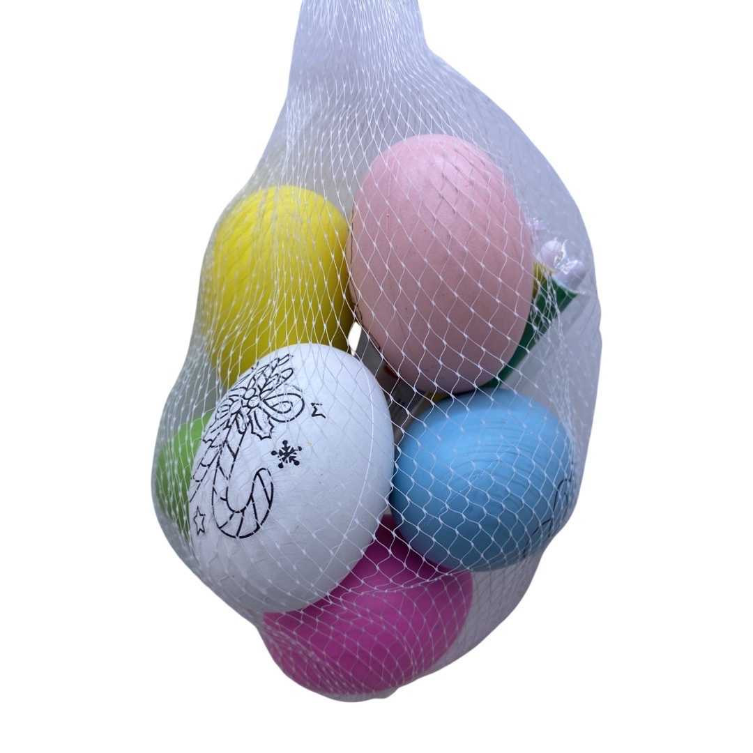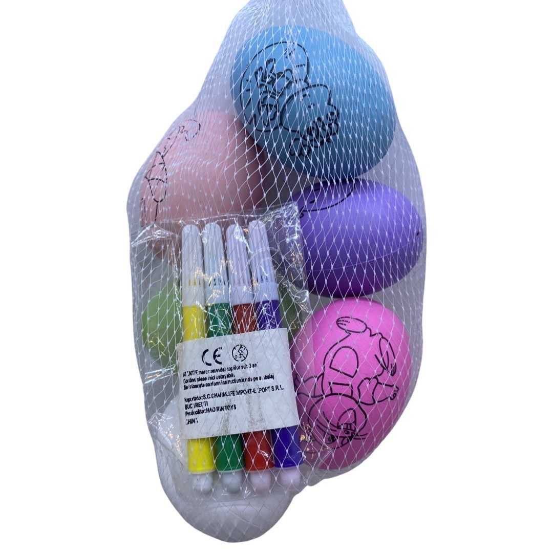 Set 6 oua de colorat . Ouale sunt din polistiren in 6 culori diferite . Pe fiecare sunt imprimate desene ce urmeaza a fi coloratebcu cele 4 carioci incluse in set. Este recomandat copiilor peste trei ani.