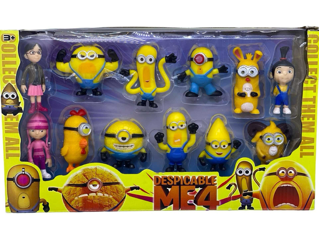 Acest set de jucarii contine 12 figurine inspirate din universul „Despicable Me 4”, inclusiv minioni in forme haioase si neobisnuite, personaje costumate si personaje umane indragite. Designul colorat si expresiile amuzante ale figurinelor fac din acest set un cadou ideal pentru copii sau colectionari. Ambalajul incurajeaza colectionarea tuturor variantelor disponibile. Recomandat pentru varsta de peste 3 ani.