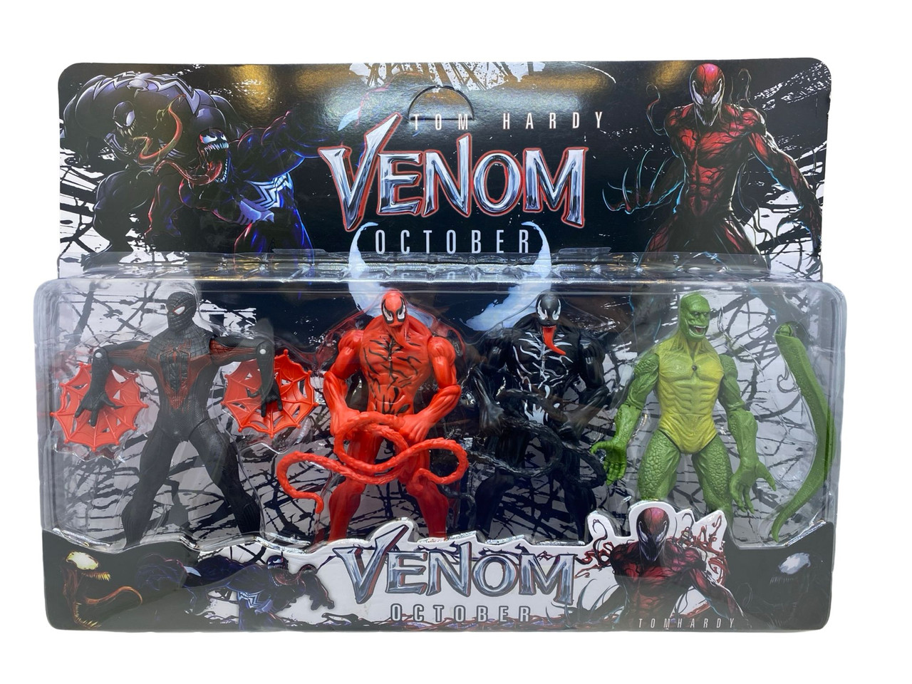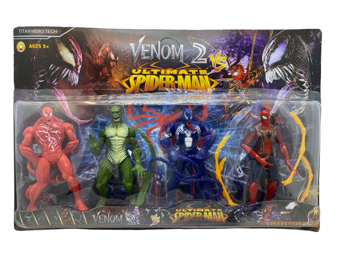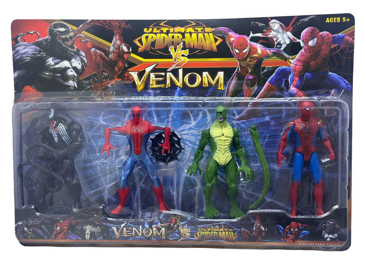 Va prezentam un frumos set de 4 figurine cu celebrele personaje din seria Spiderman si anume: Spiderman cu plase de paianjen, 2 figurine Venom si reptilianul. Aceste 4 figurine sunt realizate din material plastic. Inaltimea figurinelor este de 16 cm. Este recomandat copiilor peste 3 ani.