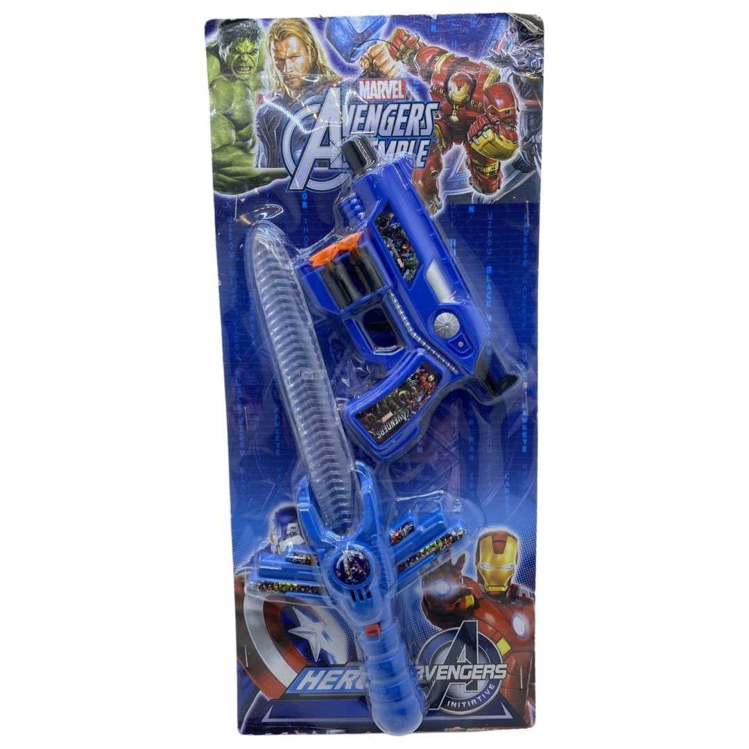 Set pistol cu ventuze si sabie Capitan America. Pistolul foloseste ventuze ca sa traga iar sabia are lumini cu led. Lungimea sabiei 23 cm. Pistolul este de dimensiunea potrivita pentru mana unui copil de 5-6 ani.