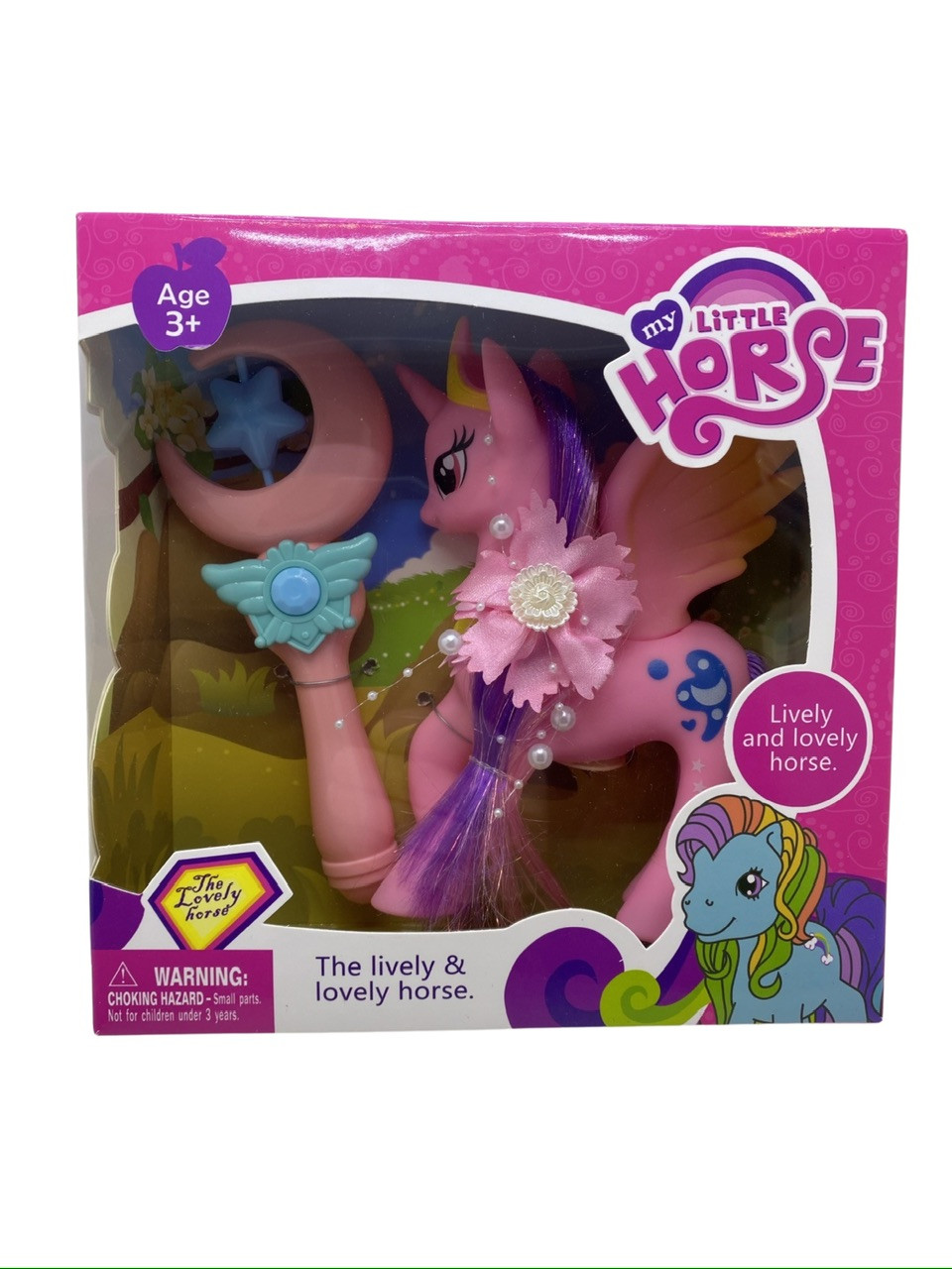 Set ponei cu bagheta sunet si lumina. Functioneaza cu baterii AG 13 care sunt incluse in ei. Piciorusele sunt fixe iar in cutie este inclusa o bagheta. Material plastic. Este recomandat copiilor peste 3 ani.
